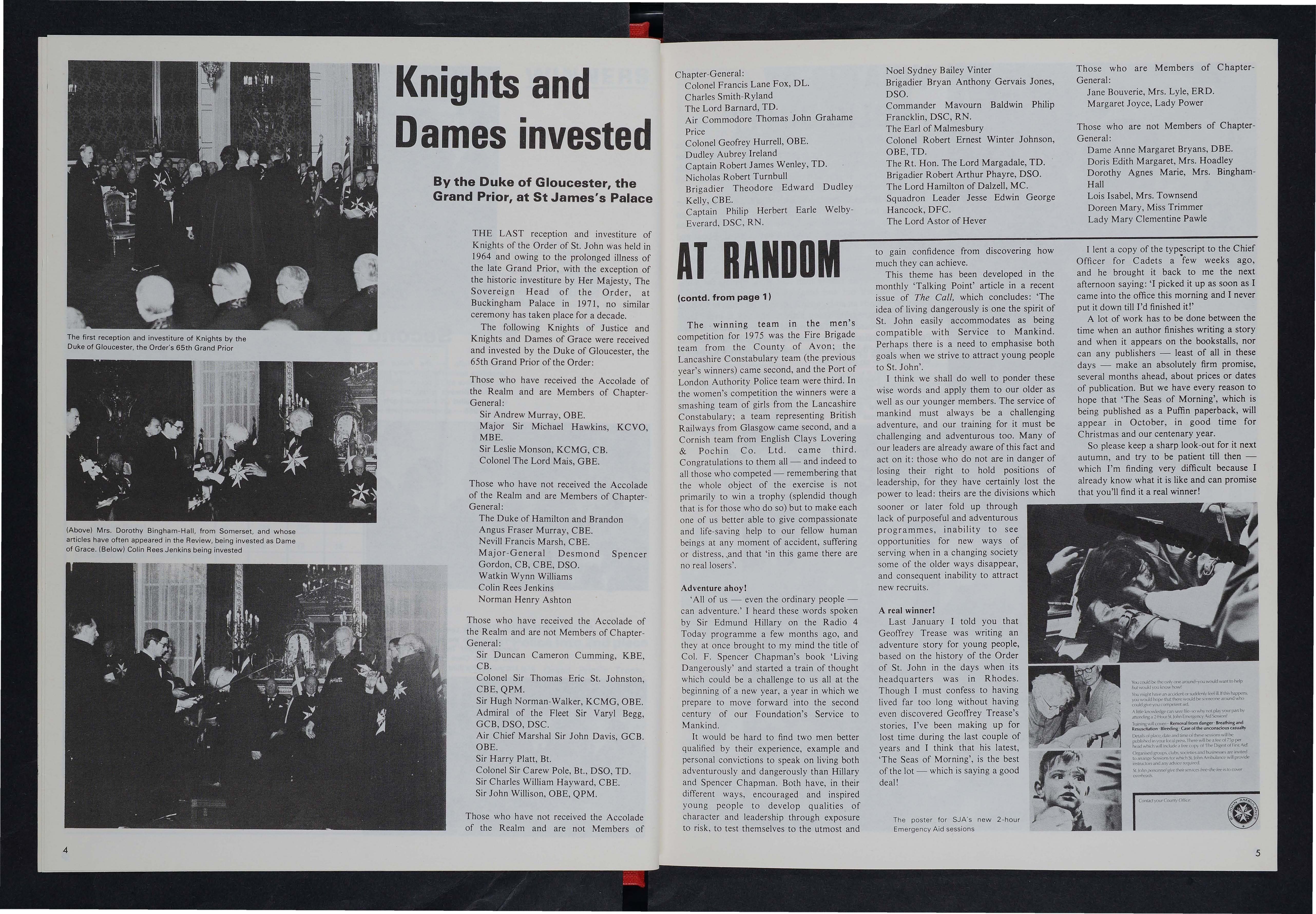 THE LAST reception and investiture of Knights of the Order of St. John was held in 1964 and owing to the prolonged illness of the late Grand Prior, with the exception of the historic investiture by Her Majesty The Sovereign Head of the Order at Buckingham Palace in 1971, no similar ceremony has taken place for a decade.