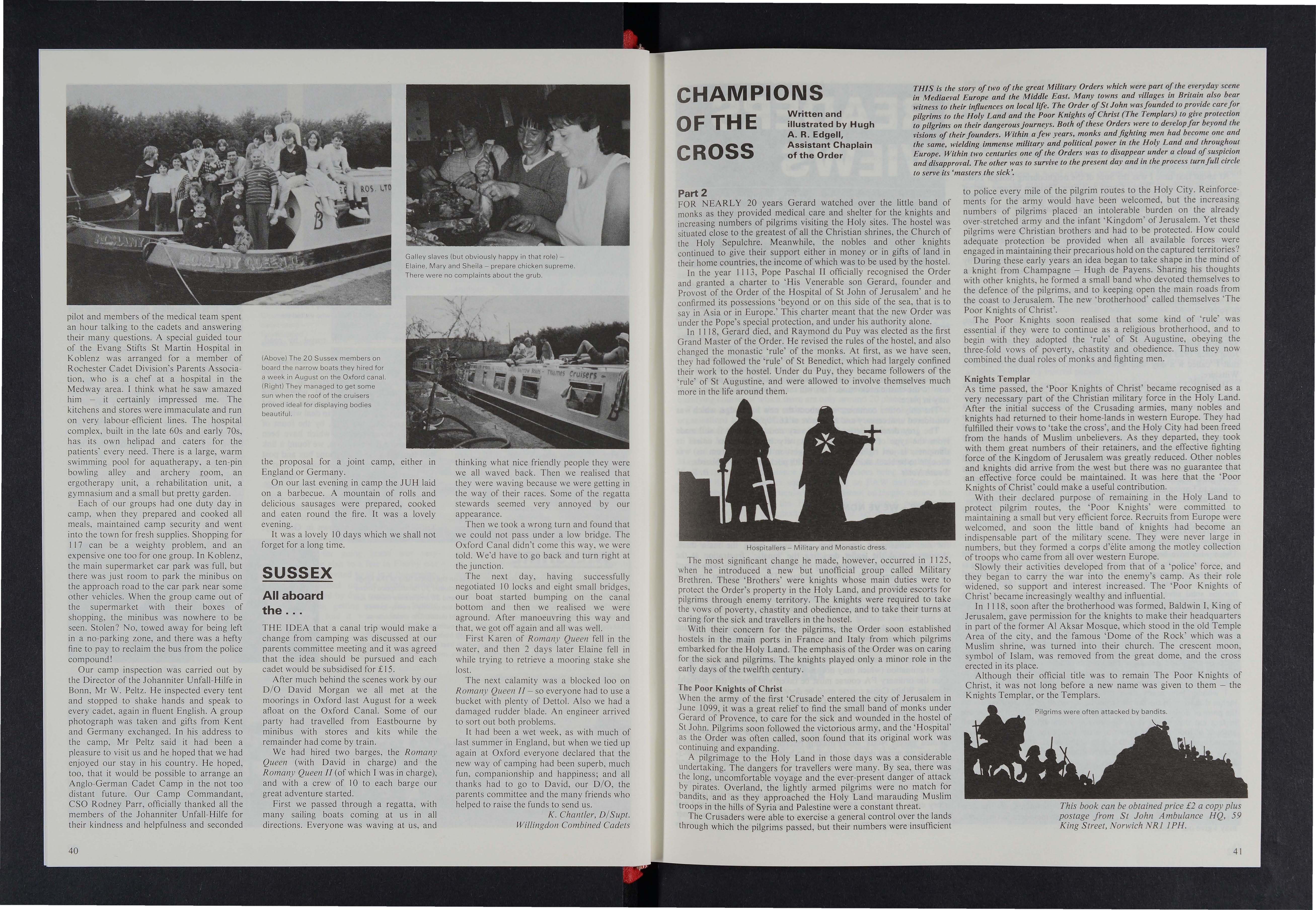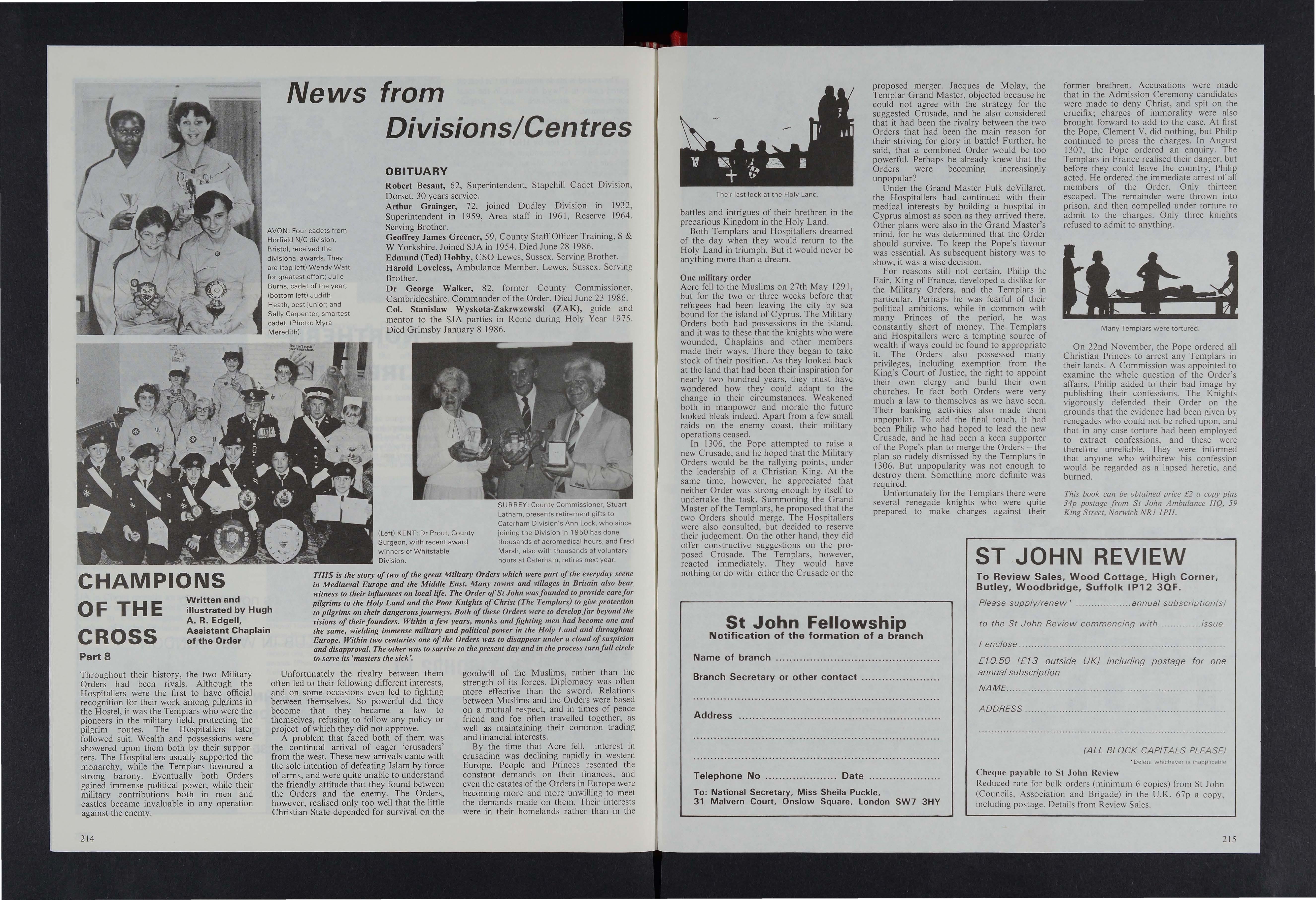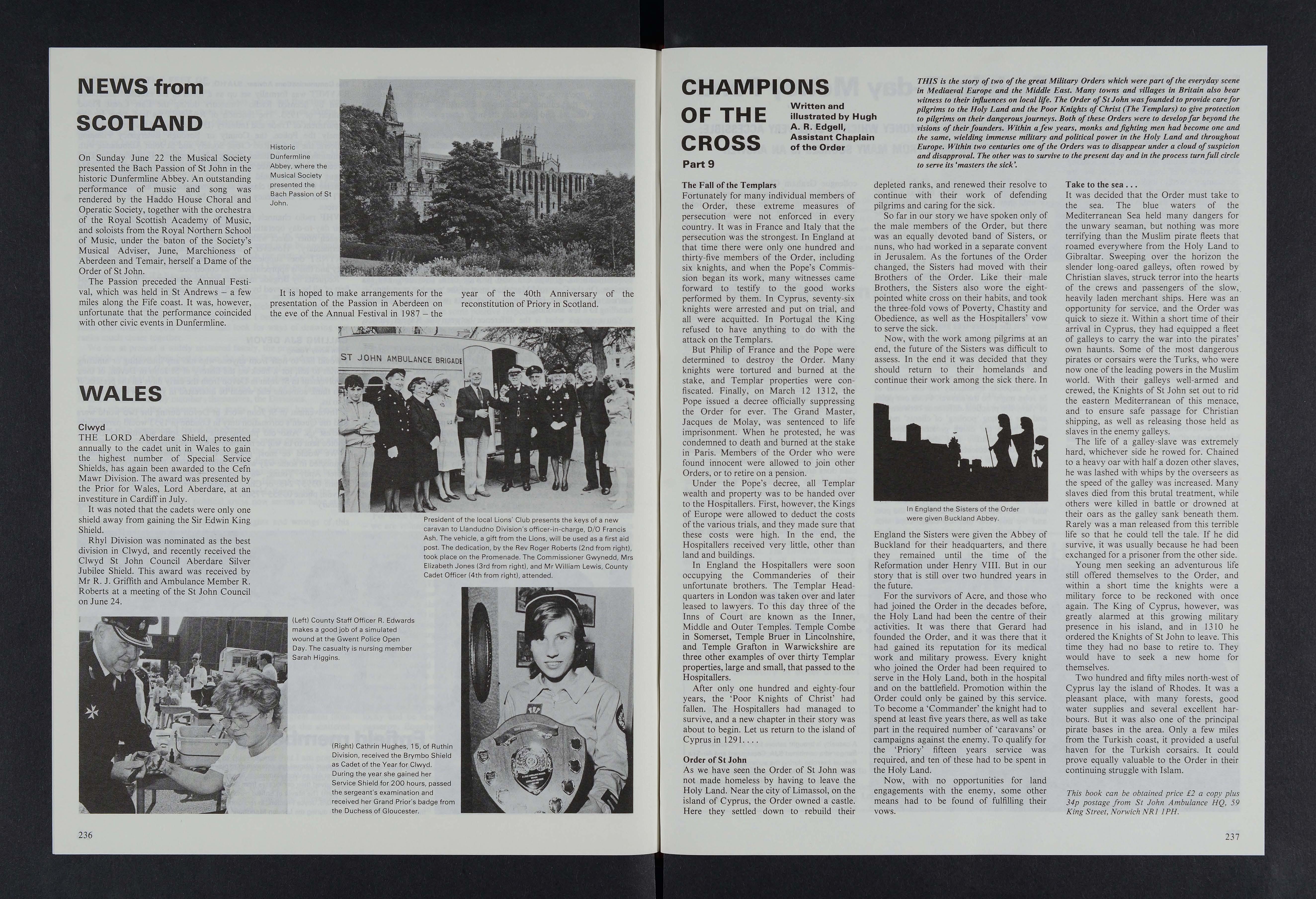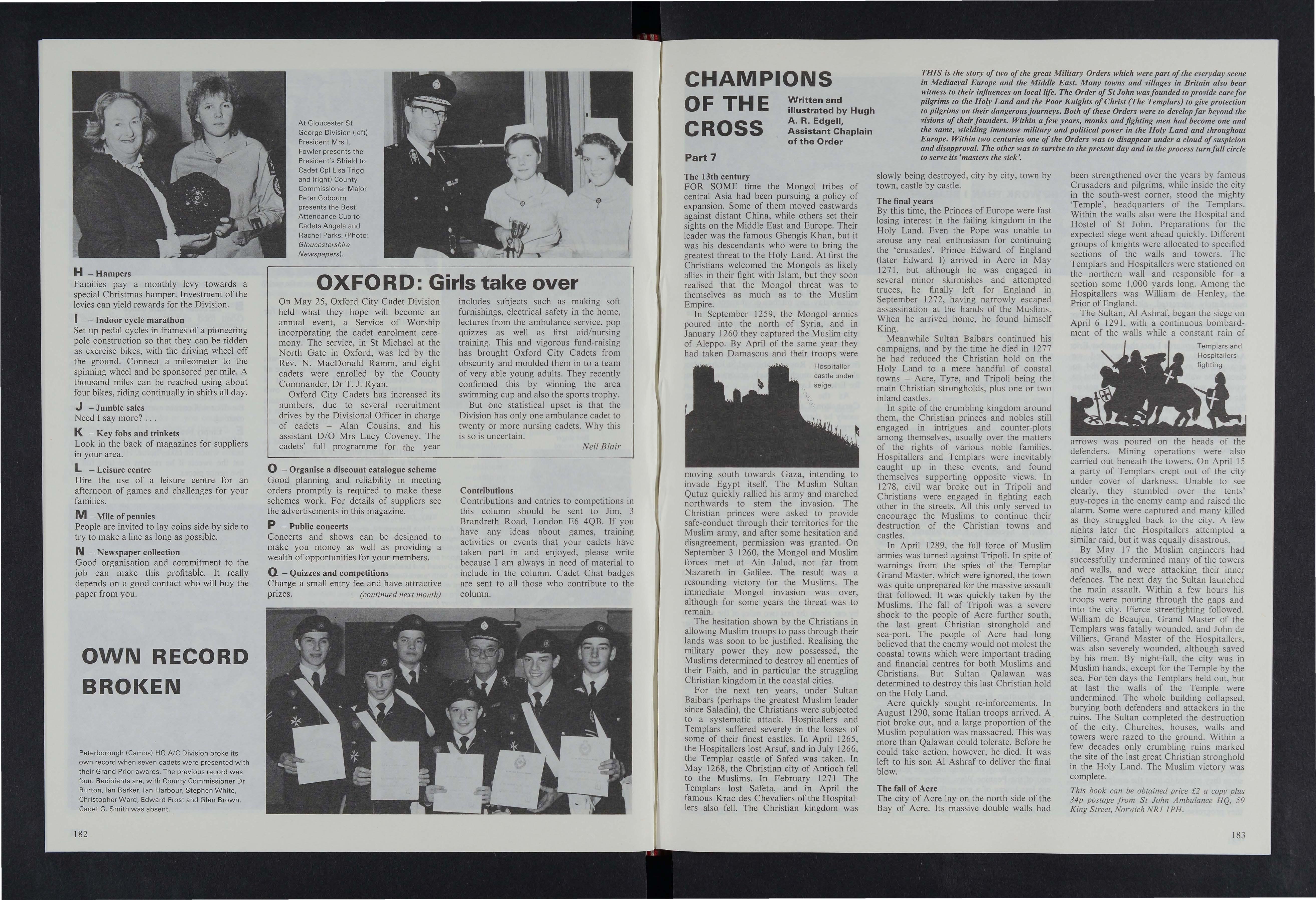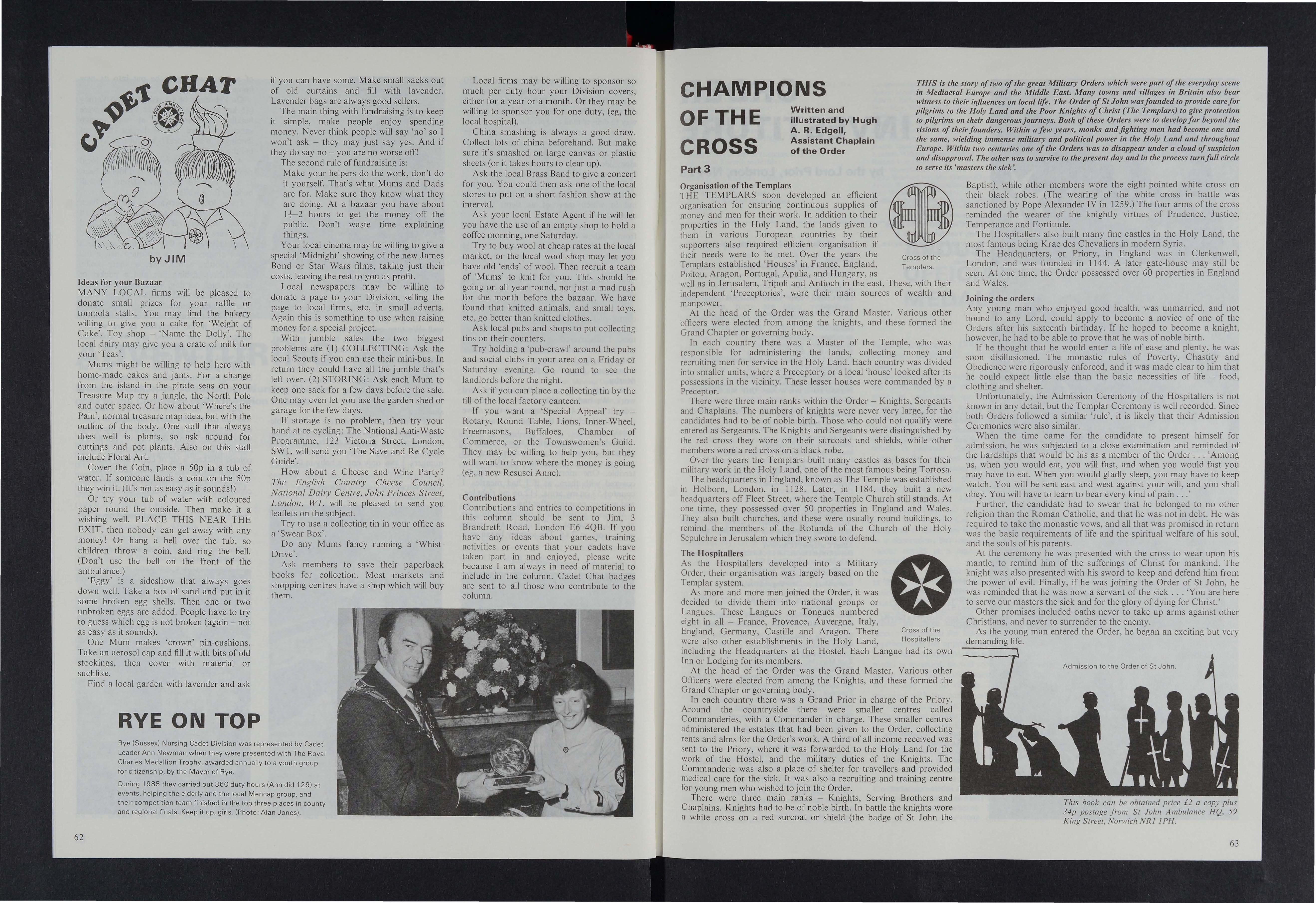 THIS is the story of two of the great Military Orders which were part of the everyday scene in Mediaeval Europe and the Middle East. Many towns and villages in Britain also bear witness to their irifluences on local life. The Order of St John was founded to provide carefor pilgrims to the Holy Land and the Poor Knights of Christ (The Templars) to give protection to pilgrims on their dangerous journeys. Both of these Orders were to develop far beyond the visions of their founders. Within a few years, monks and fighting men had become one and the same, wielding immense military and political power in the Holy Land and throughout Europe. Within two centuries one of the Orders was to disappear under a cloud of suspicion and disapproval The other was to survive to the present day and in the process turn full circle to serve its 'masters the sick'. Part 10