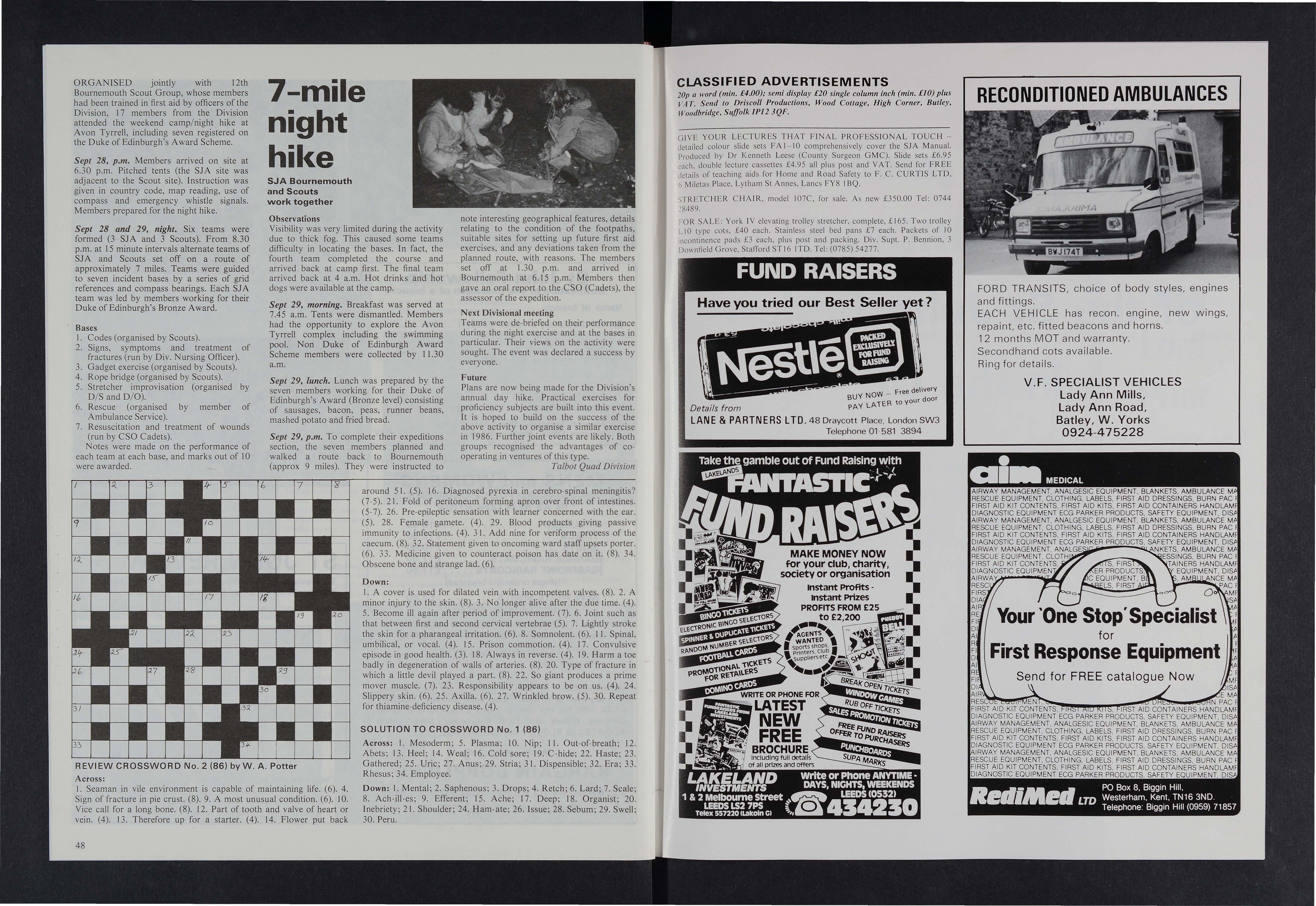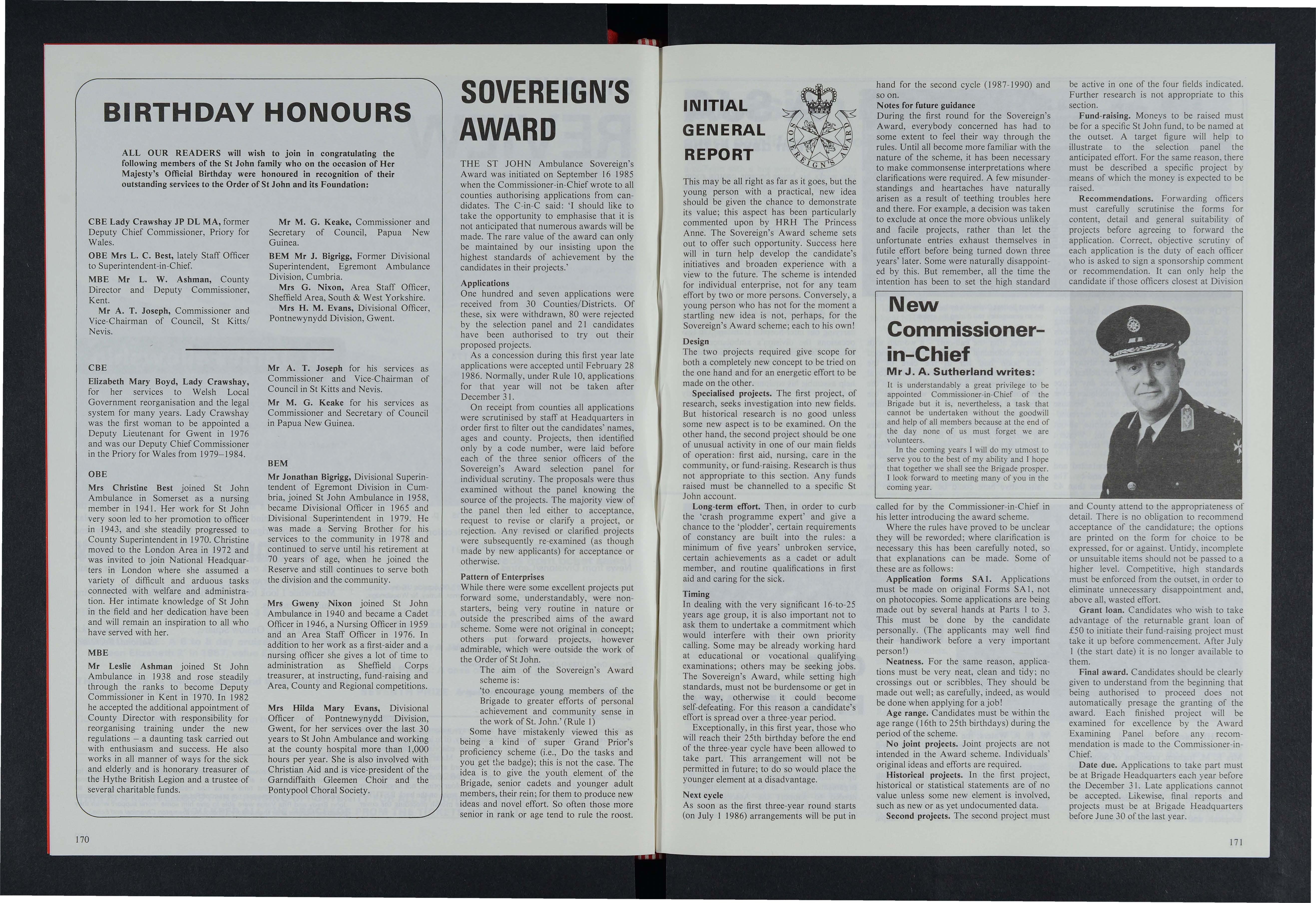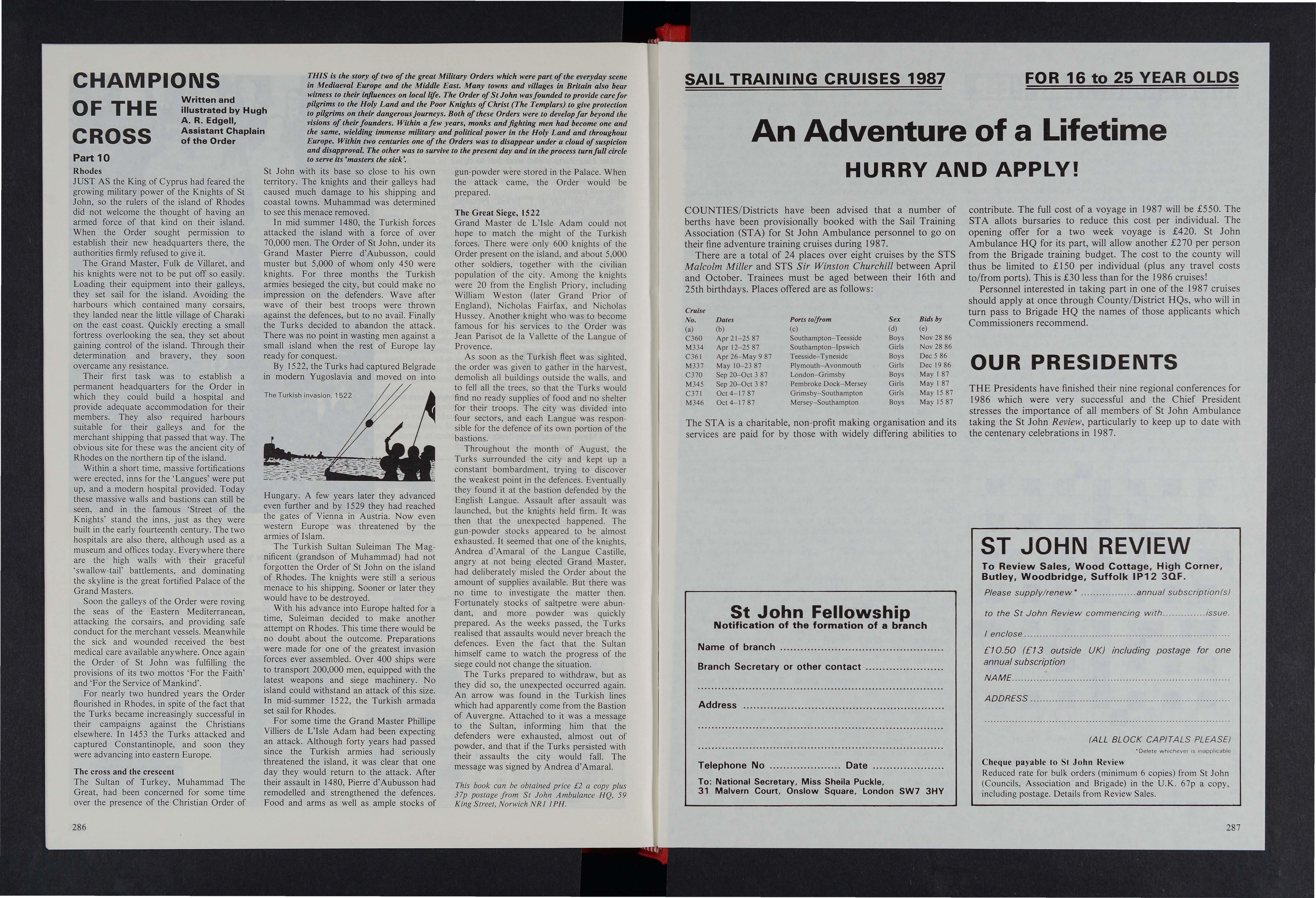COUNTIES / Districts have been advised that a number of berths have been provisionally booked with the Sail Training Association (STA) for St John Ambulance personnel to go on their fine adventure training cruises during 1987. There are a total of 24 places over eight cruises by the STS Malcolm Miller and STS Sir Winston Churchill between April and October. Trainees must be aged between their 16th and 25th birthdays. Places offered are as follows: