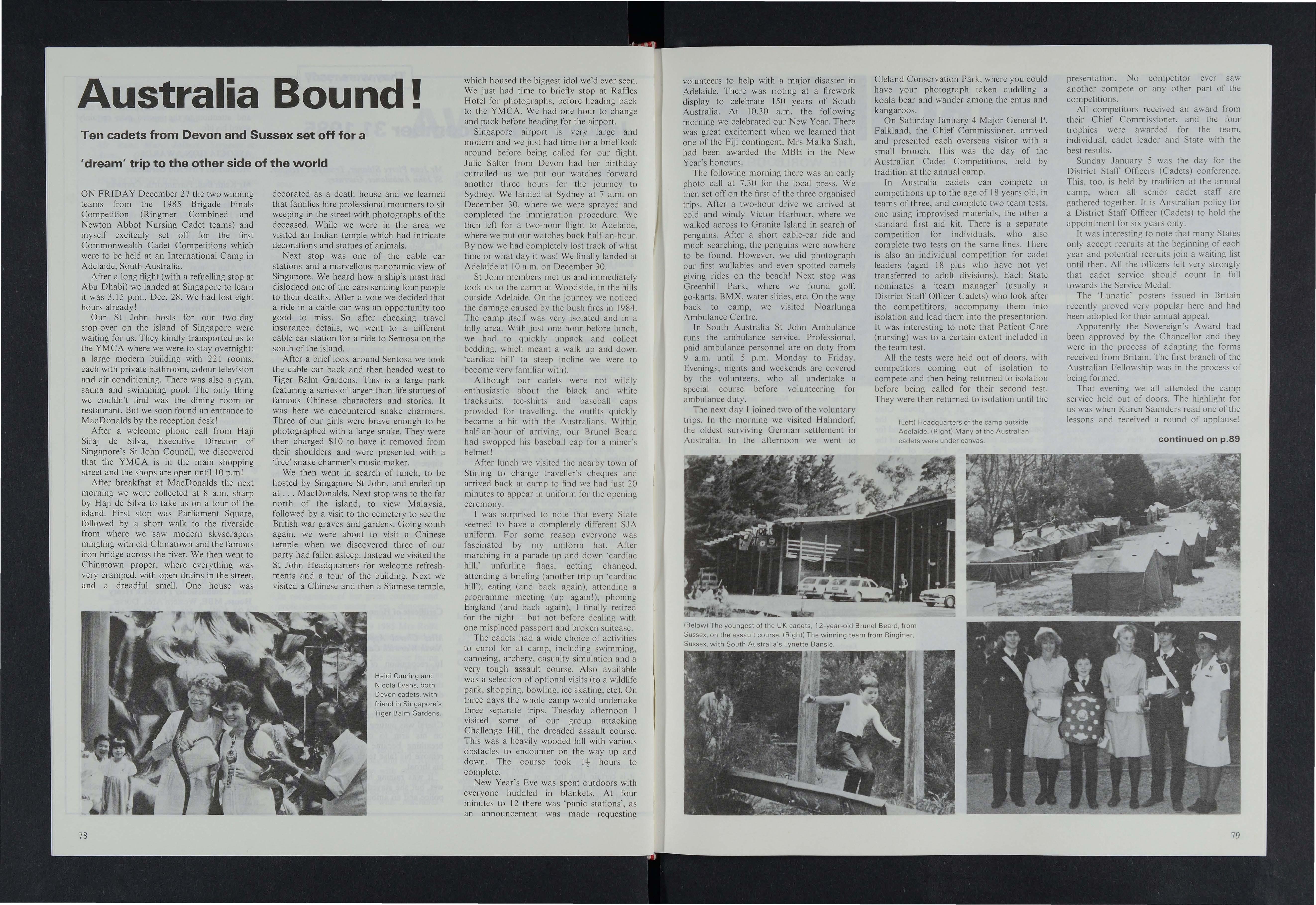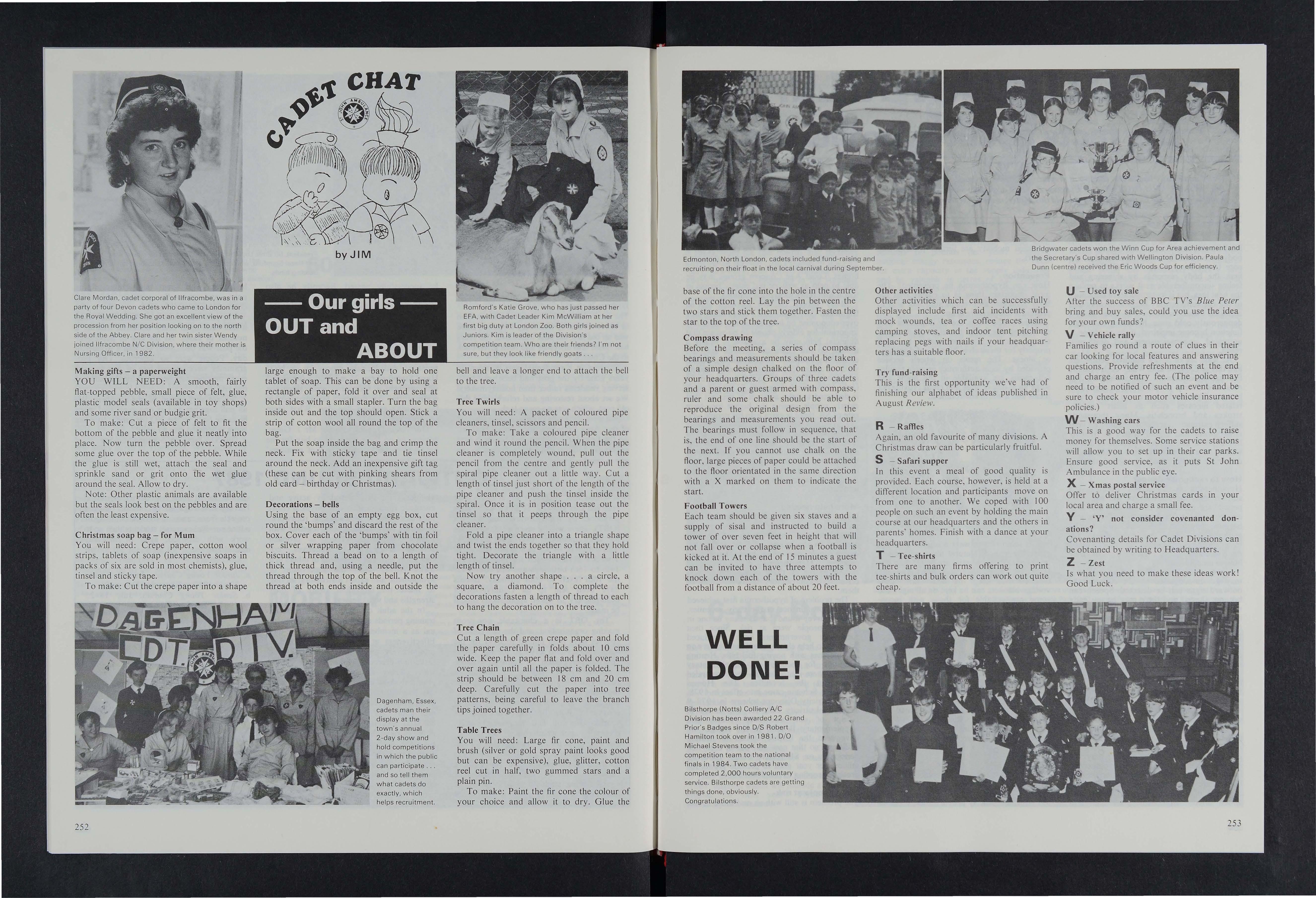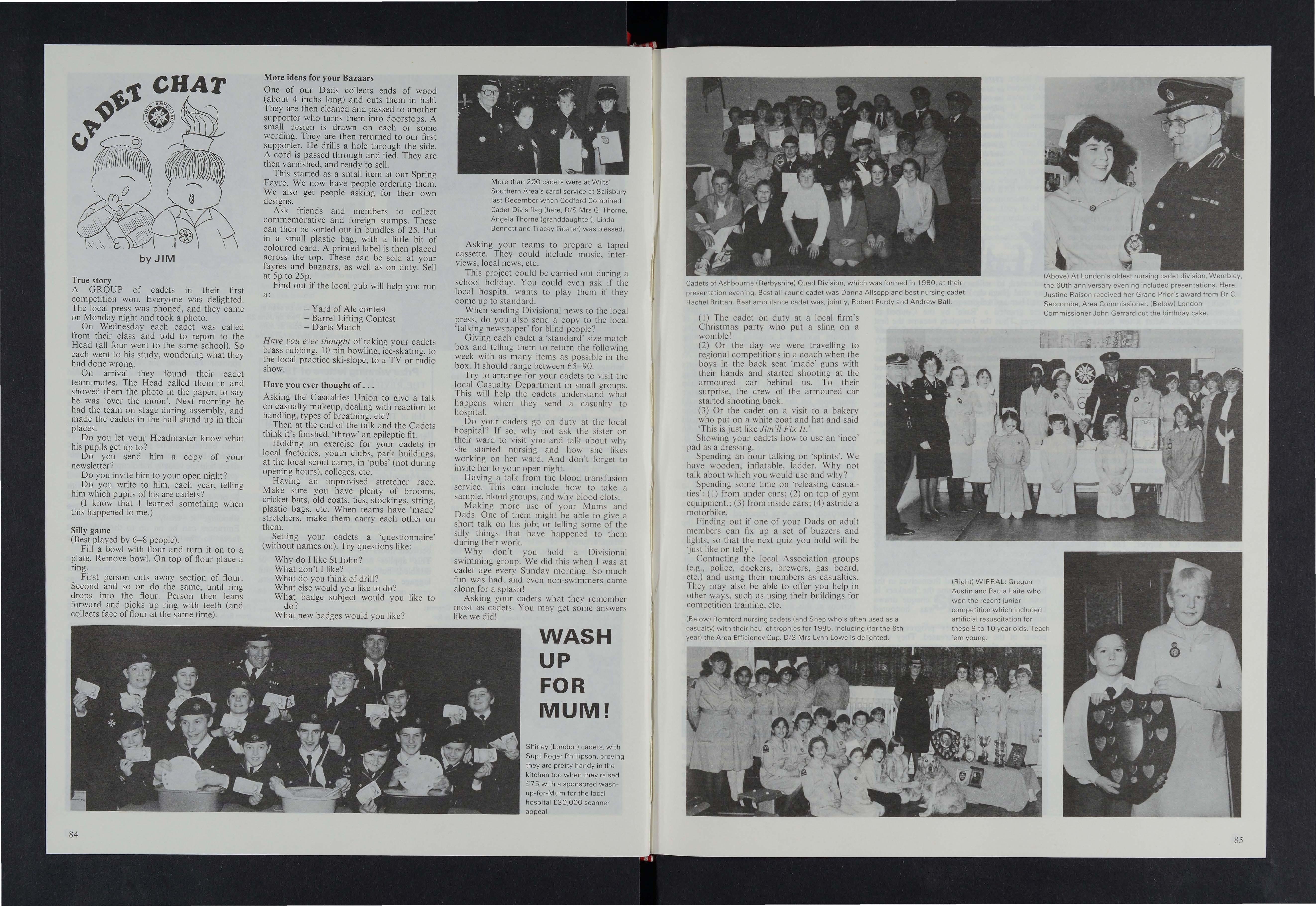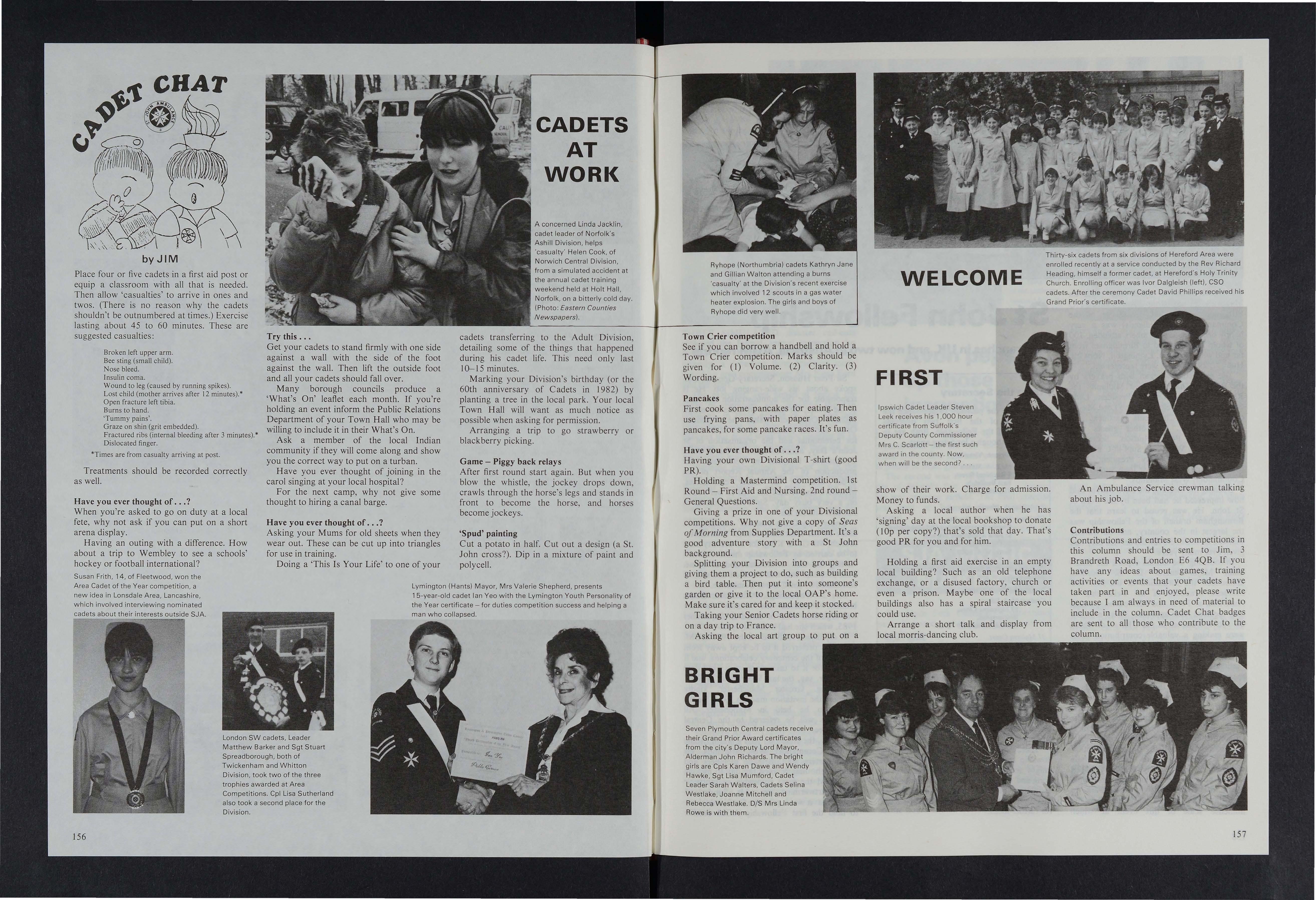 for their honesty f or taking £ 1500 they found in the street to he police. Two of them, Kathryn Nicholas and Wendy Evans (lower two) are both cadets of Hereford 's Ho ly Trinity Combined Division On the second Cub Day, the sun s hone and the major cub complaint was hay fever. Little boys with puffed-up eyes had their faces bathed soothingly by nursing cadets who we re very, very gentle. On that day 97 people were treated including some grownups. How did the cadets get the Gilwell duty? Mrs Ware's husband works for the Scout Association. And CN38 Chingford cadets have now got permission to use Gilwell camp site too.