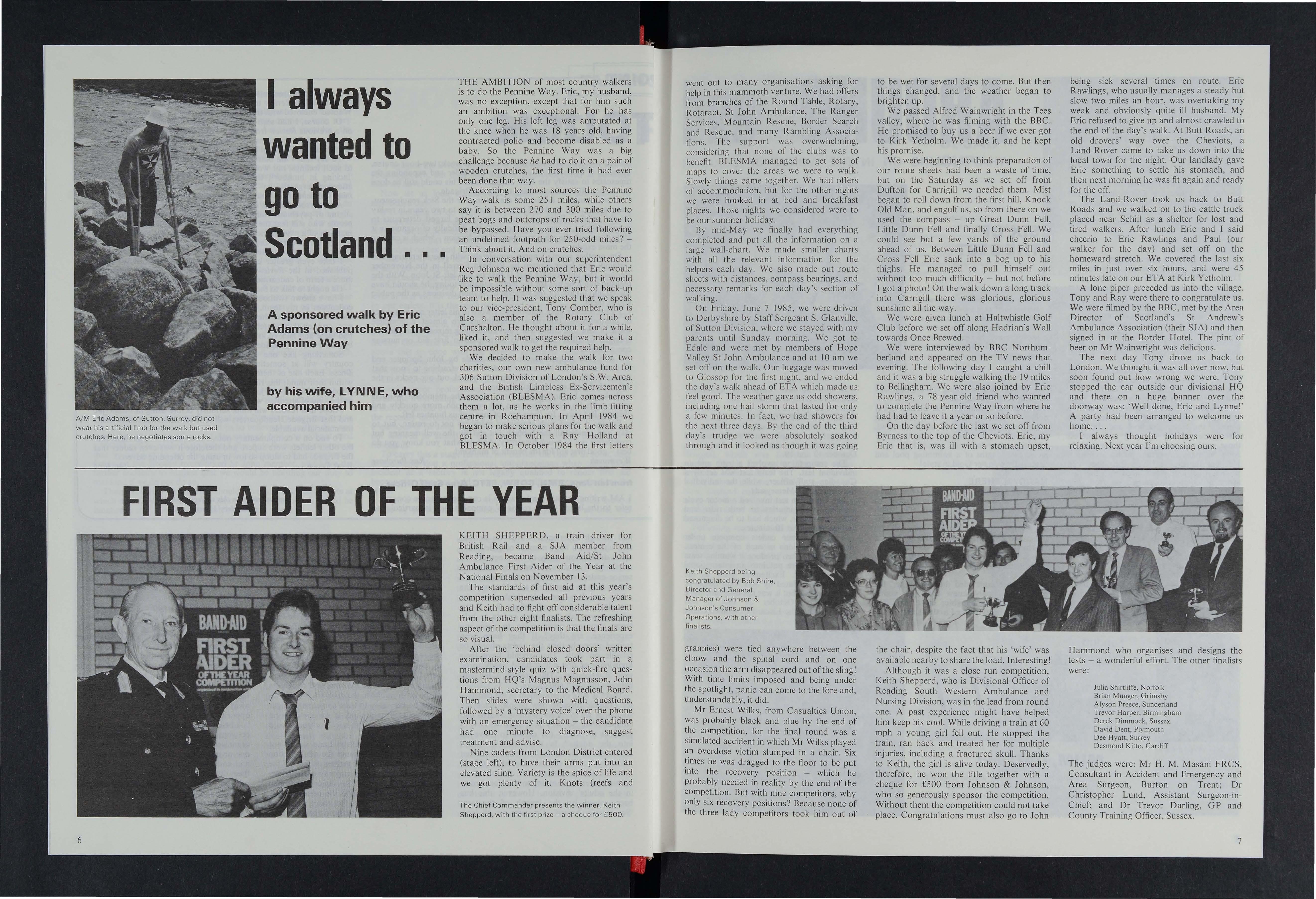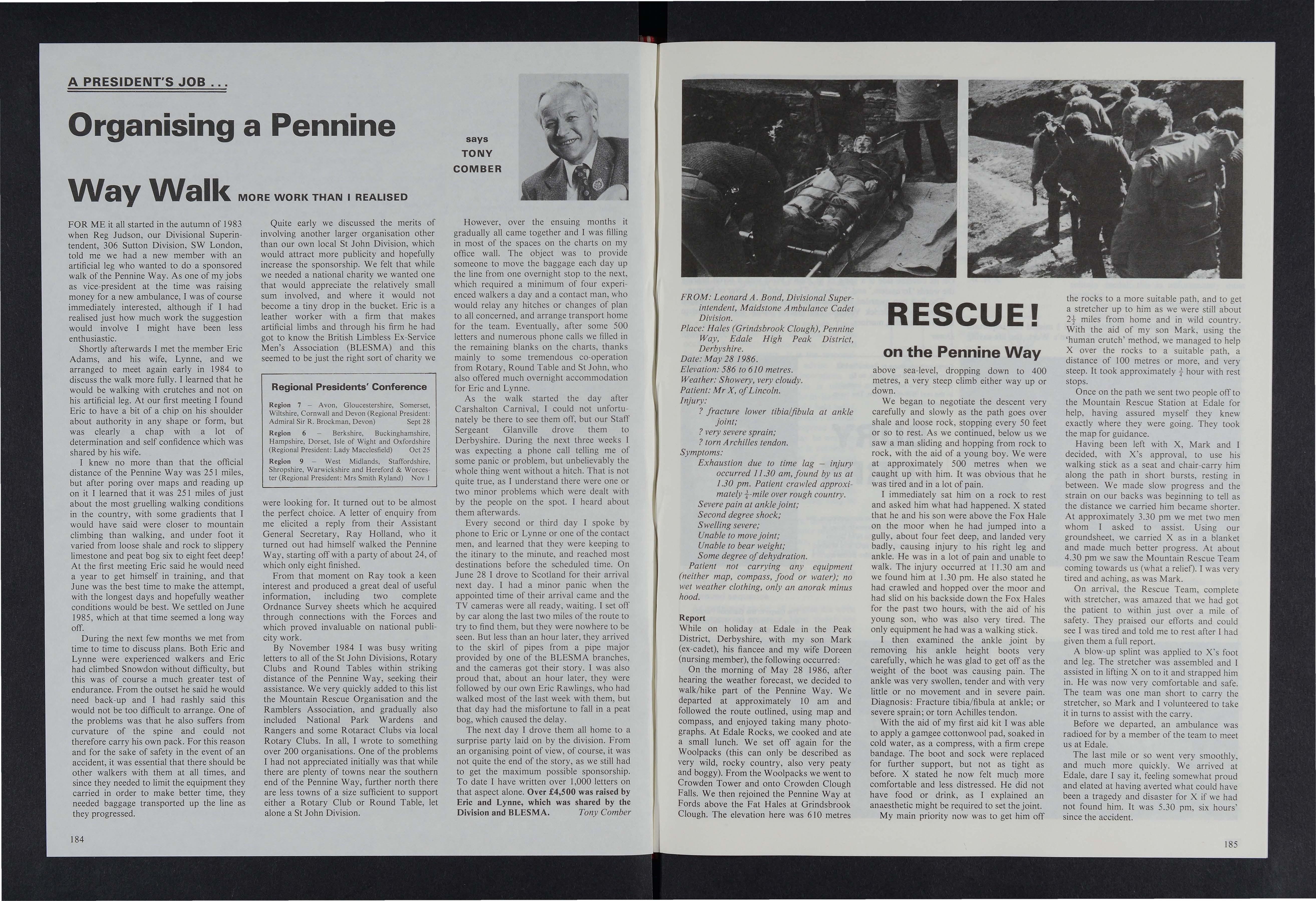 In conversation with our superintendent Reg Johnson we mentioned that Eric would like to walk the Pennine Way, but it would be impossible without some sort of back - up team to help. It was suggested that we speak to our vice - president , Tony Comber, who is also a member of the Rotary Club of Carshalton. He thought about it for a while liked it, and then suggested we make it a sponsored walk to get the required help. We decided to make the walk for two charities, our own new ambulance fund for 306 Sutton Division of London's S.W. Area, and the British Limbless Ex-Servicemen's Association (BLESMA). Eric comes across them a lot , as he works in the limb-fitting centre in Roehampton. In April 1984 we began to make serious plans for the walk and got in touch with a Ray Holland at BLESMA. In October 1984 the first letters