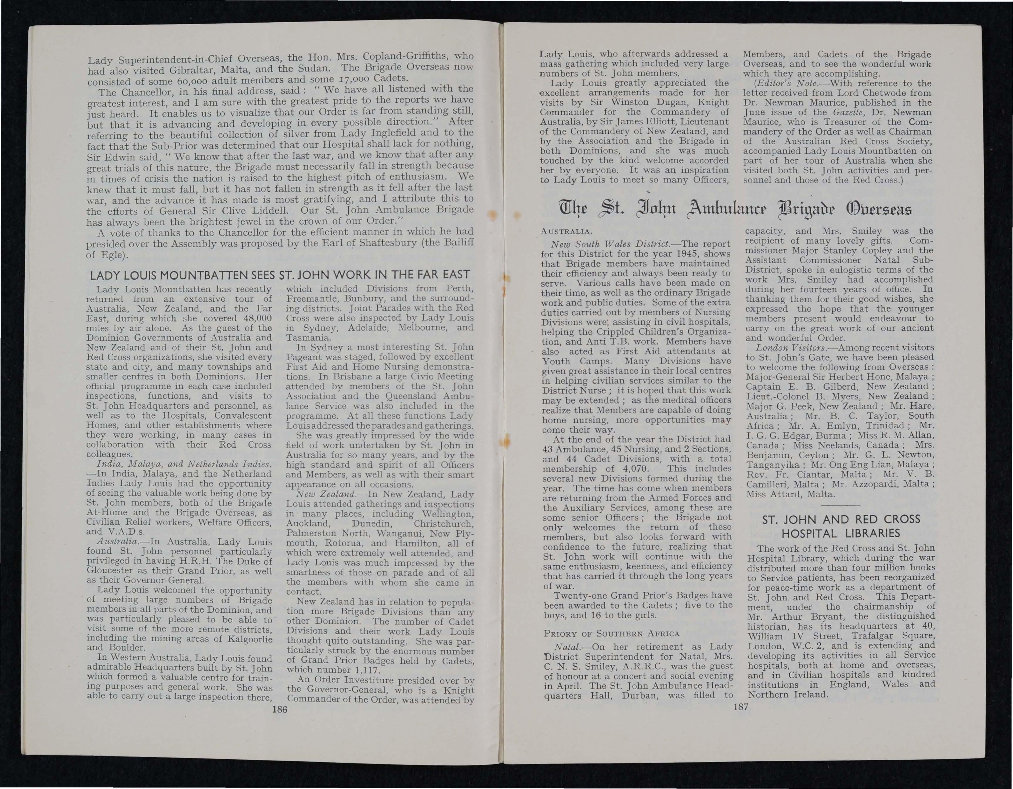 (Editor's N ote.-With reference to the letter received from Lord Chetwode from Dr. Newman Maurice, published in the June issue of the Gazette, Dr. Newman Maurice, who is Treasurer of the Commandery of the Order as well as Chairman of the Red Cross Society, accompallled Lady Louis Mountbatten on part of her tour of Australia when she visited both St. John activities and personnel and those of the Red Cross.)