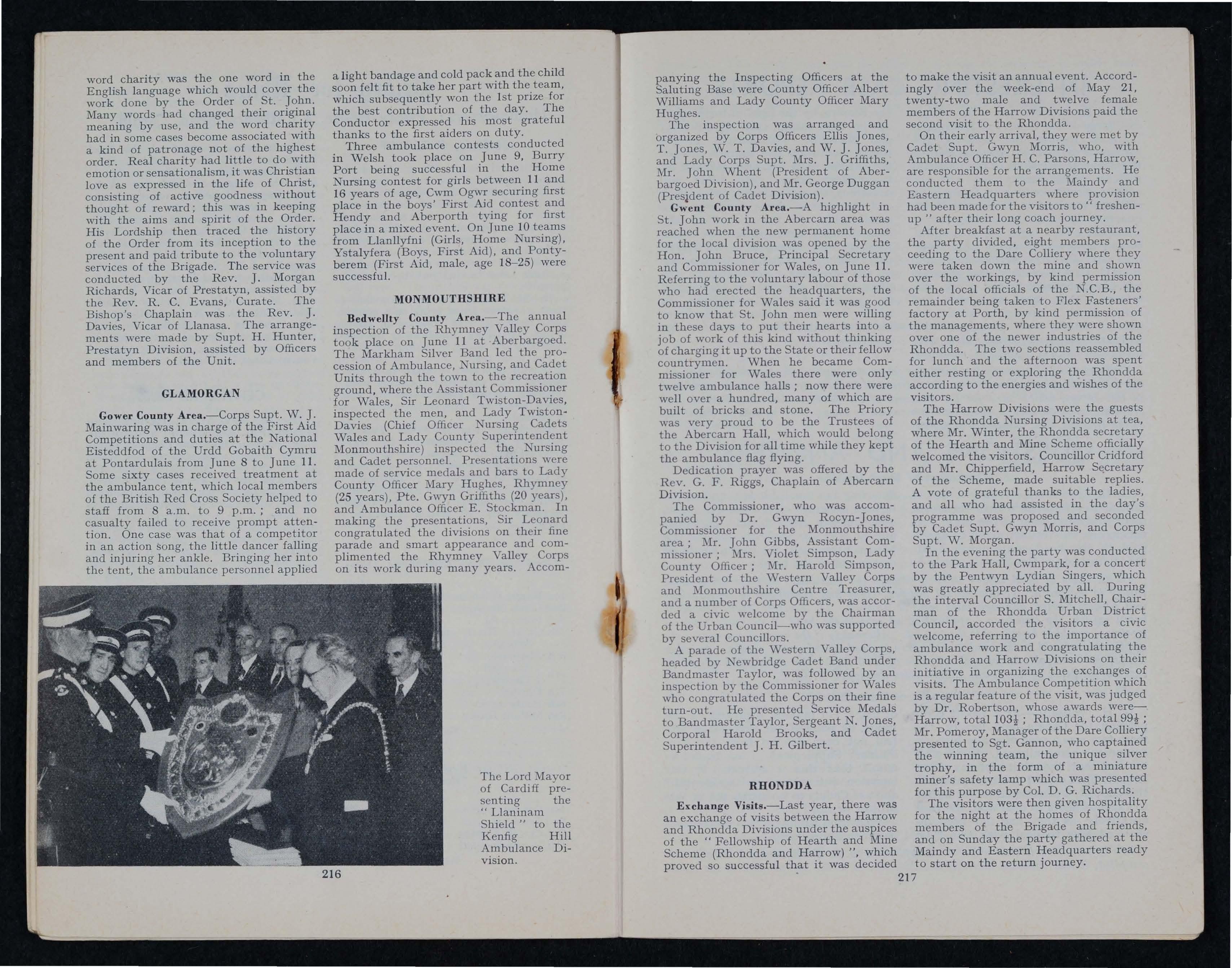 The Harrow Divisions were the guests of the Rhondda Nursing Divisions at tea, where Mr. Winter, the Rhondda secretary of the Hearth and Mine Scheme officially welcomed the visitors. Councillor Cridford and Mr. Chipperfield, Harrow of the Scheme, made suitable replies . A vote of grateful thanks to the ladies, and all who had assisted in the day's programme was proposed and seconded by Cadet Supt. Gwyn Morris, and Corps Supt. W . Morgan.