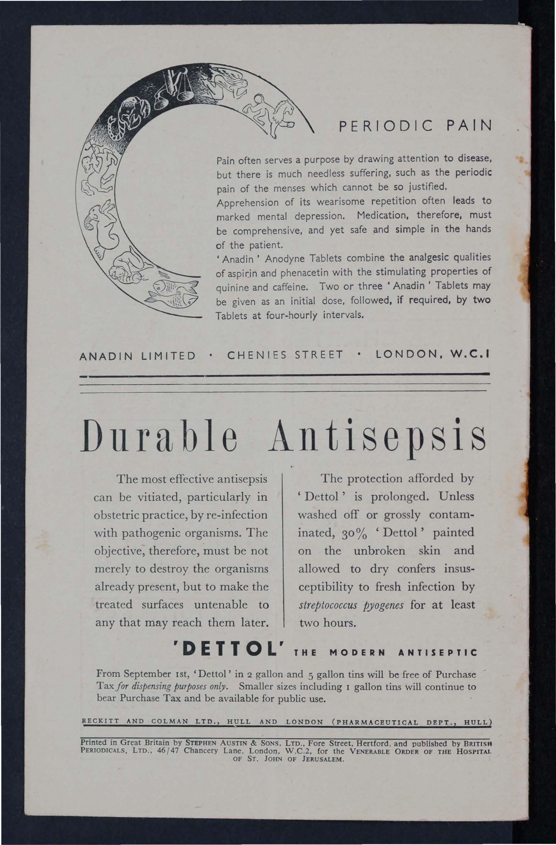 Pain often serves a purpose by drawing attention to disease, but there is much needless suffering, such as the periodic pain of the me nses which cannot be so justified. Apprehension of its wearisome repetition often leads to marked mental depression. Medication, therefore, must be comprehensive, and yet safe and simple in the hands of the patient.