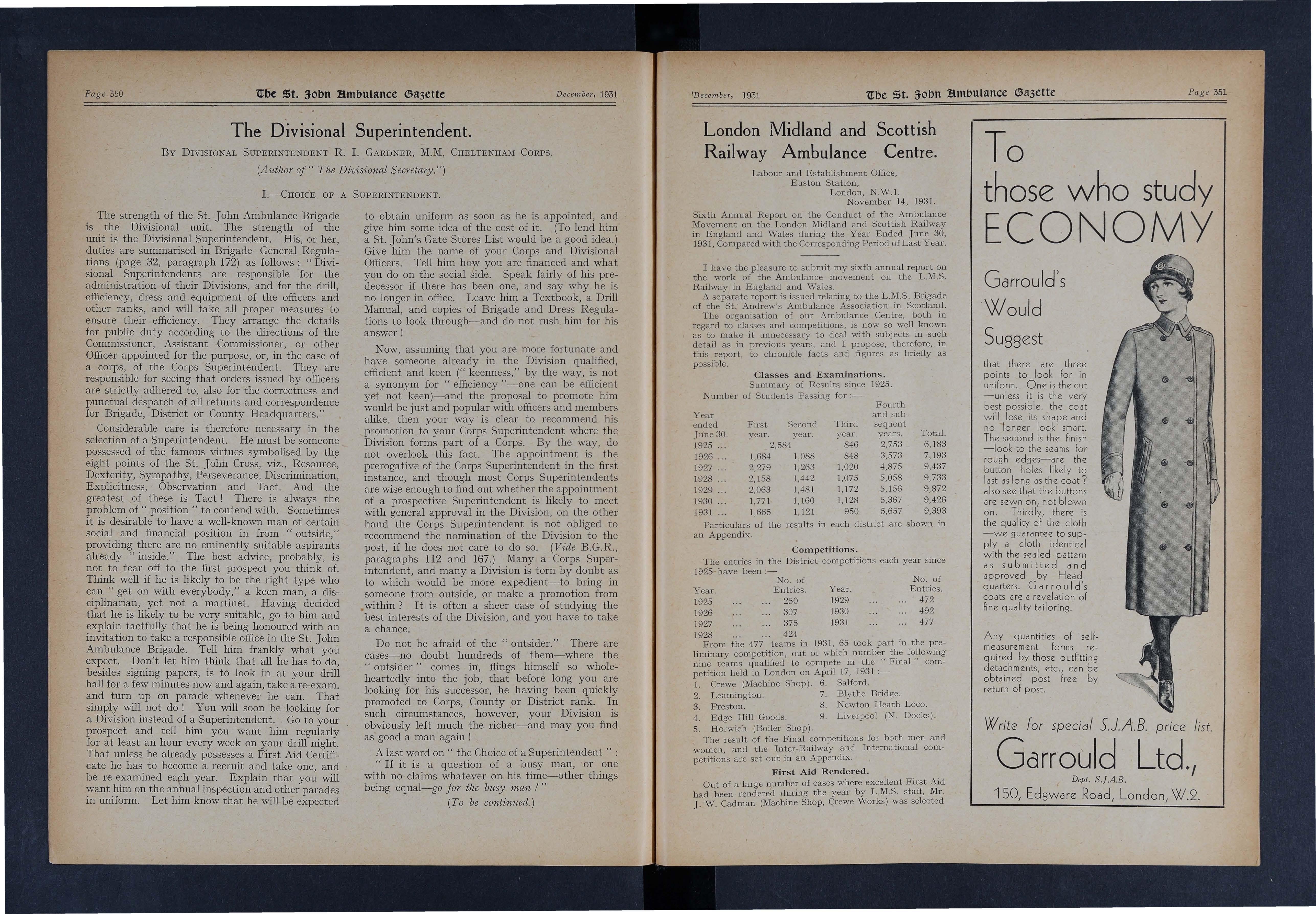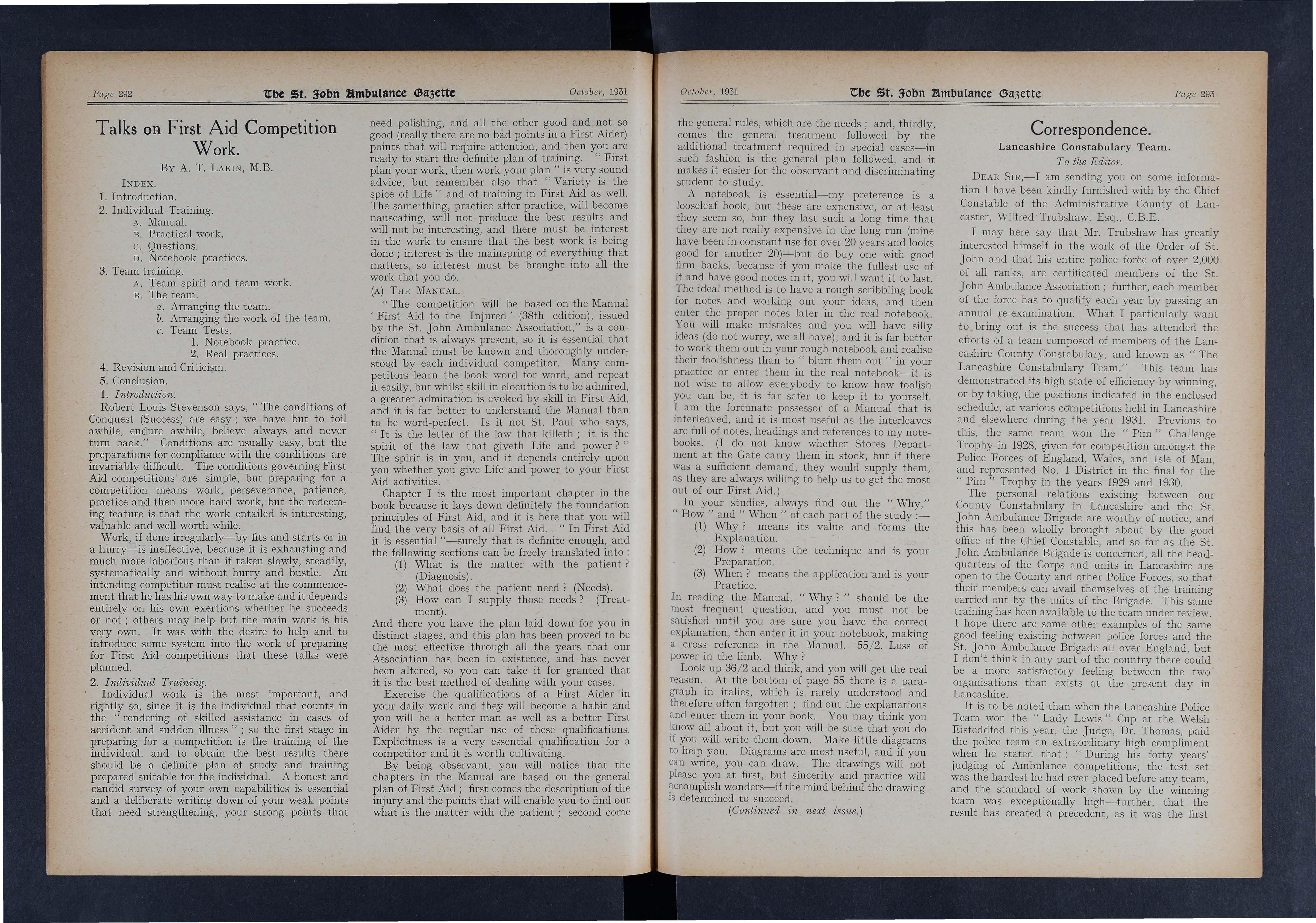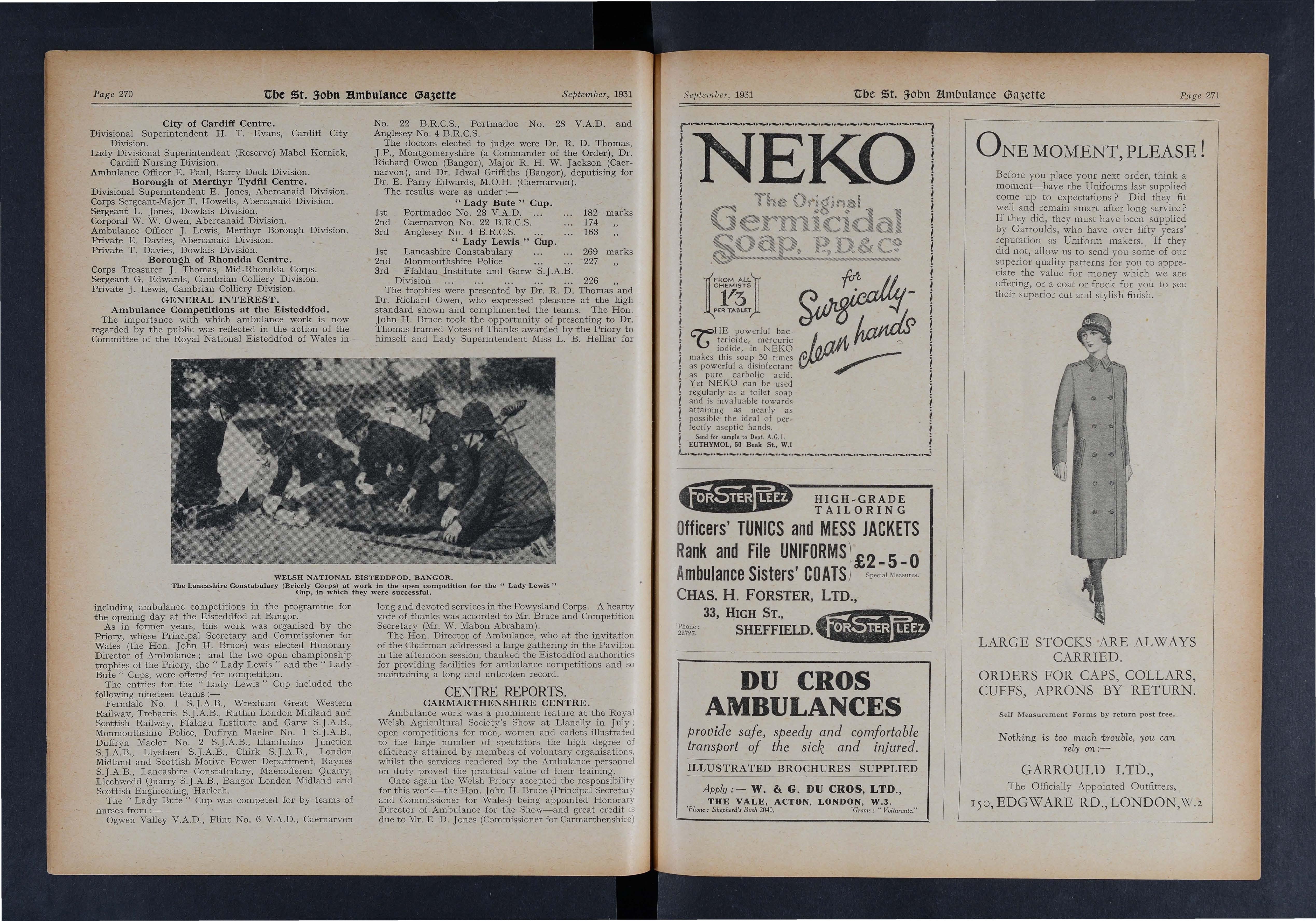 Six ambulance teams representing the Great -Western Railway Company and th e London Mid l and and Scottis h Railway Company t ook part in the Ann u a l Championship Comp@tition organised by the Prio r y for Wales for the " Harry Webb" Cup, at the Law Courts, Card ff, on Thursday, October 22, - 1931.