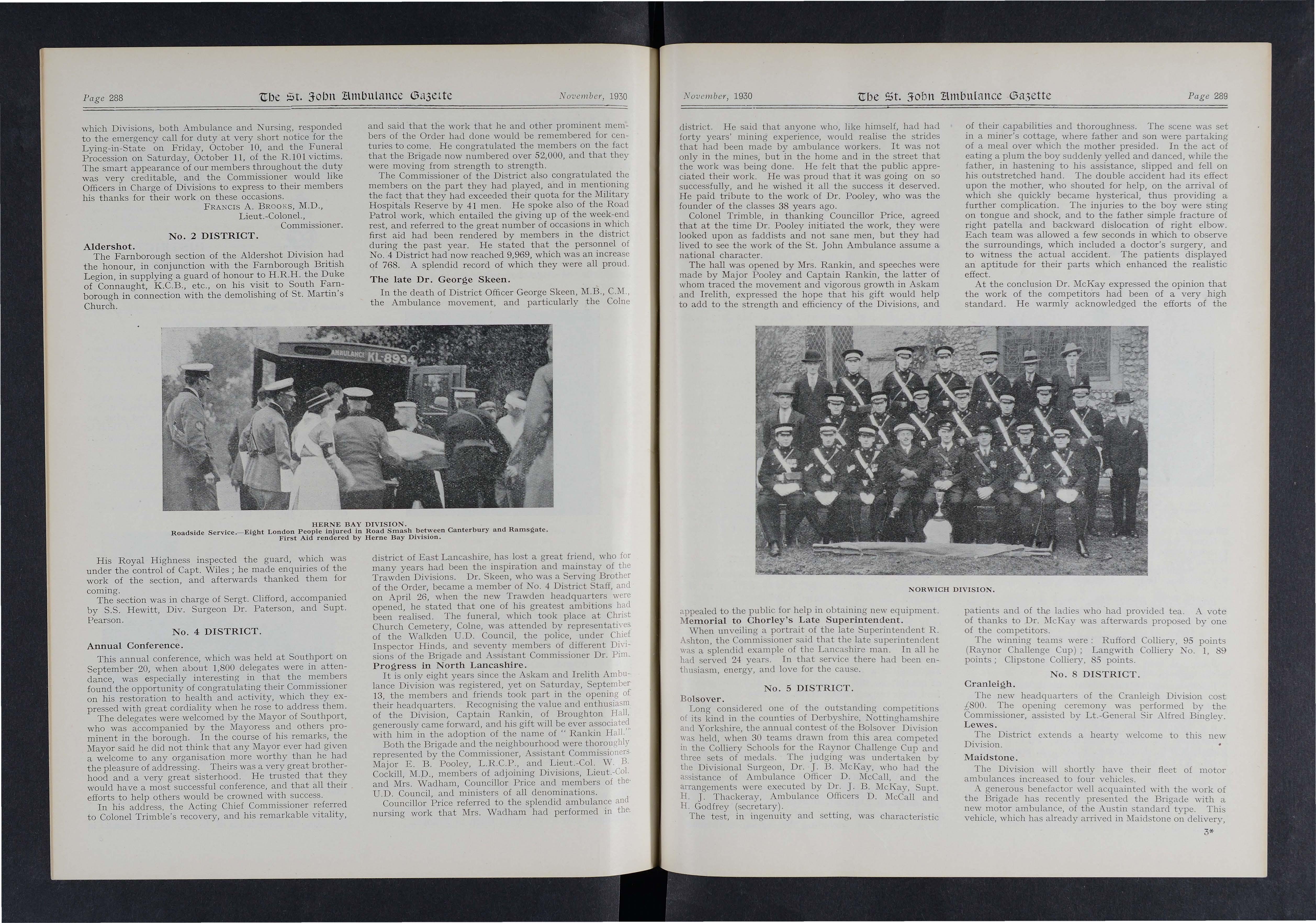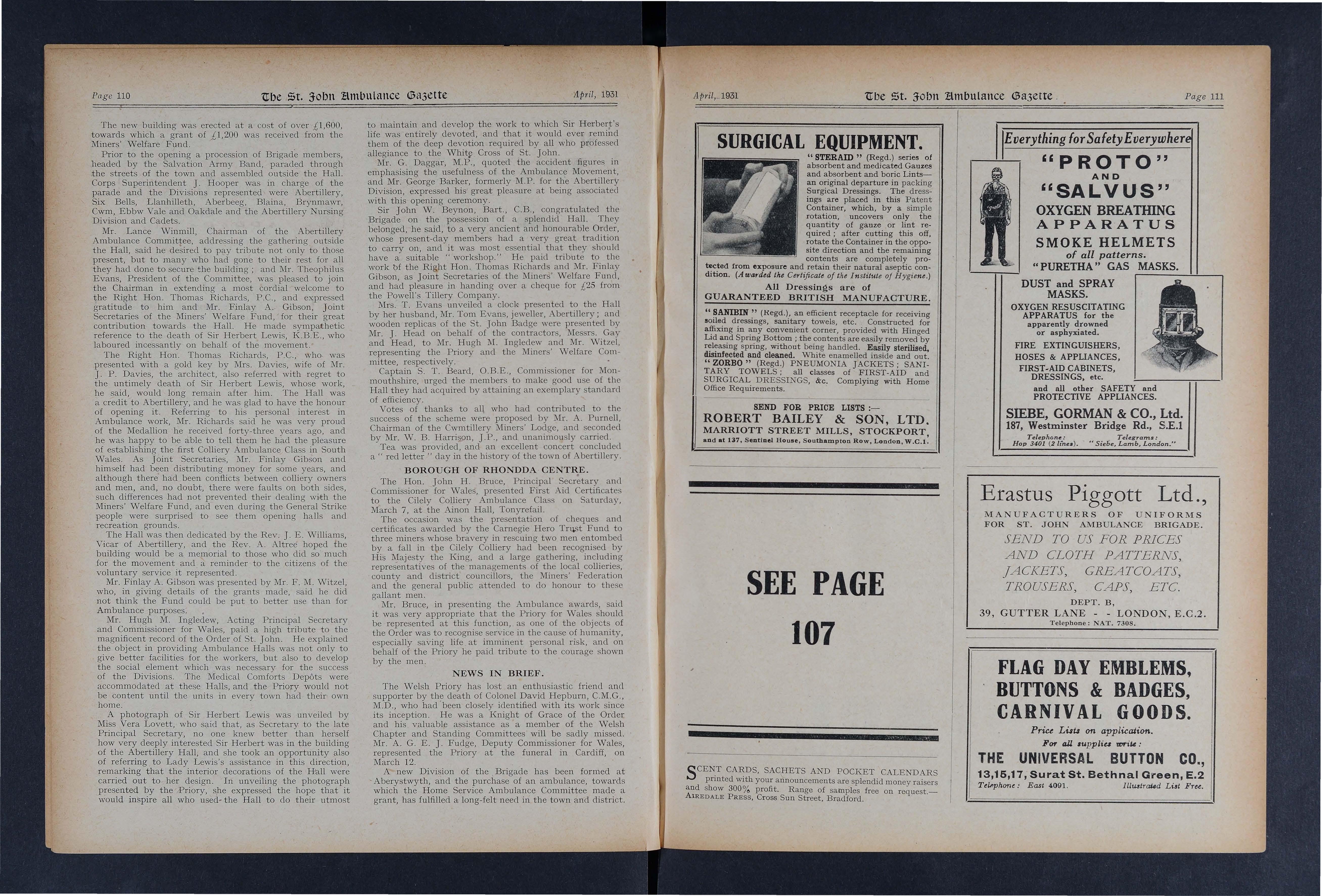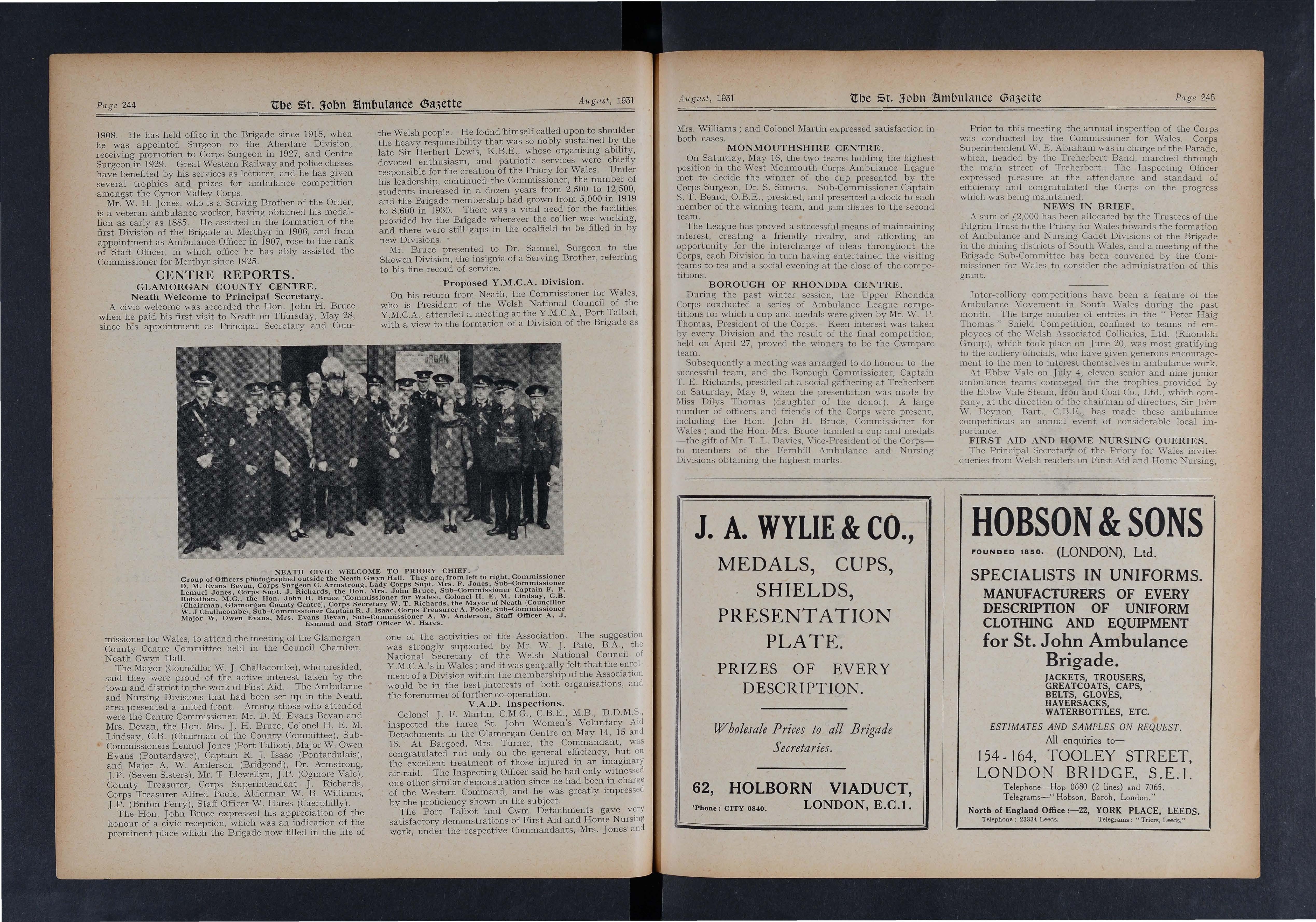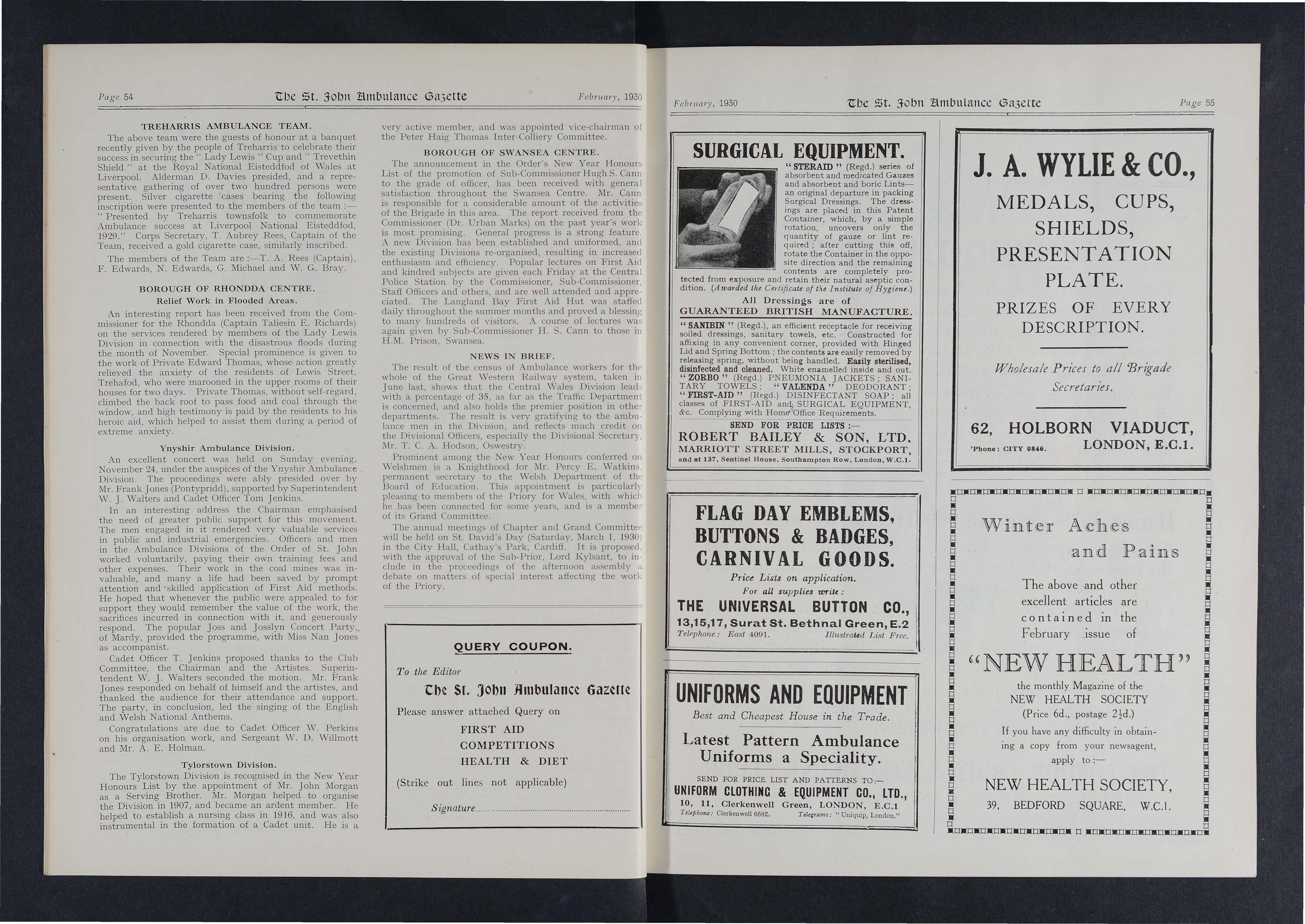 A most enjoyable evening was spent by the members and friends of the Llwynypia Collieries Ambulance Class at the Co-operative Hall, Tonypandy, on Saturday, October 24 Mr. H. H Evans (President of the Borough of Rhondda Centre) presided , and the awards were presented by the Hon. John H Bruce, Mrs. R. Lloyd, and Captain T. E. Richards, Corps Secretary W R Matthews receiving from the Commissioner for Wales the Service Medal of the Order. In his address, Mr. Bruce paid high tribute to the Class Secretary (Mr. W. McTiffin) for the manner in which the arrangements had been carried out, and expressed pleasure at the presence of so many boy Cadets.