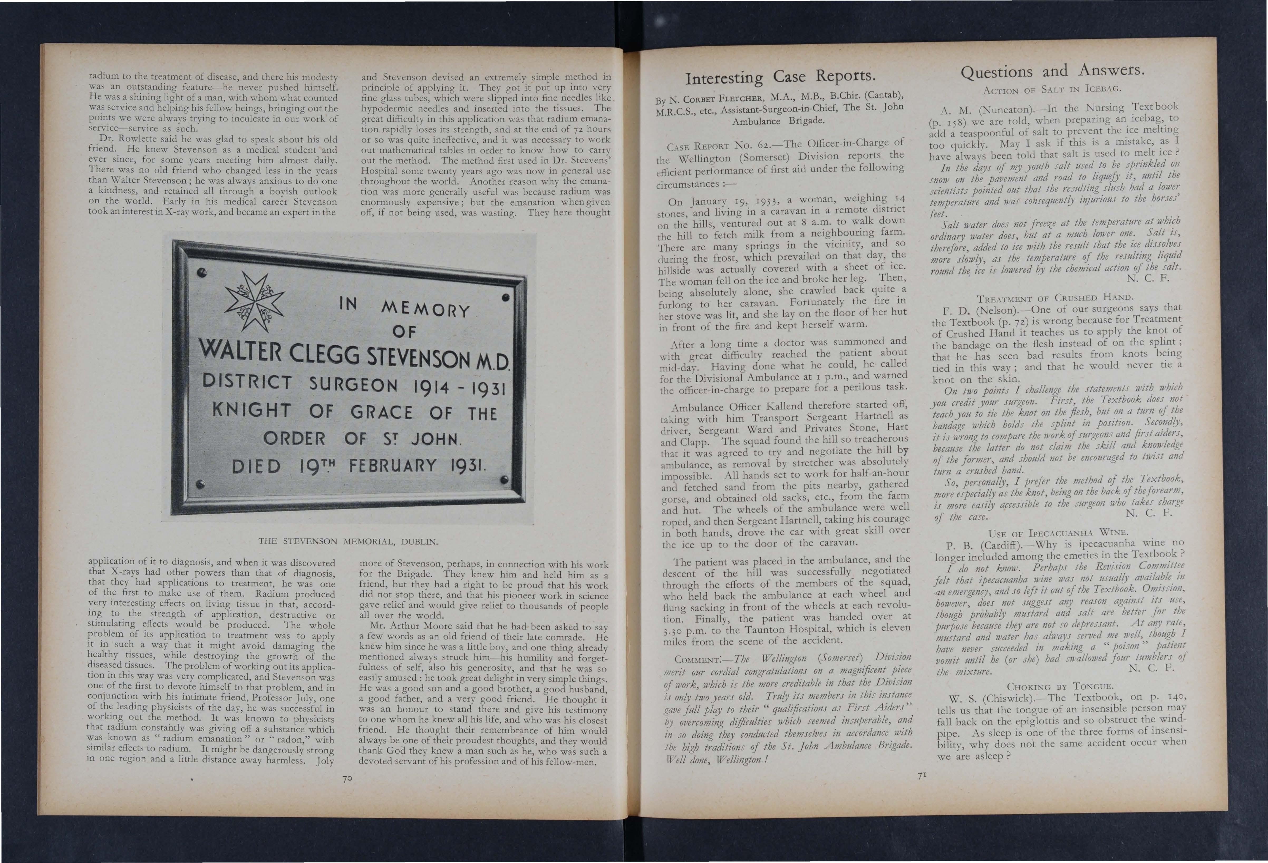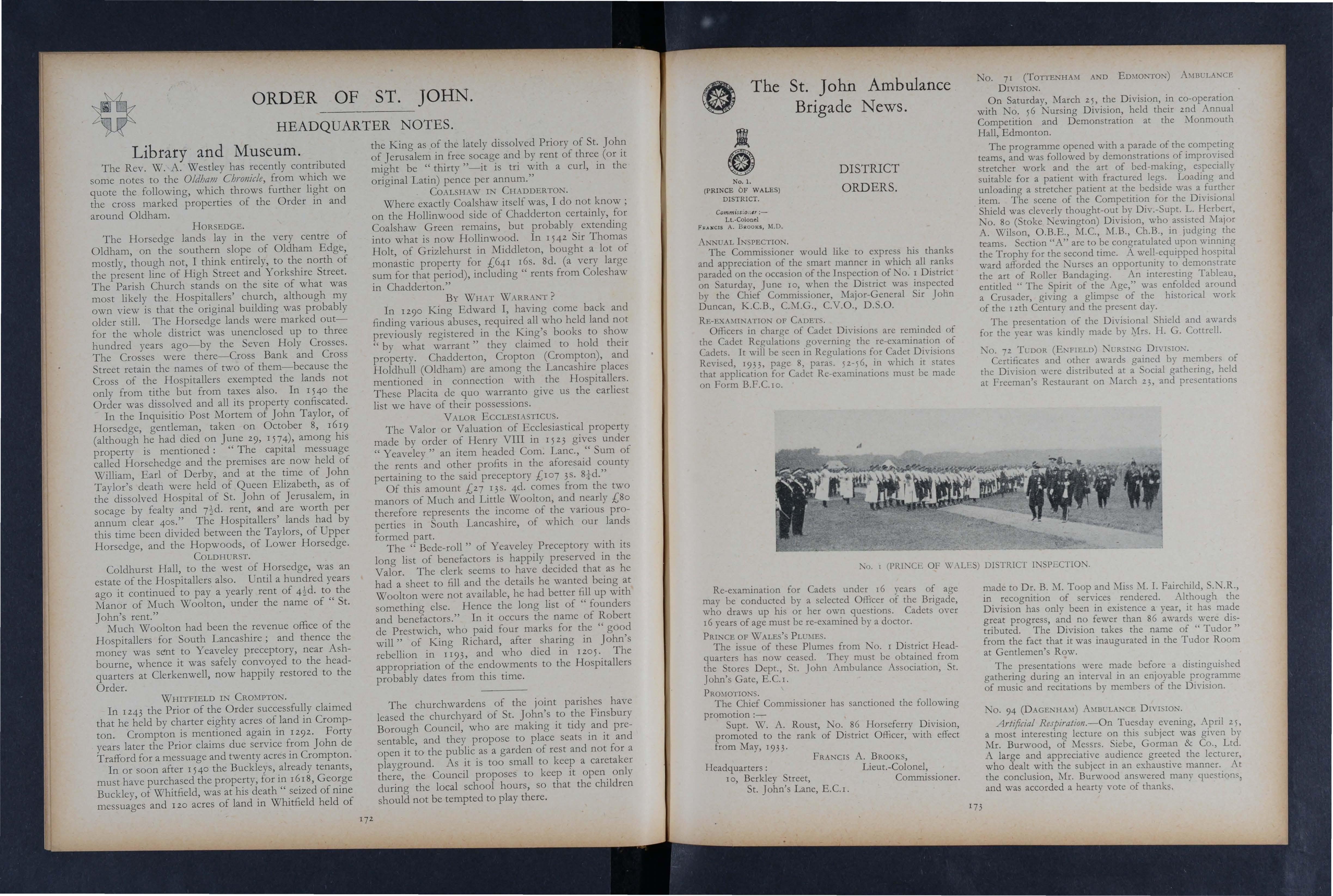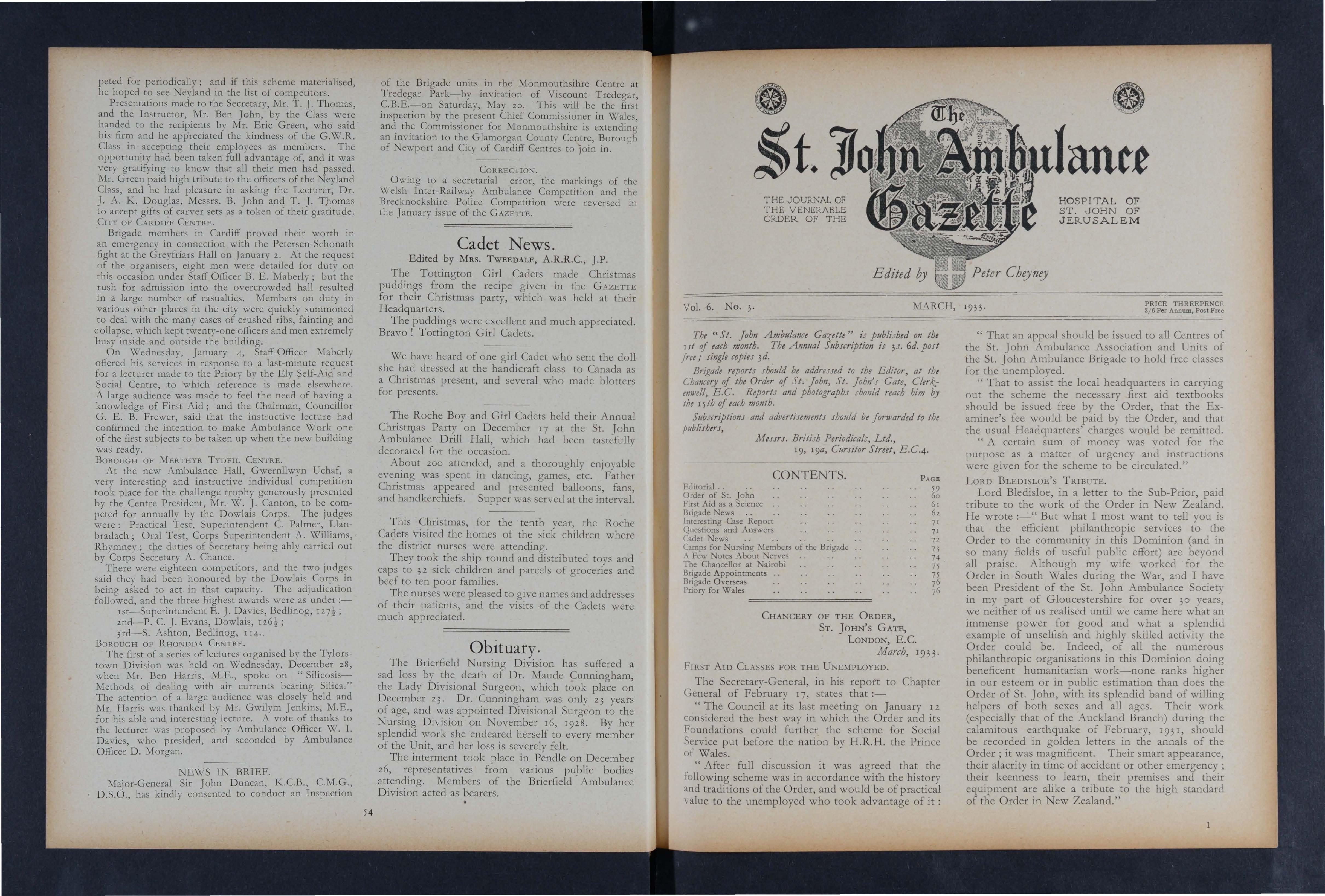 The ewport Corps has sustained a great loss by the death, which occurred on October 22, 1933, of Mr. George Storey, whose retirement six weeks previously from the position of Corps Superintendent was marked by the special award of a Priory Vote of Thanks as a recognition of long and efficient service. Railway men and Ambulance workers of all grades joined in a tribute at the funeral at ewport Cemetery. The coffin was covered with the St. John flag, and an escort of fifty Ambulance men was headed by a party of ewport Police.