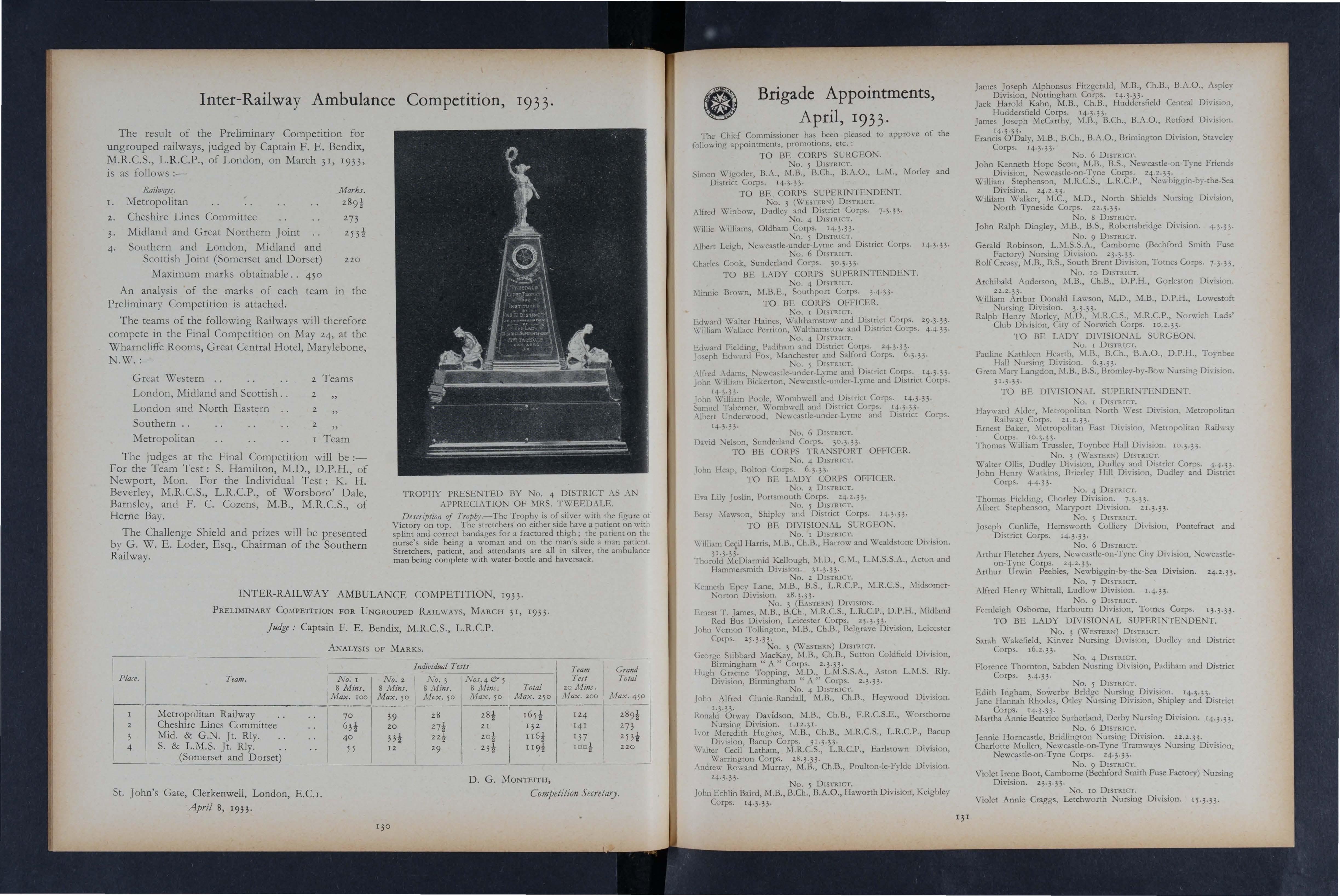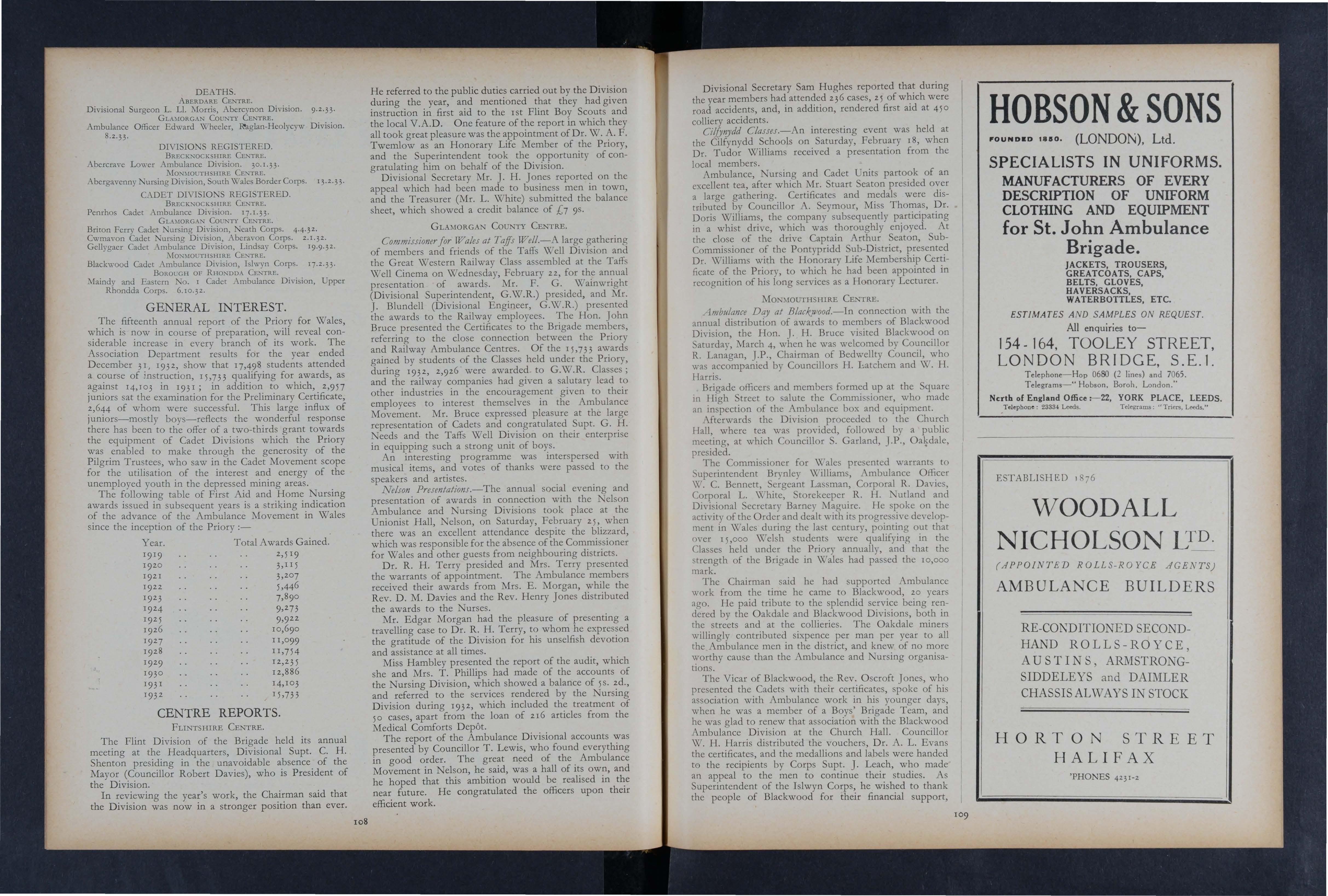 and he hoped Alderman Hughes, who was a very active member of that committee, would soon be able to persuade his colleagues on the Town Council of the necessity of providing the Ambulance Brigade with a home. Referring to the progress of the Division, the President said in 1931 they had 20 members, and all qualified; in 1932 3a members qualified; and in 1933 4 0 members qualified. In 193 T the motor ambulance carried 2.0 persons, in 1932 it carried 70, and this year up to date 63. Colonel Roberts presented the Certificates, Vouchers and Labels; and Corporal Trevor Jones submitted a report on the year's work.