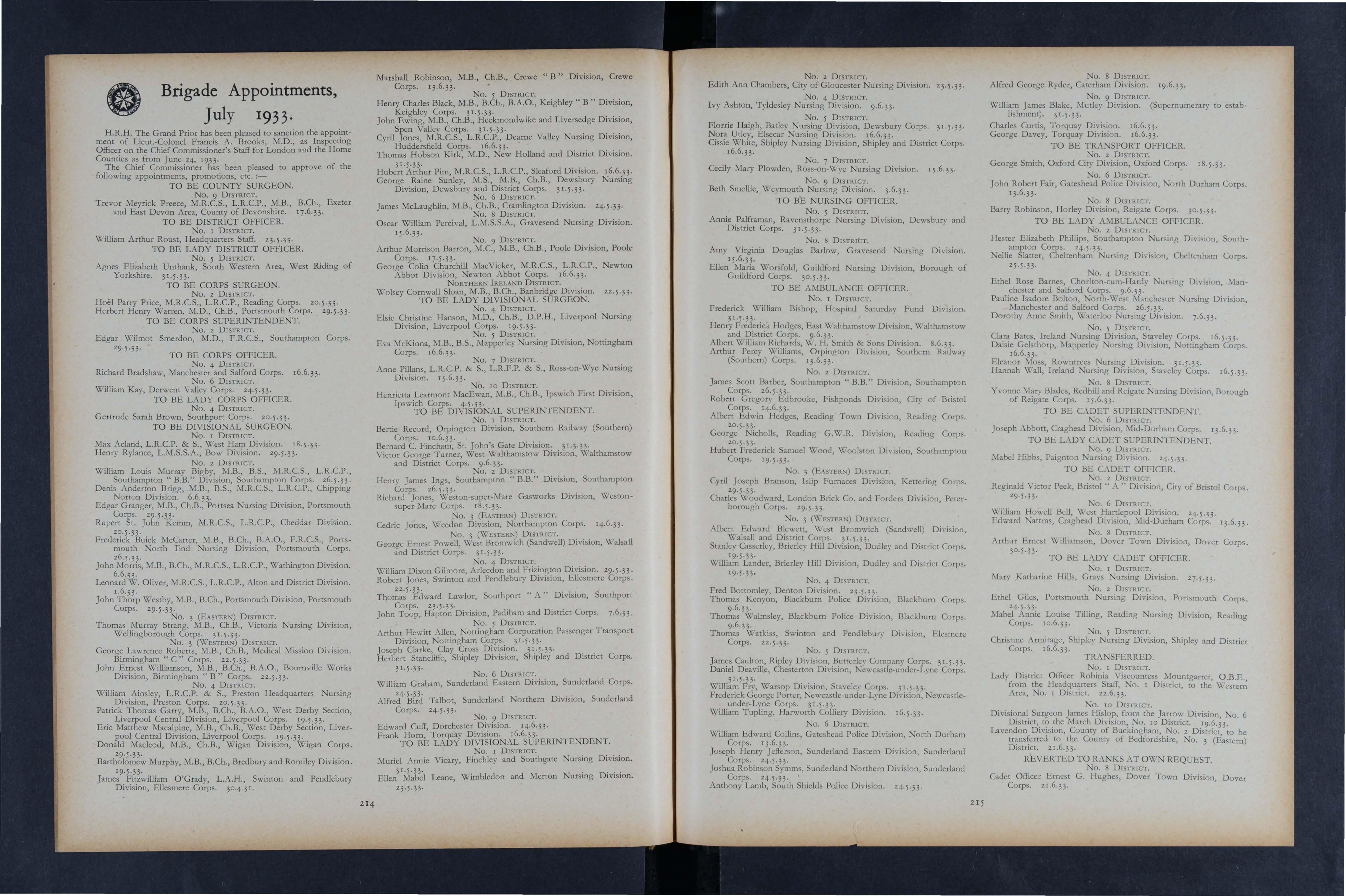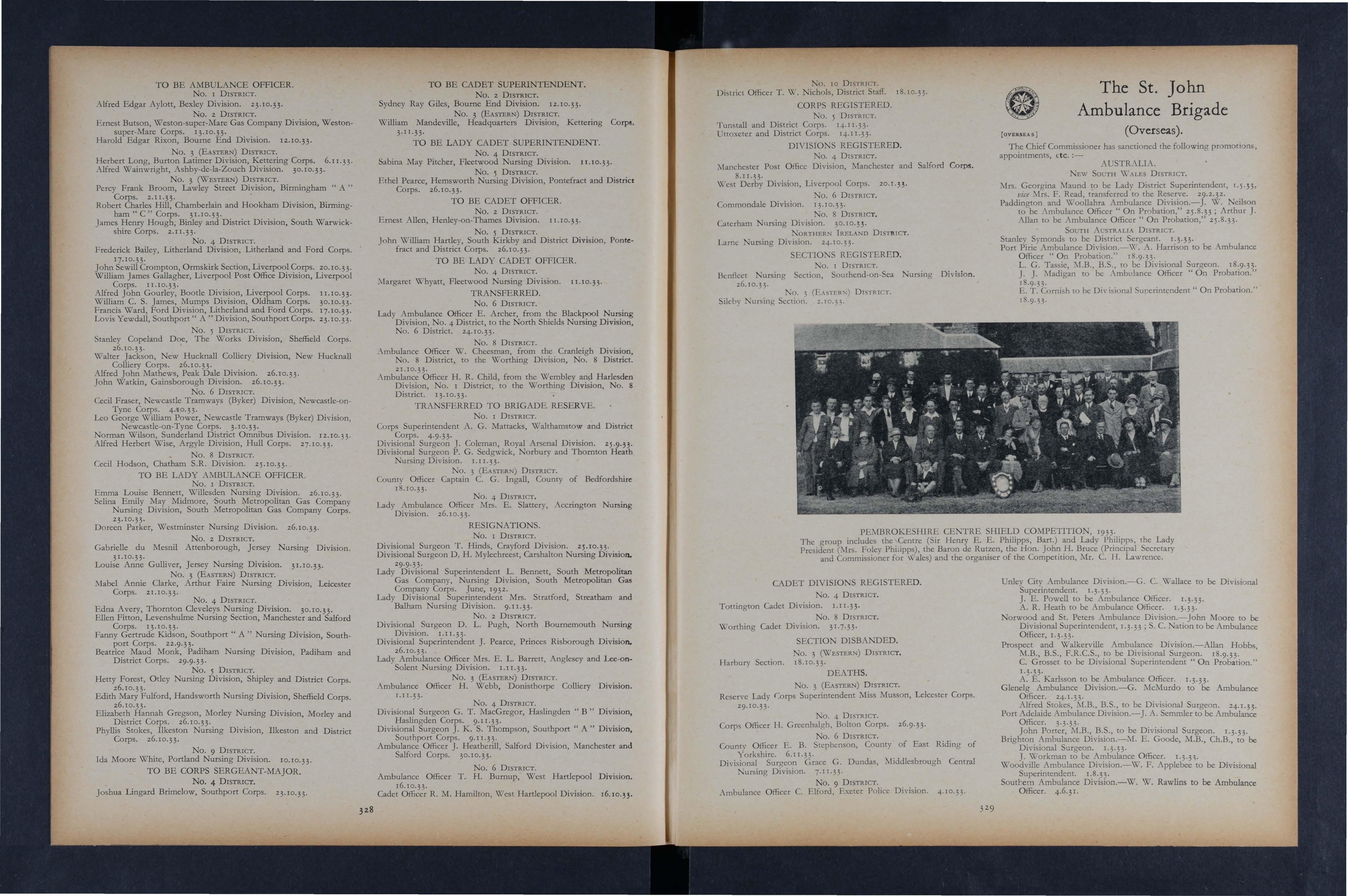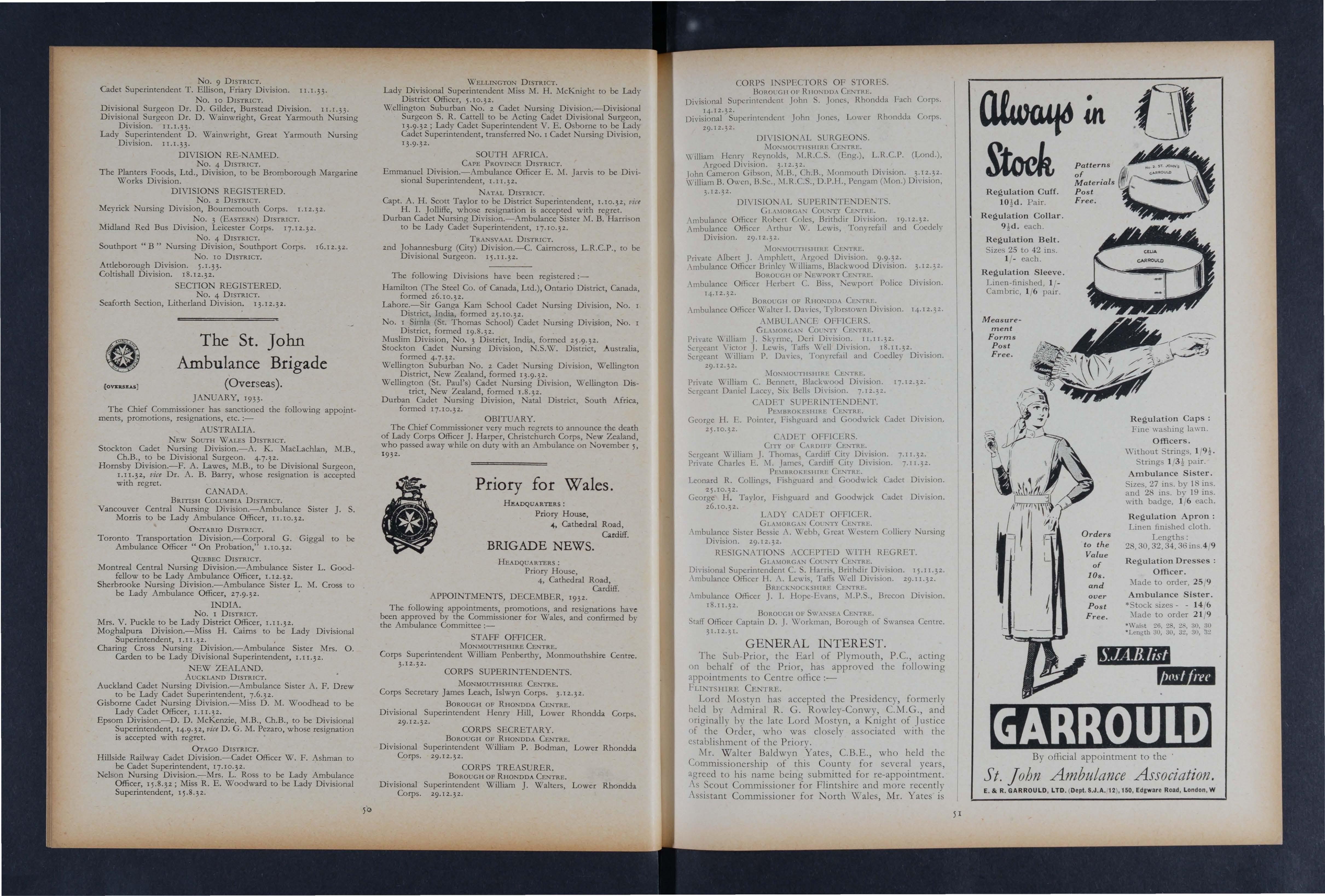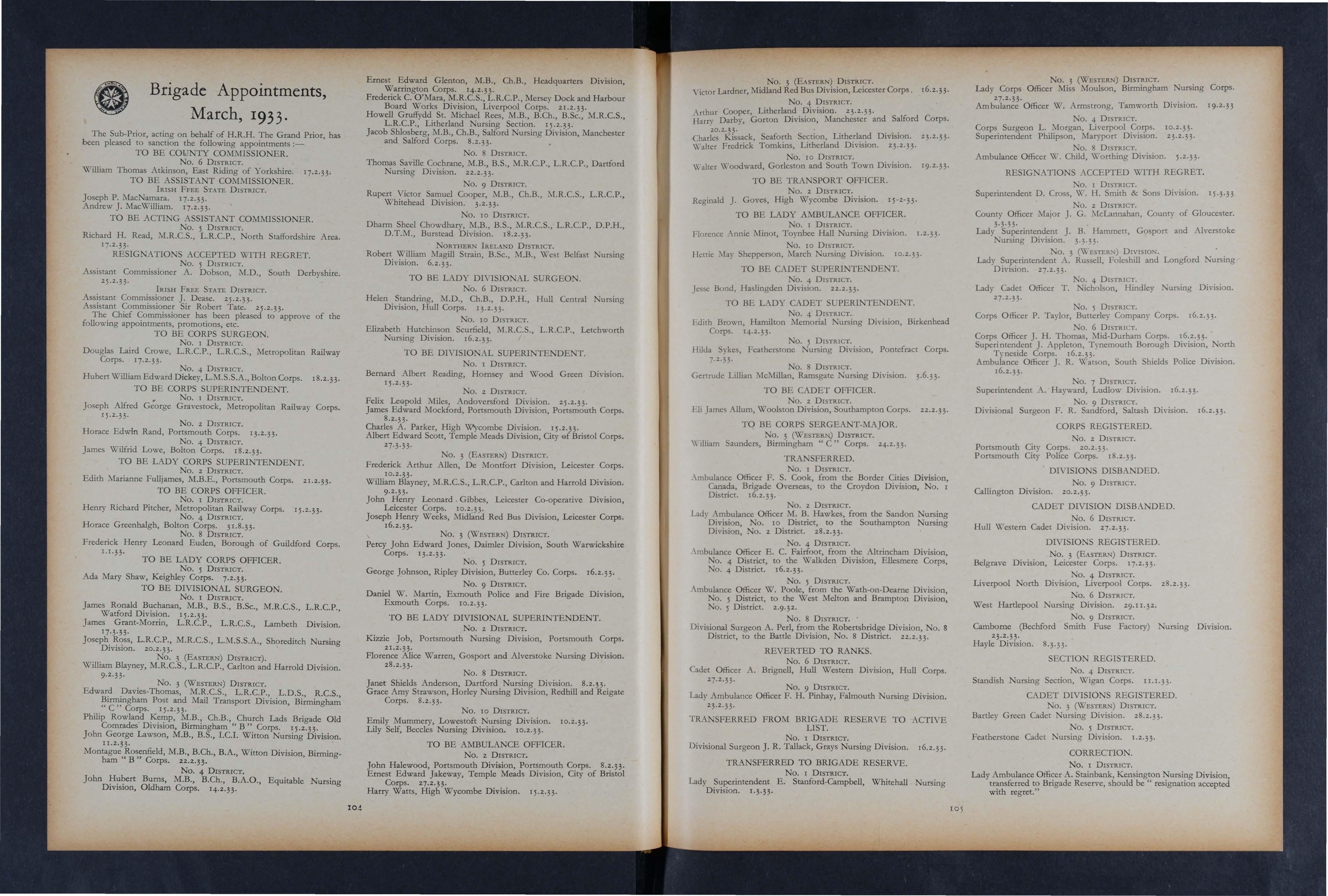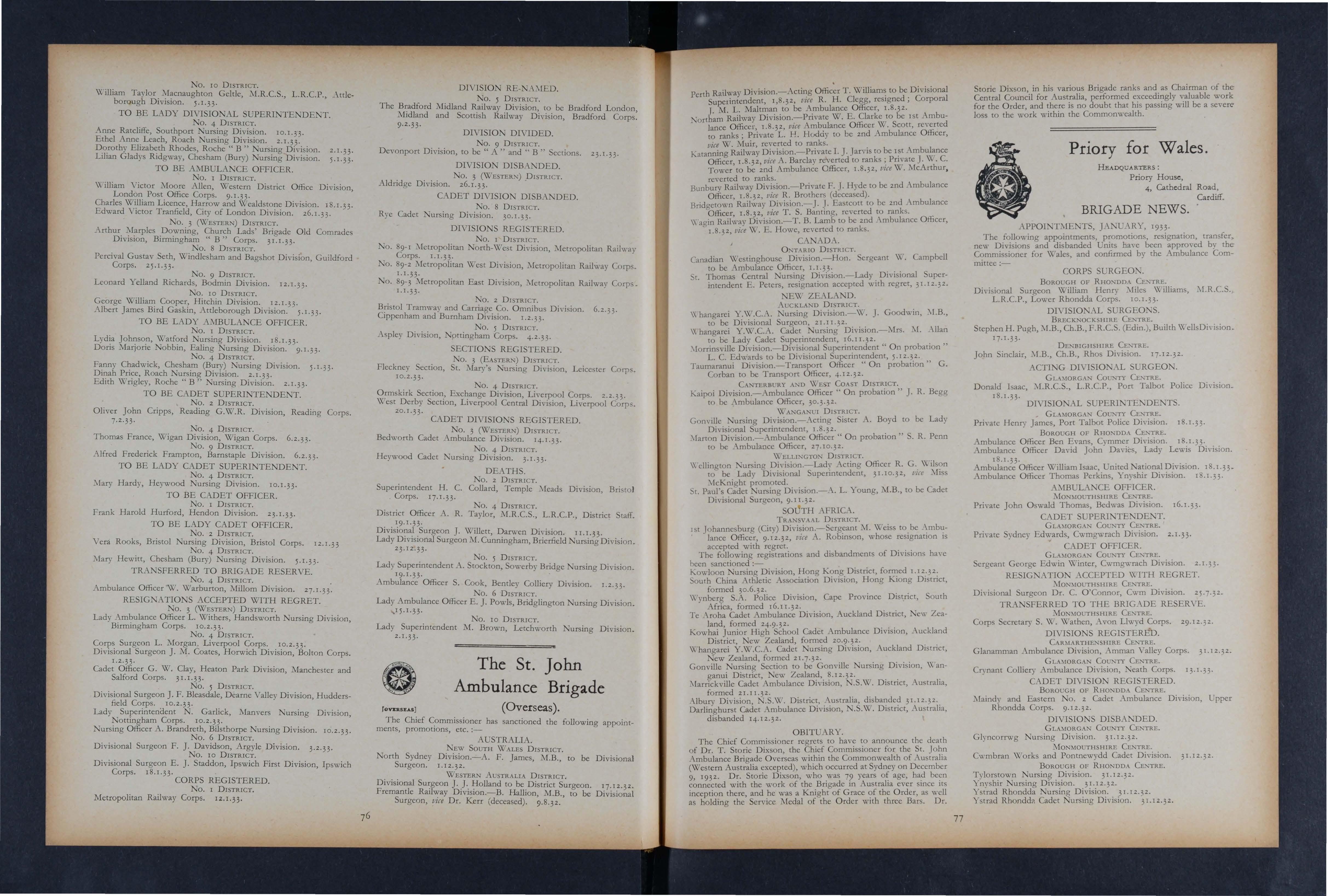 Unley City Ambulance Diyision.-G. C. Wallace to be Divisional Superintendent 1.3.33. J. E. PO\.vell to be Ambulance Officer. 1.3.33. A. R. Heath to be Ambu lance Officer. 1.3.33. Norwood and St. Peters Ambulance Diyision.-John Moore to be Divisional Superintcndent, I. 3.33 ; S C. ation to be Ambulance Officcr, 1. 3.33. Prospect and Walkerville Ambulance Di vision.-Allan Hobbs, LB., B.S., F.R.C.S., to be Divisional Surgeon. 18.9.33. C. Grosset to be Divisional Superintendent" On Probation ." 1.3-33· A. E. Karlsson to be Ambulance Officer 1.3.33. Glenelg Ambulance Division.-G. i\Ic.i\Iurdo to be Ambulance Officer. 24· 1. 33· Alfred Stokes, i\LB ., B.S., to be Diyisional Surgeon. 24. I. 33. Port Adelaide Ambulance Division.-J. A. emrnler to be Ambulance Officer. 3.3.33. John Porrer, B , to be D ivisional Surgeon. 1.3.33. Brighton Ambulance Division.-l\L E. Goode, LB., Ch.B., to be Divisional Surgeon. 1.3.3). J. \\' orkman to be Ambulance Officer. Woodville Ambulance Division.-W. F. Applebee to be Divisional Superintendent 1.8.33' Soutl"ern Ambulance Division.-W. W. Rawlins to be Ambulance Officer. 4.6,31.