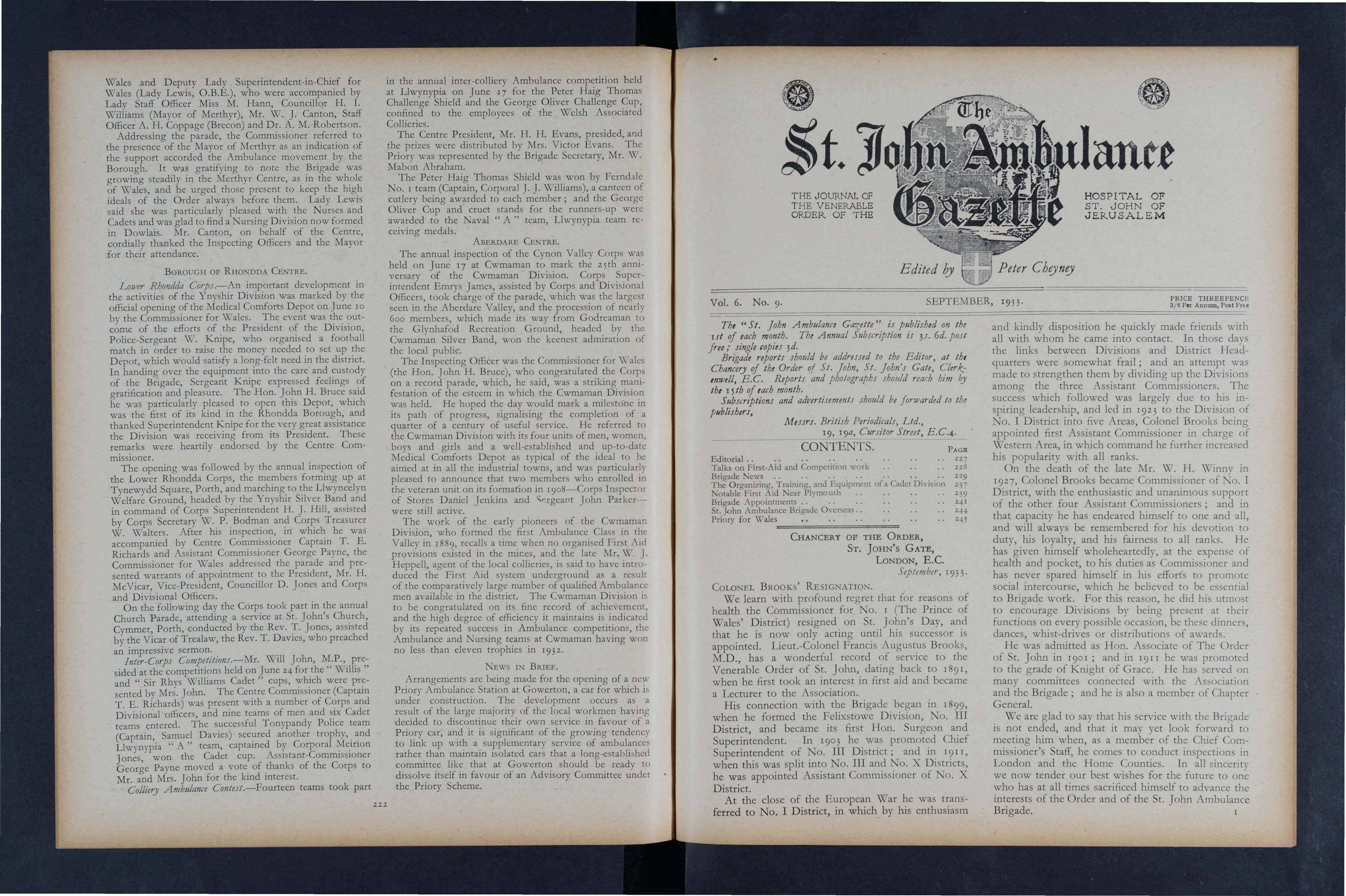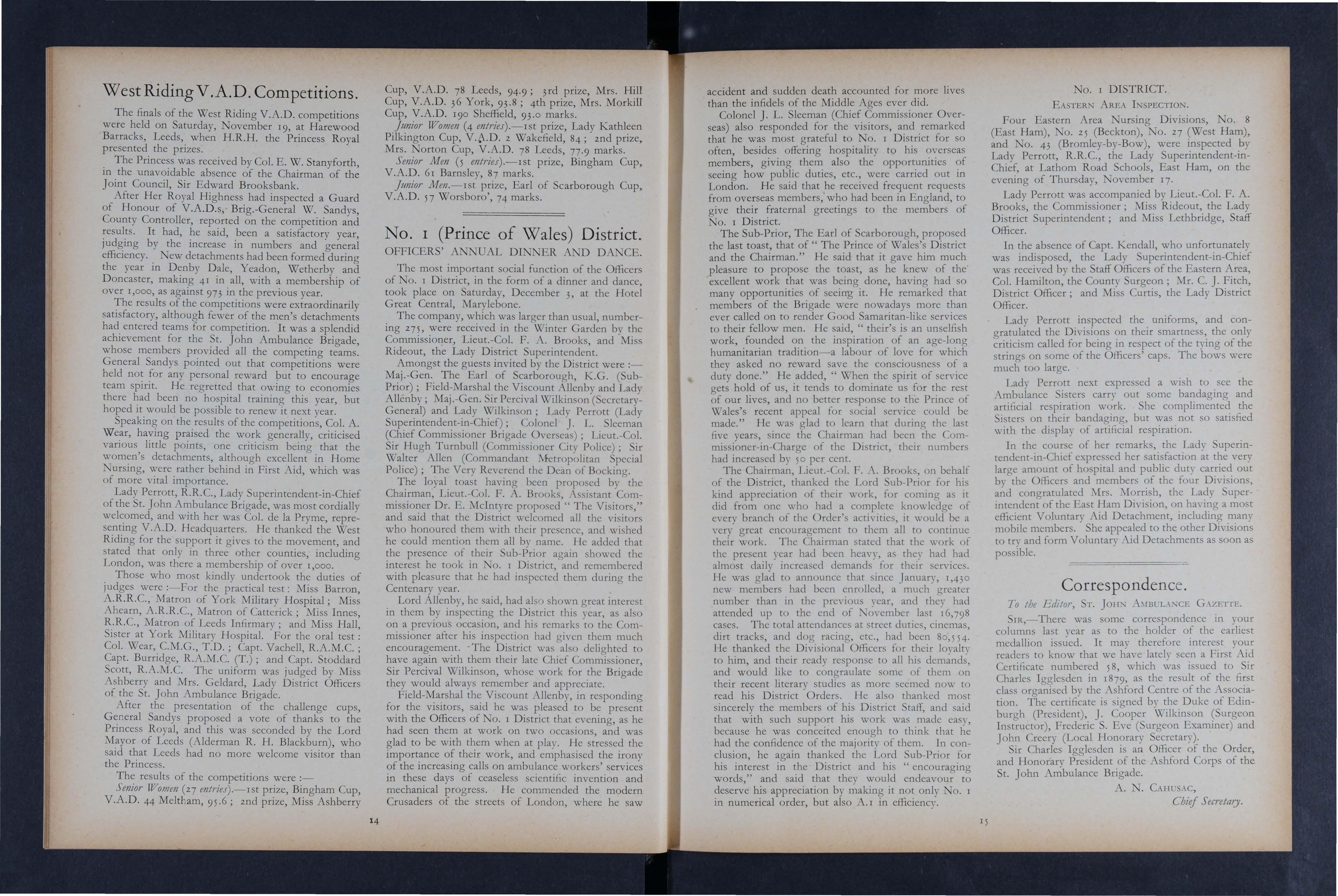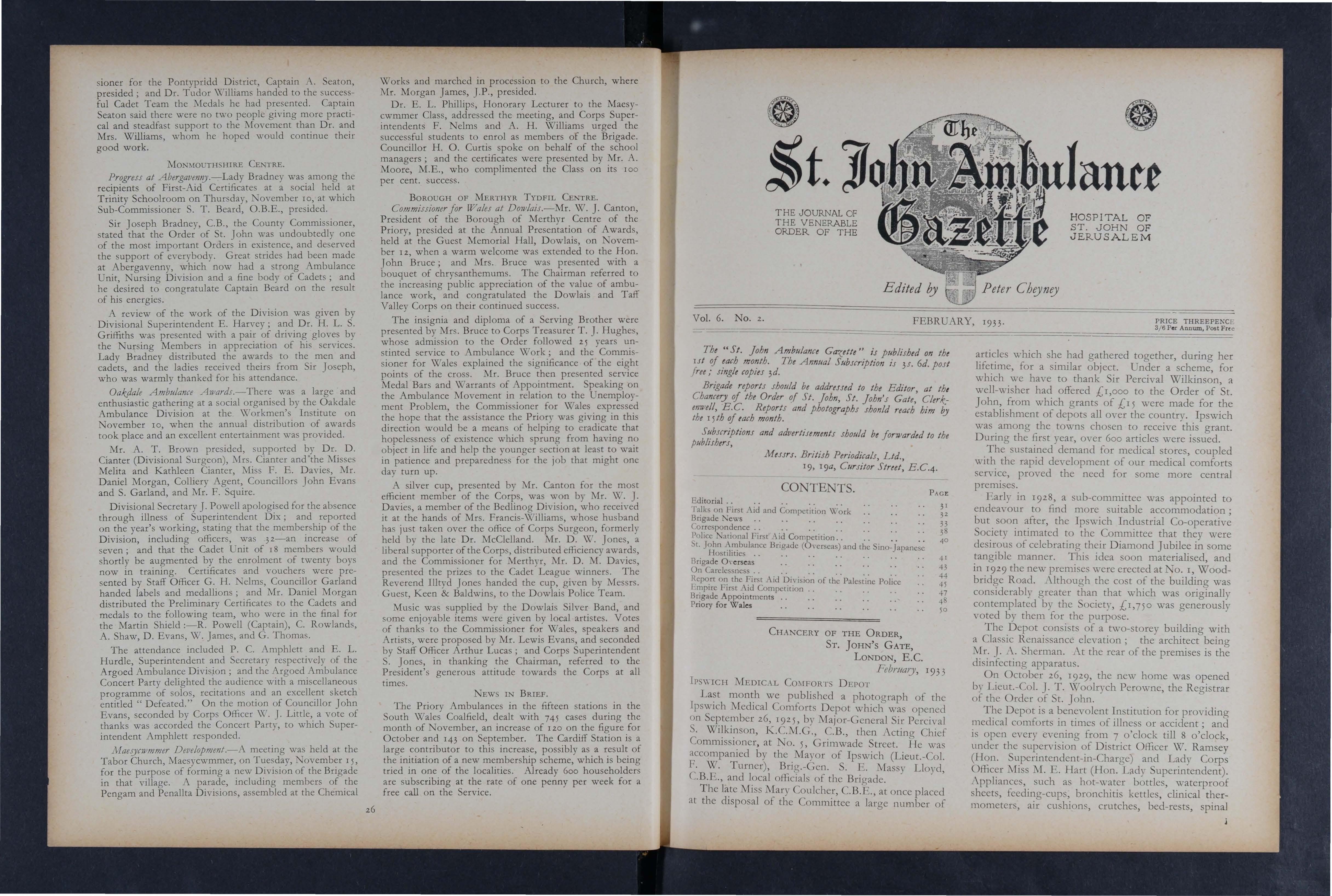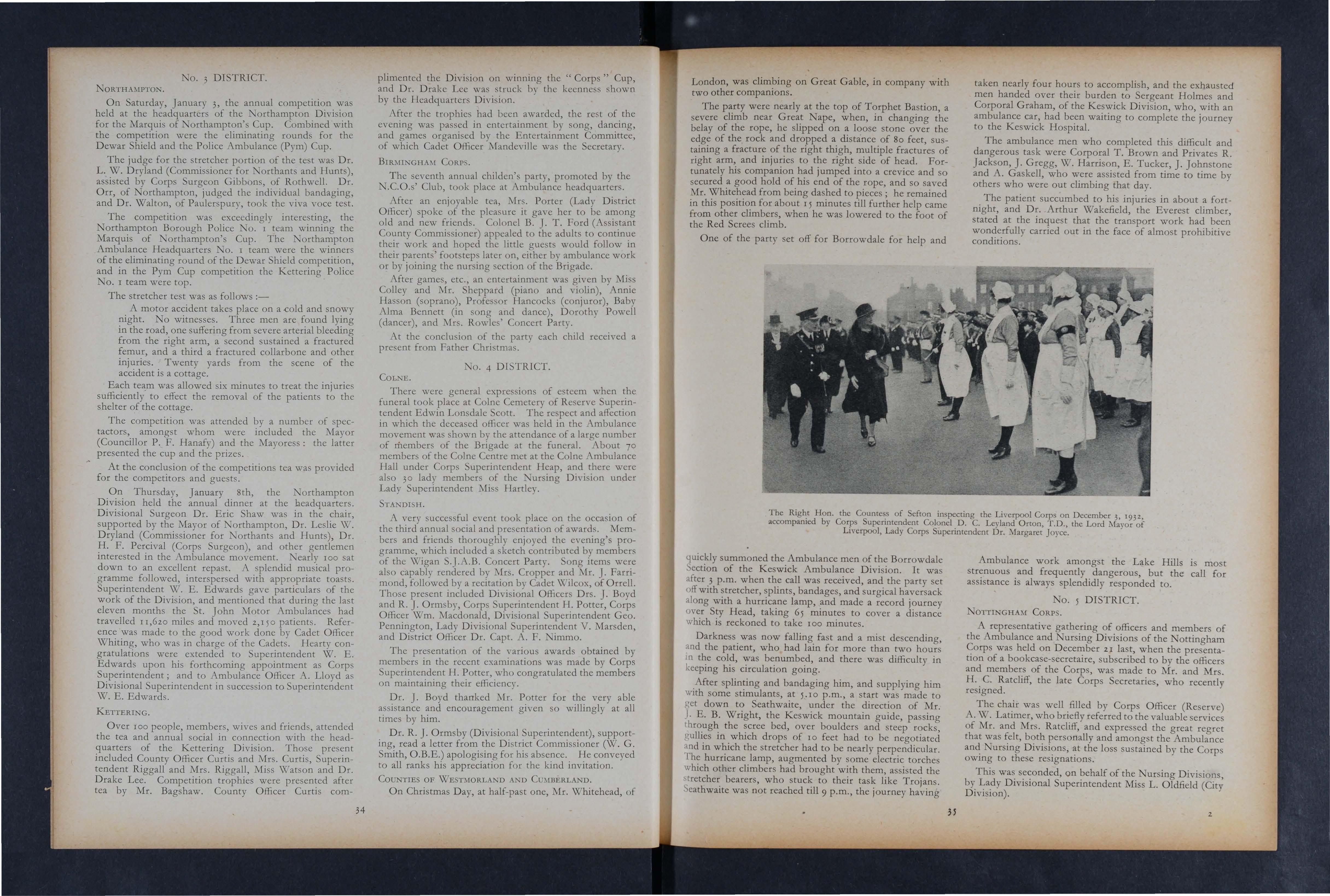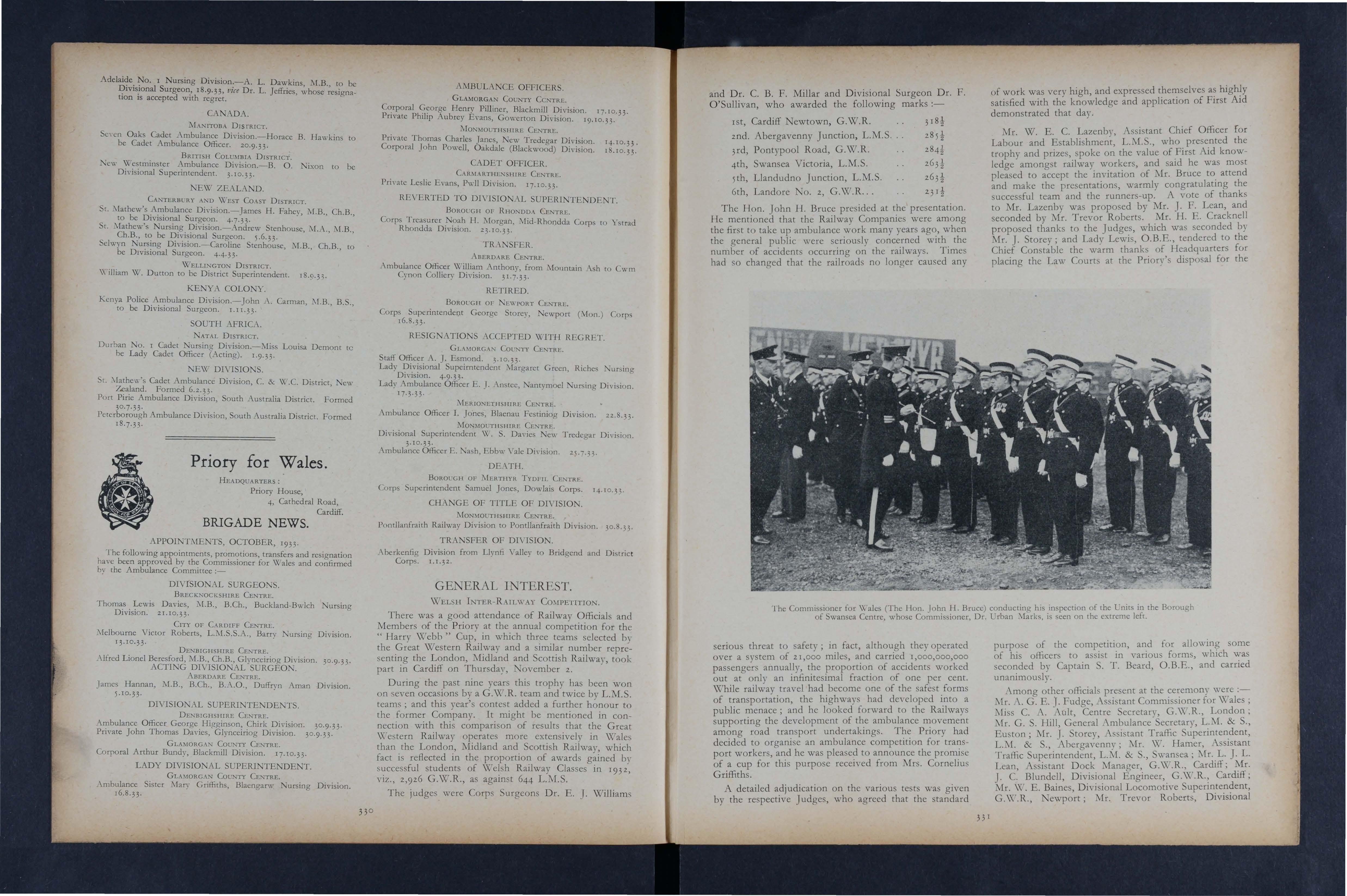 On October 14, the Corps held its Annual Presentation of Awards at the Brithdir Ambulance Hall, where Dr. S. B. Turner, the popular Surgeon of the Bargoed Division, presided. In the absence of the Principal Secretary, the Priory was represented by the Assistant Secretary, Miss V. Lovett, who presented Diplomas of a Serving Brother