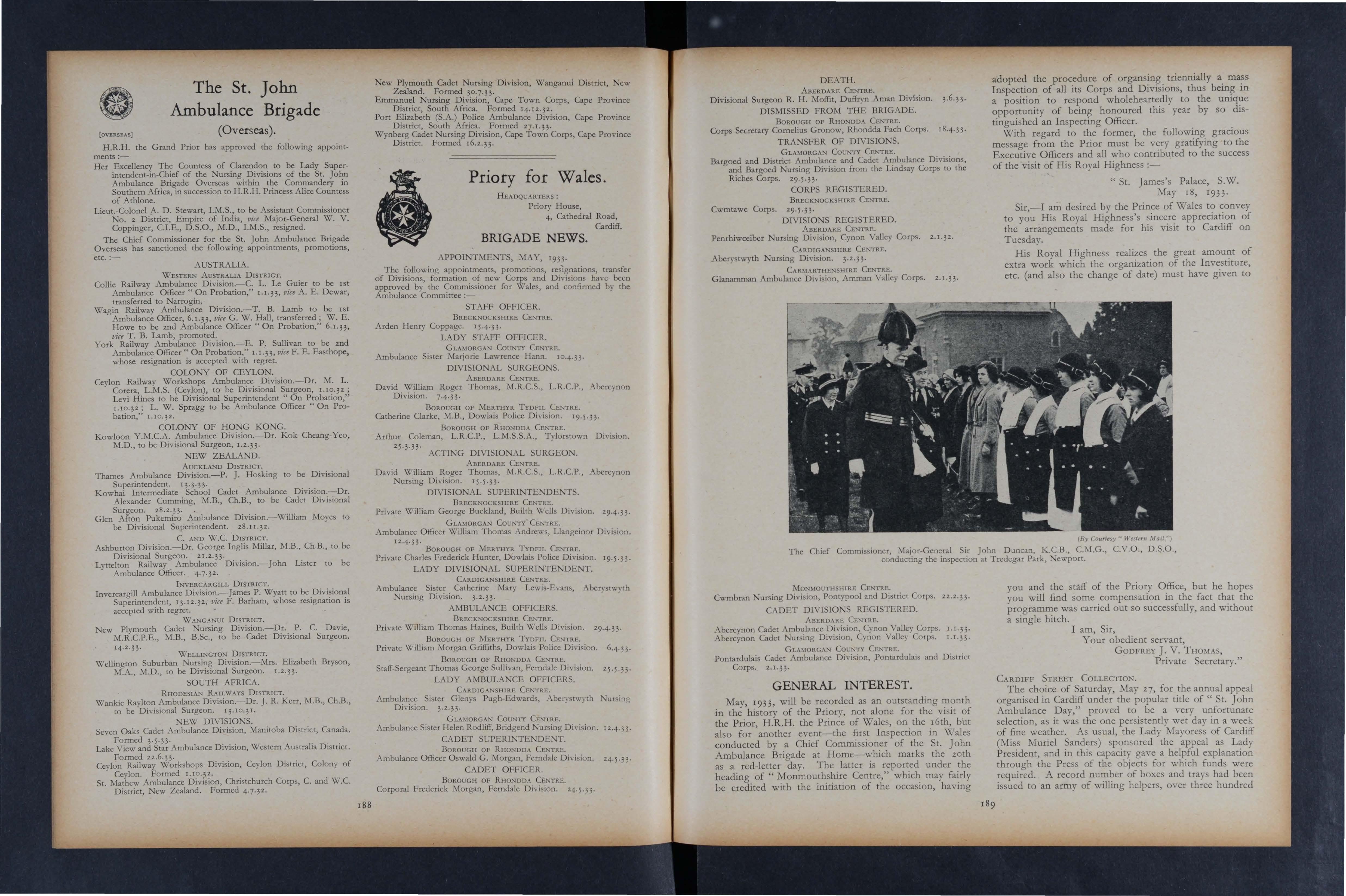 Dr. Rocyn Jones needs no introduction to Ambulance workers. He also is a representative Knight of Grace on Chapter and has been closely identified with the Priory in his former capacity as Commissioner for Monmouthshire, and as a member of Headquarter Committees; and before the inception of the Welsh Priory Dr. Jones's name was prominent in the Ambulance Movement