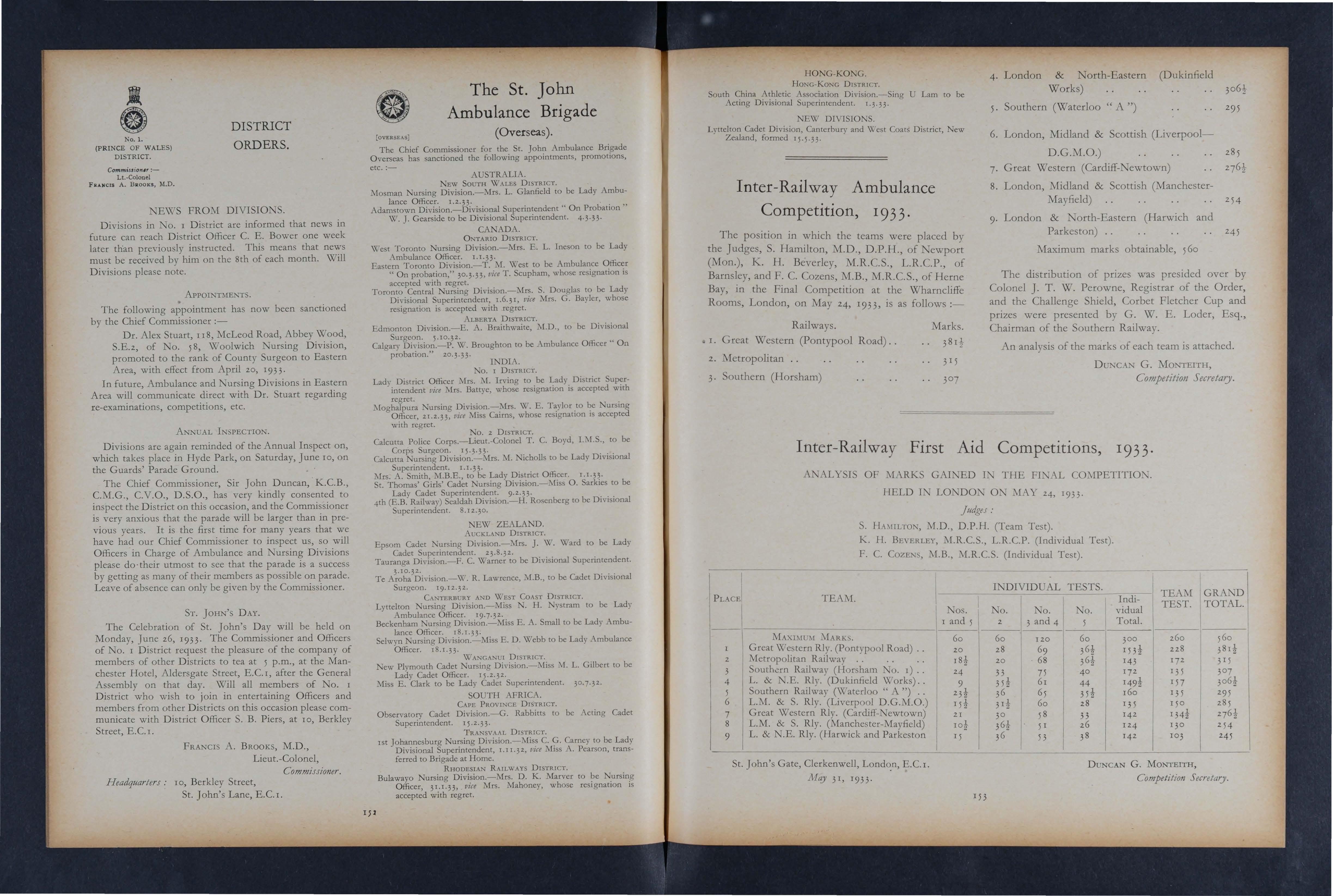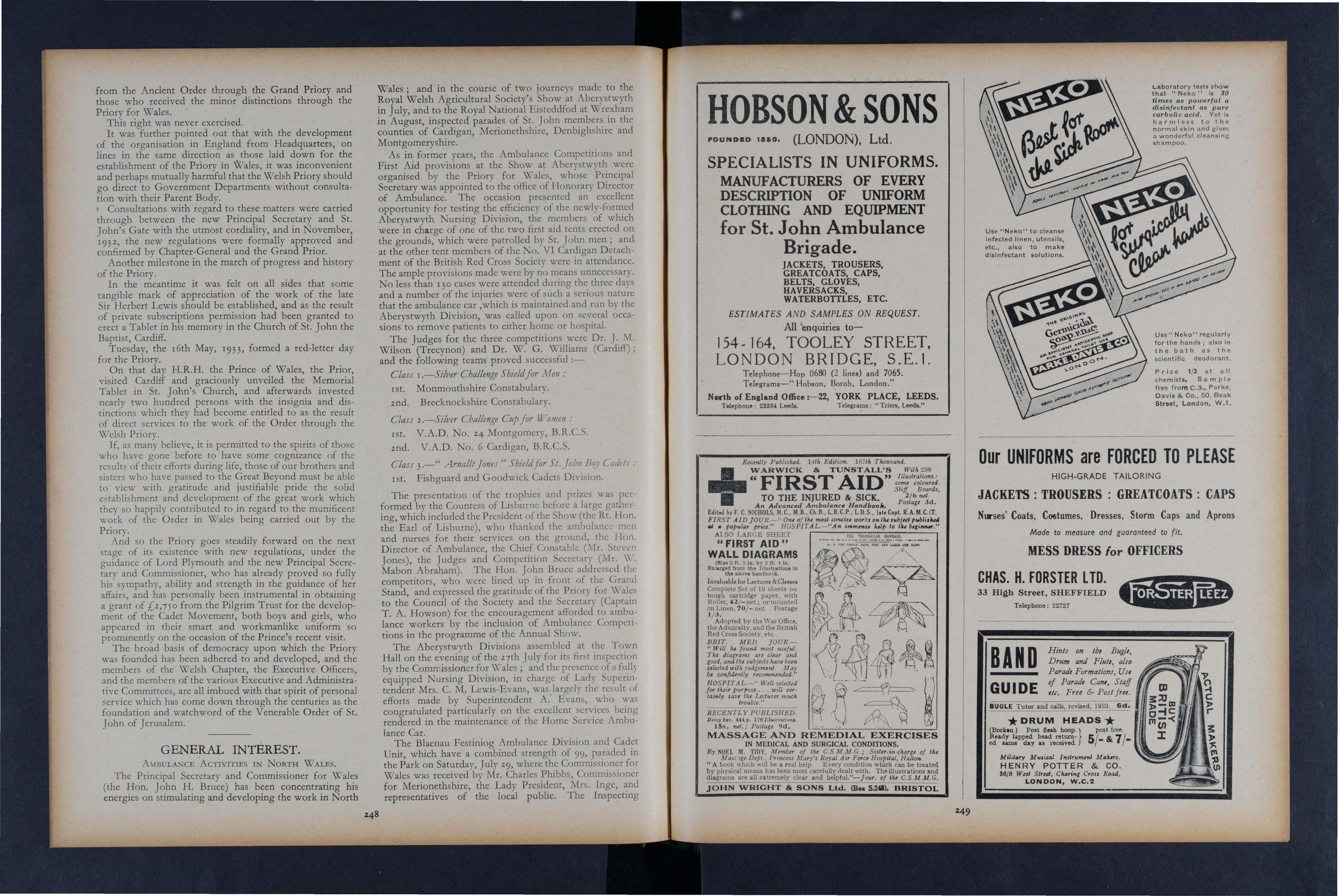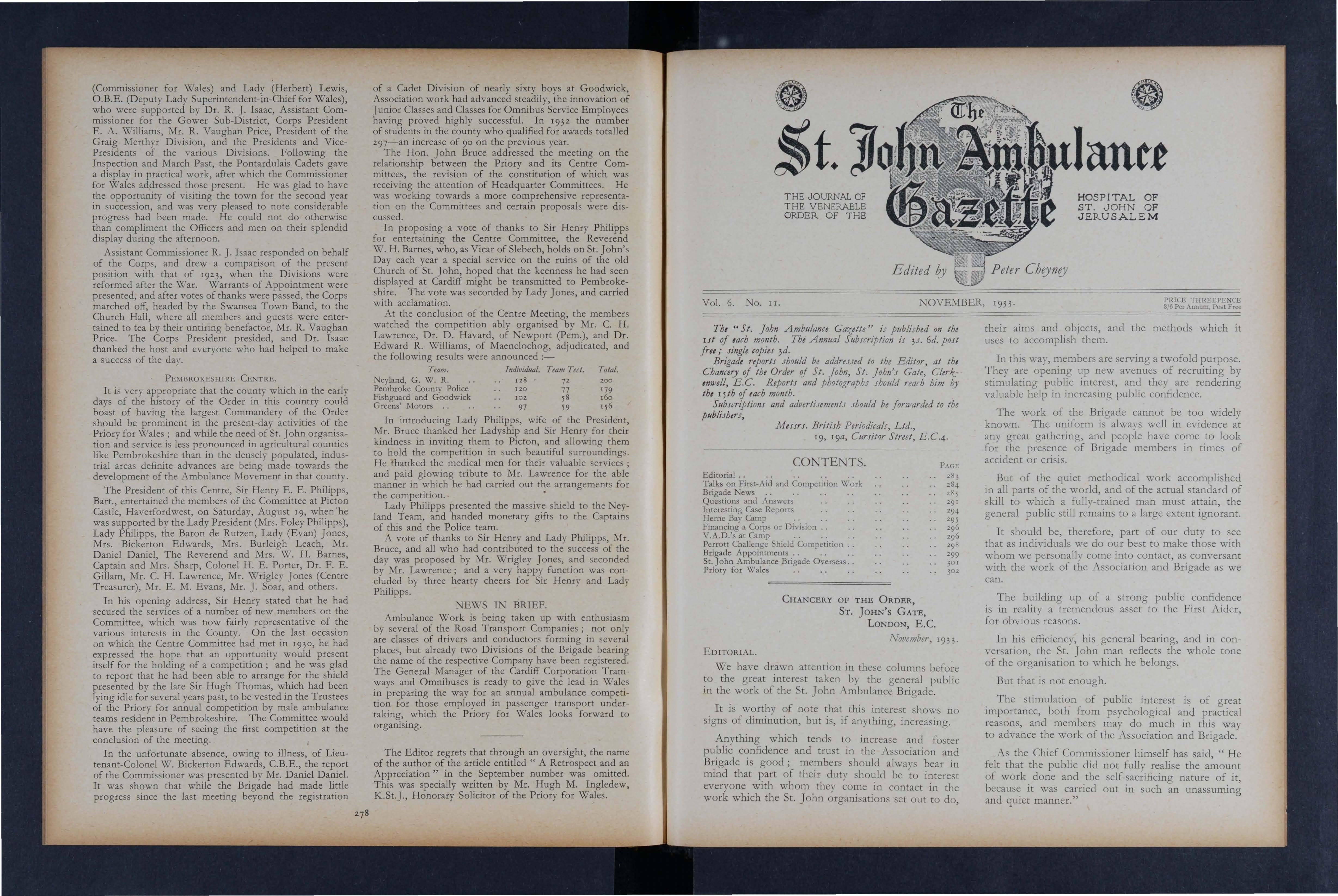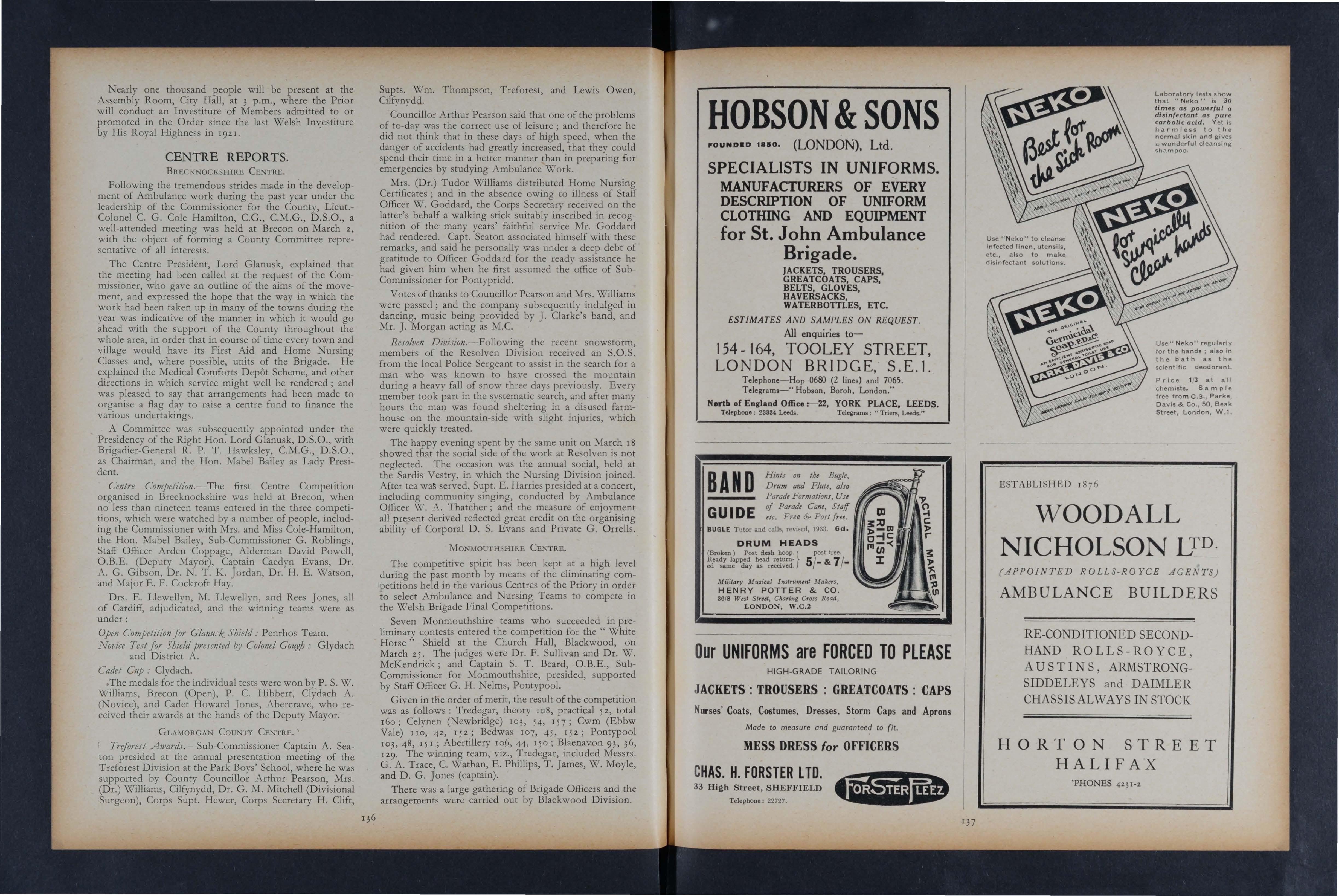 The Commis sioner is the chief executive officer of the Priory in the Centre; and is responsible for all work in connection with the St. John Ambulance Association and St. John Ambulance Brigade in the area. There is considerable scope for development in the County of Cardigan, where the total number of successful students in 1932 totalled 282; and the Brigade is represented by two very strong Ambulance and ursing Divisions at Aberystw yth. According to the activity which has followed the appointment of the Chief Constable in certain other Centres, Mt. Steven Jones's acceptance of office may well be regarded as the harbinger of progress in the Ambulance Movement in Cardiganshire, particularly as the Chief Constable is keenly interested in the work, with which he has been personally identified as Honorary Secretary of the To 8 Di strict for the Police Ambulance Competition
