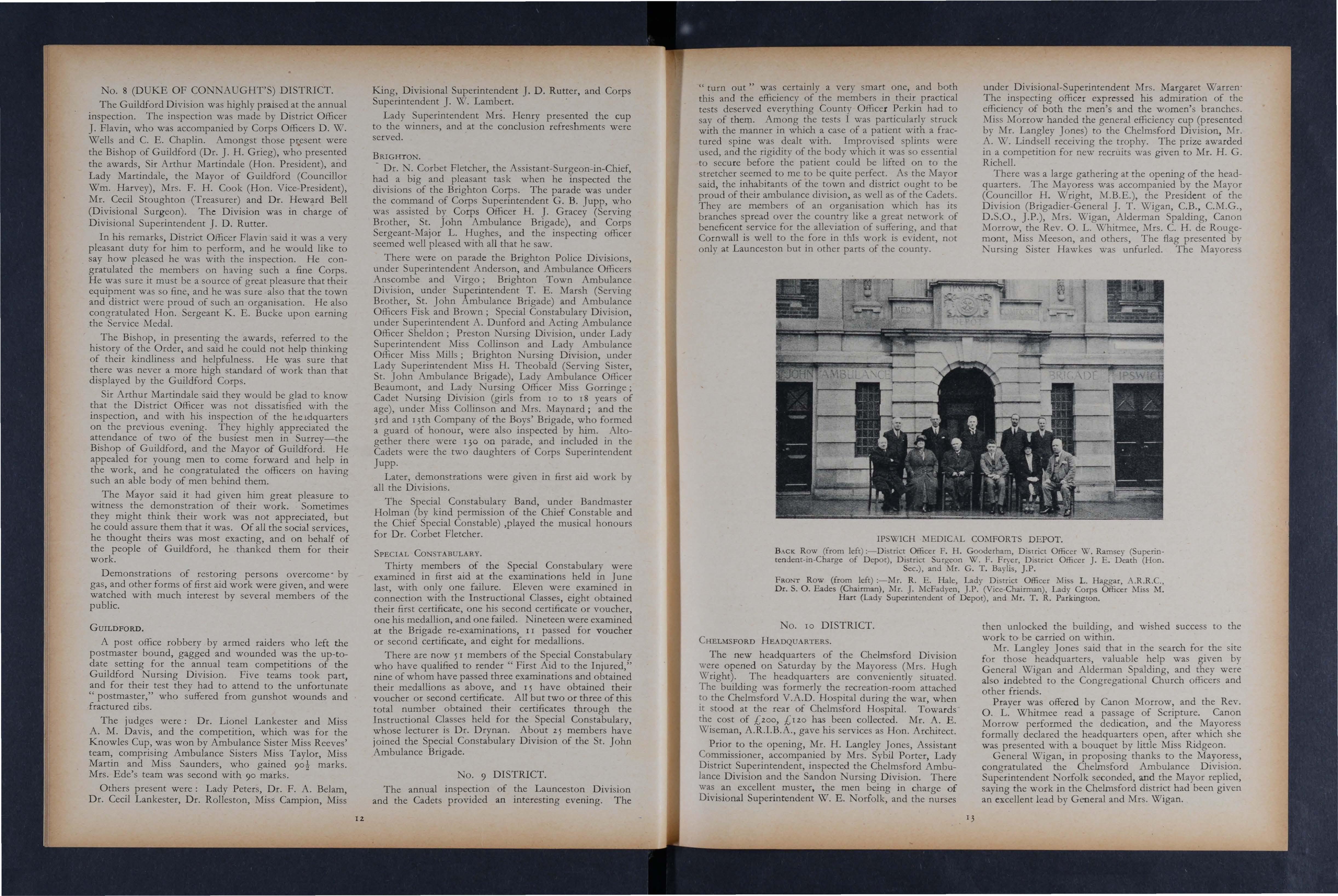 In conjunction with the annual social by the Bargoed Ambulance and NurSIng DlvlSlons, which took place at the Church. Hall on November. 4, the Commissioner for Wales Inspected the NurSing Division, which was unavoidably abse.nt from Inspection held previously; and the Actlng Lady Superintendent, Mrs. S. B Turner, was warmly mented on the excellent work being carried on by this Unit which has formed a Voluntary Aid Detachment and 'maintains a particularly efficient Medical Comforts Depot housed at the residence of A. M ..Deacon, whose unsparing services in the of the Sick poor in the district have earned the of the town. Divisional Surgeon S. B. Turner presIded; and the Hon. John H. Bruce, who preser:ted to Corps Officer \Y./. Regan his as a SerVing Brother, gav e an inspiring addr ess, whIch made feel It an honour and a privileg e to be assocIated WIth the Order.