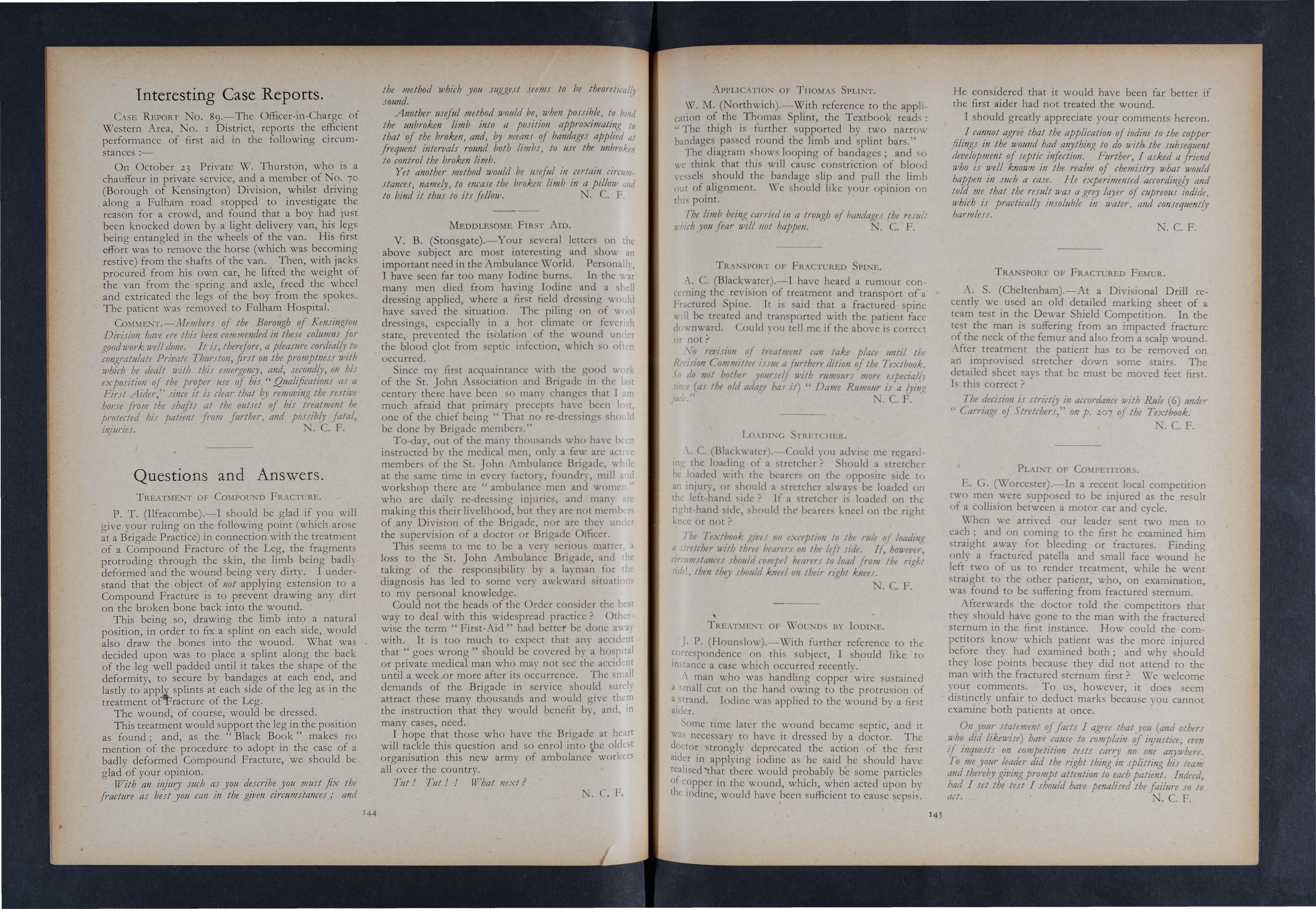 "The Manual, page 10, para. 5, says: 'The position assumed by the patient must not be thoughtlessly altered.' As a First Aider, I have carefully examined the patient and made my diagnosis; I know the instructions and treatment given in the Manual; am I not therefore able to decide the best possible position for the patient? " Knowing the ' questioner, his capabilities and failings (and, truth to relate, to gain a little time), my reply was" That instruction is not intended to apply to efficient First Aiders." Instantly the retort came, "Why not? I understood that everything in the Manual applies to the work of all First Aiders."
