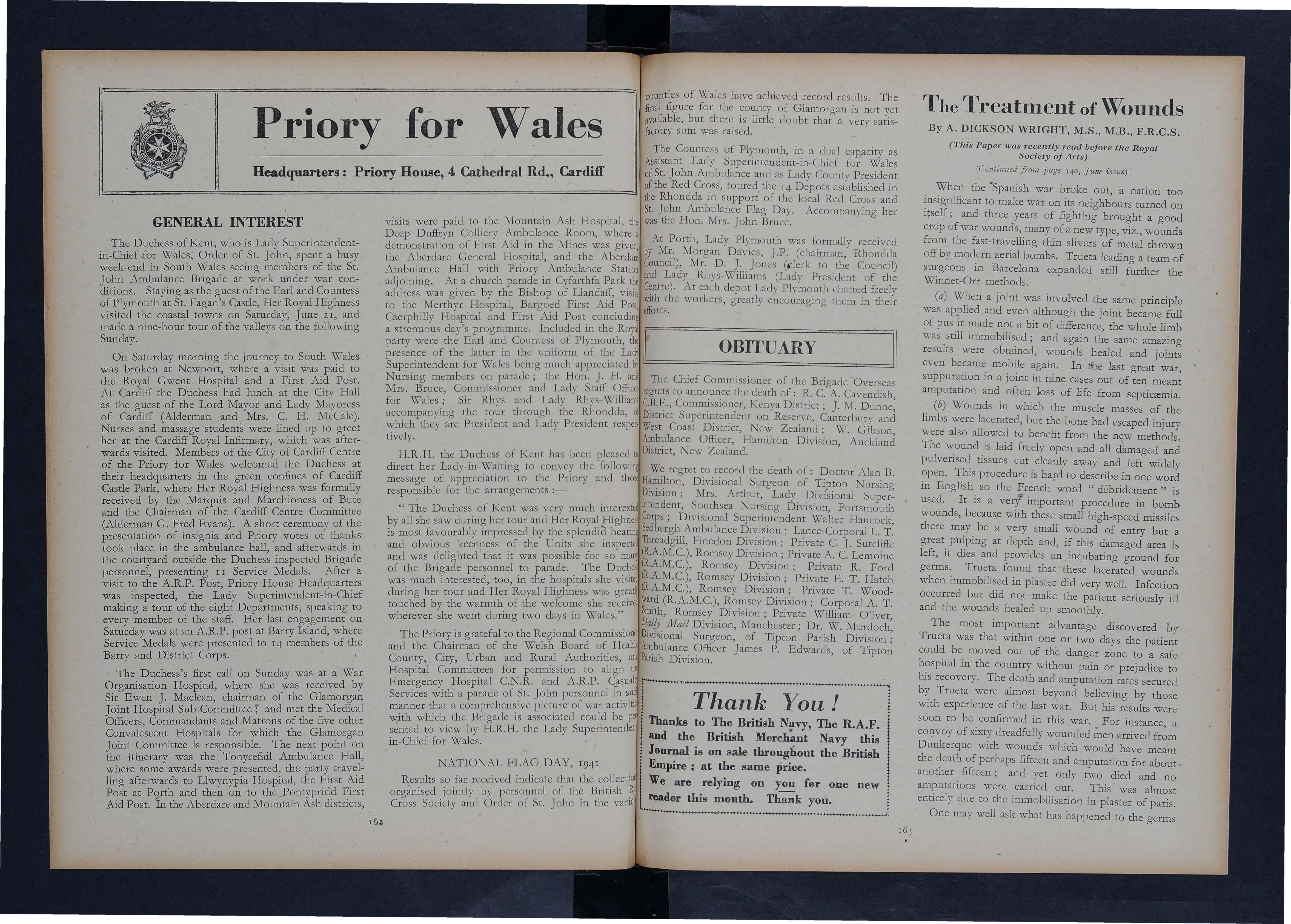Dr. D. Rocyn Jones, e.B.E., J.P., presiding as Director of Ambulance at the monthly meeting of the Priory for Wales, held at Priory House, Cardiff, on Tuesday, November 25, extended a welcome to the Hon. Mrs. Alastair Cooper and Mrs. A. W. Anderson. Mrs. Cooper is Lady President of the Brecknockshire Centre and County Controller of Voluntary Aid Detachments in the County. Mrs. A. W. Anderson, wife of the Surgeon-in-Chief, needs no introduction to Ambulance Units in the Ogmore Vale area particularly, as they have benefited by her ).l1ost generous support of all their activities for many years.