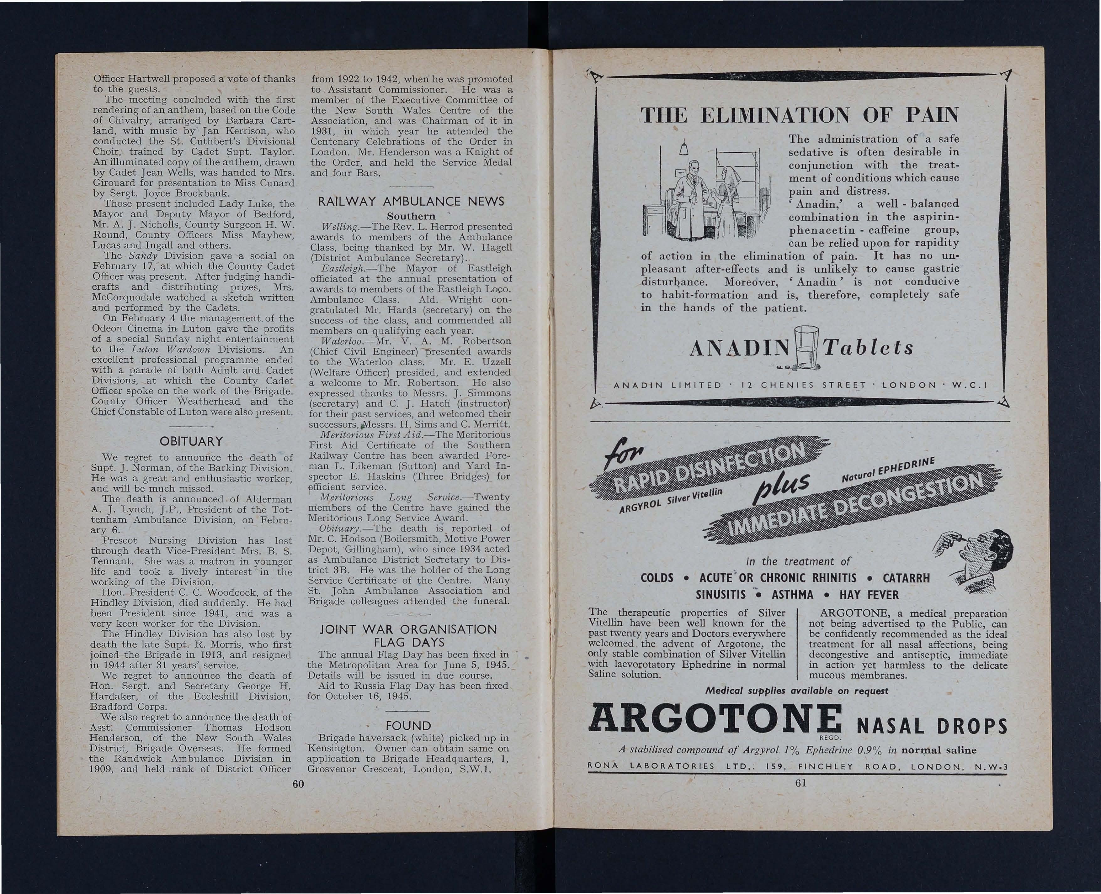 We regret to announce th e death of Robinia, Viscountess Mountgarret, which occurred o n D ecember 13 Lady Mountgarret was well knClwn in Ambulance circles, especially in Yorkshire and . London . She was af>pointed Lad y District Officer, Midland Area, West Riding of Yorkshire, on May 4, 1923, and wa:s also Vice-President of the Bradford Area, S. J A.A In 1928 she transfeliTed to the Londo n (No.1) District, being appointed to Western Area on Jun e 22, 1933. D&ring 1939 she was placed on the Reserve when s h e left London On March 3, 1942, she a ccepted the Vice-Presidency (Nursing 5