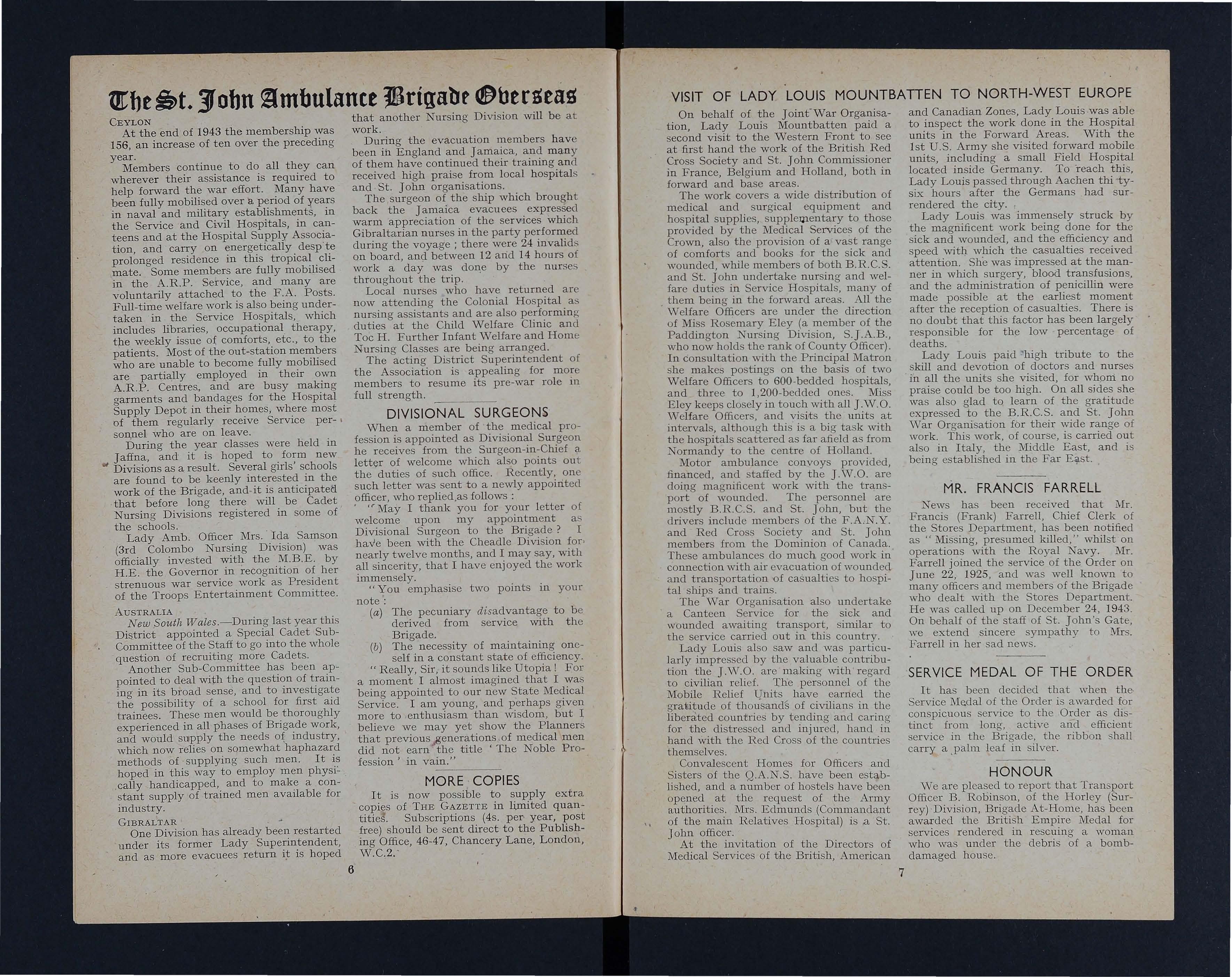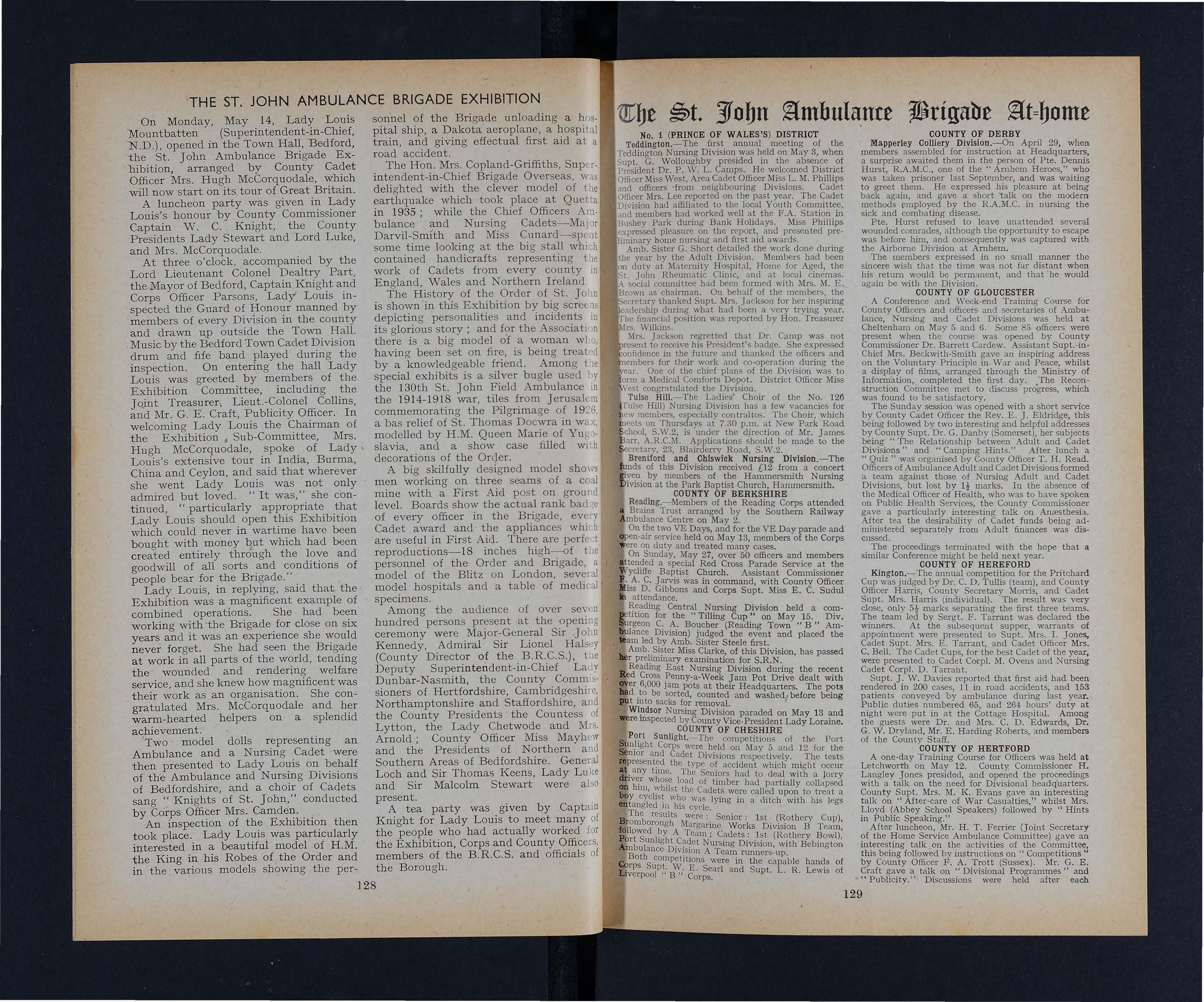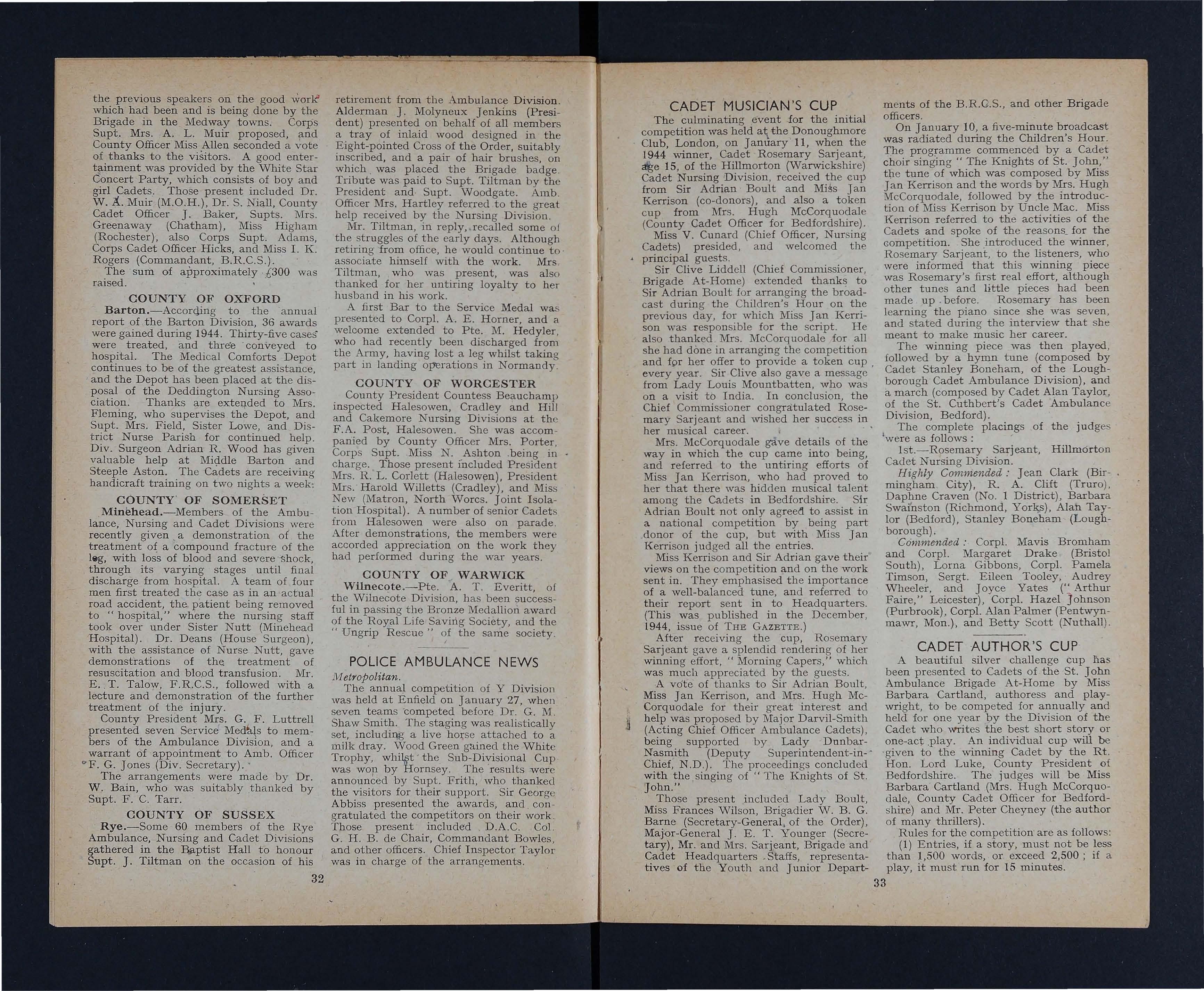 Divisions) for W.R Yorks hire , and in D ecember, 1943, b ecame County Cadet Offic er. On Feb ru a ry 16, 1934 , she was appointed Dame Grand Cro ss of the Order, having gained the Service Medal in 1932 . Her other activities Organiser and Administrator of the Mountgarret Hospital, Chairman of the Ladies' Linen Guild of the Order, and was County Controller for Middlesex V.A.D.s for many years. Lady Mountgarret will be greatly missed , a nd th e Brigade has lost a good friend.