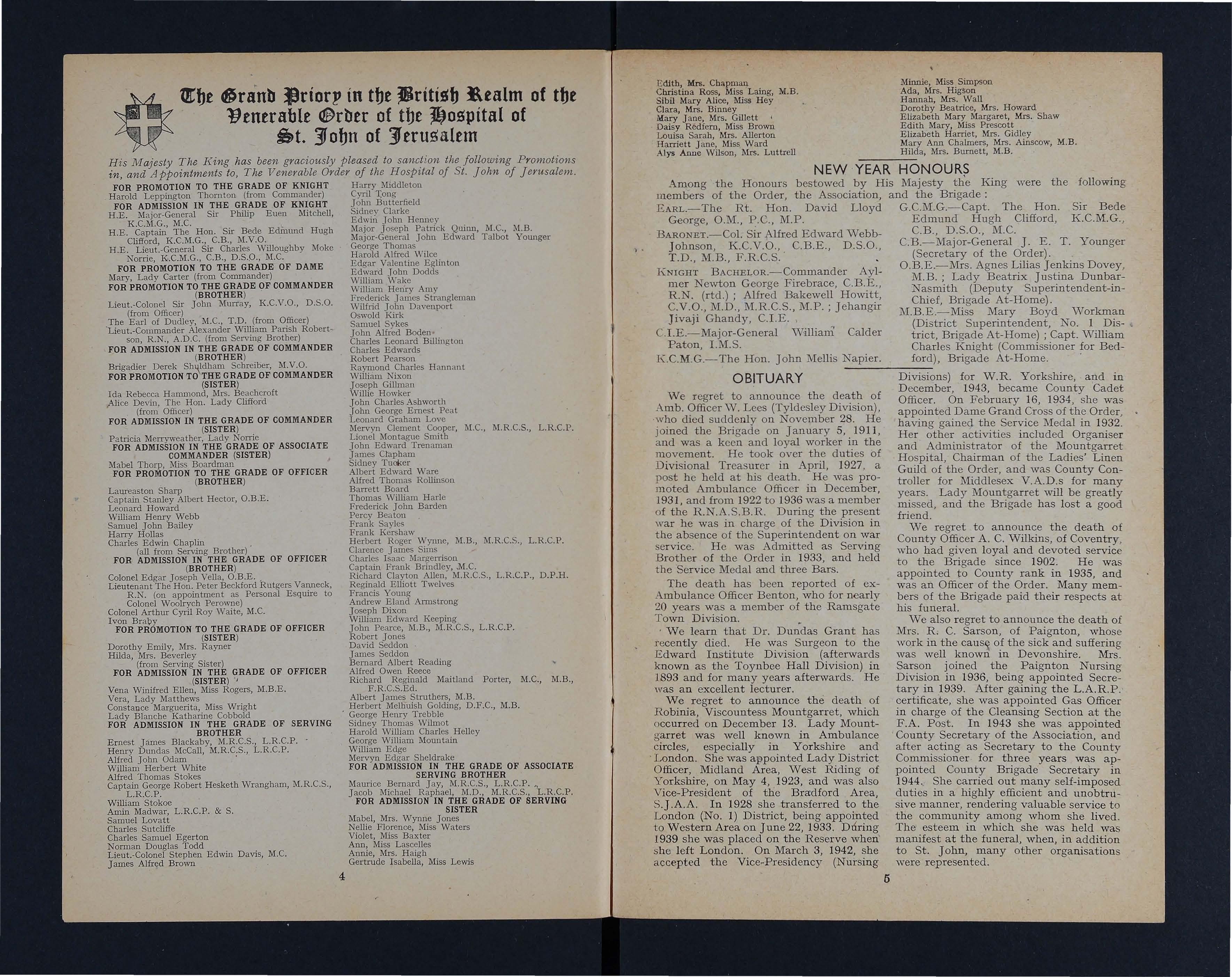 Hilda , Mrs. Beverley J ames Seddon (from Serving Sister) Bernard Albert Reading FOR ADMISSION IN THE GRADE OF OFFICER Alfred Owen Reece (SISTER) Richard Reginald Maitland Porter, M.C., M B., Vena Winifred Ellen, Miss Rogers, M.B .E. F RCoS.Ed Vera, L ady Mattbews AllDert J ames M.B.