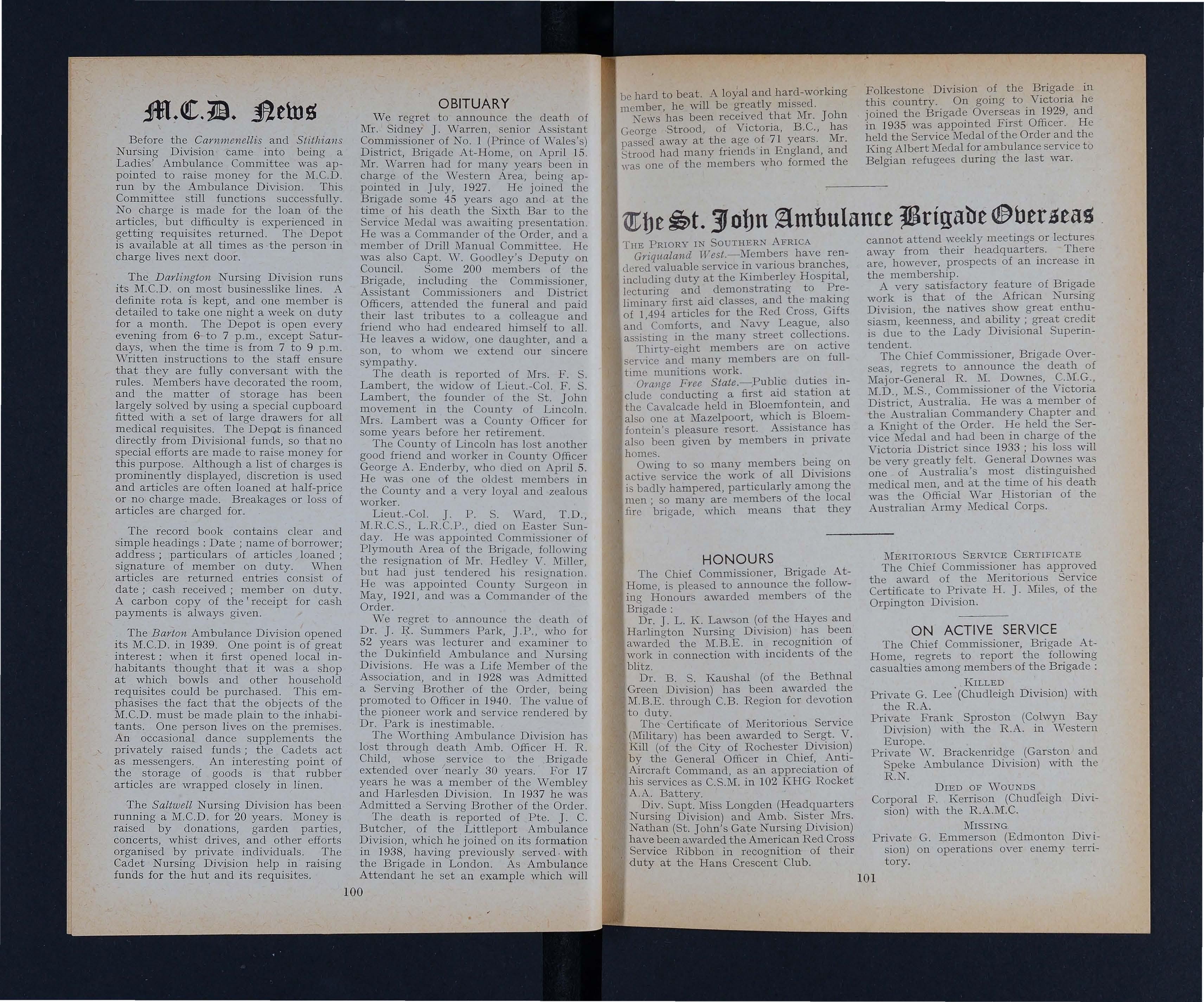 During the evacuation members have been ih England and Jamaica, and man y of them have continued their training and received high praise from local hospitals and ·St. John organisations.
