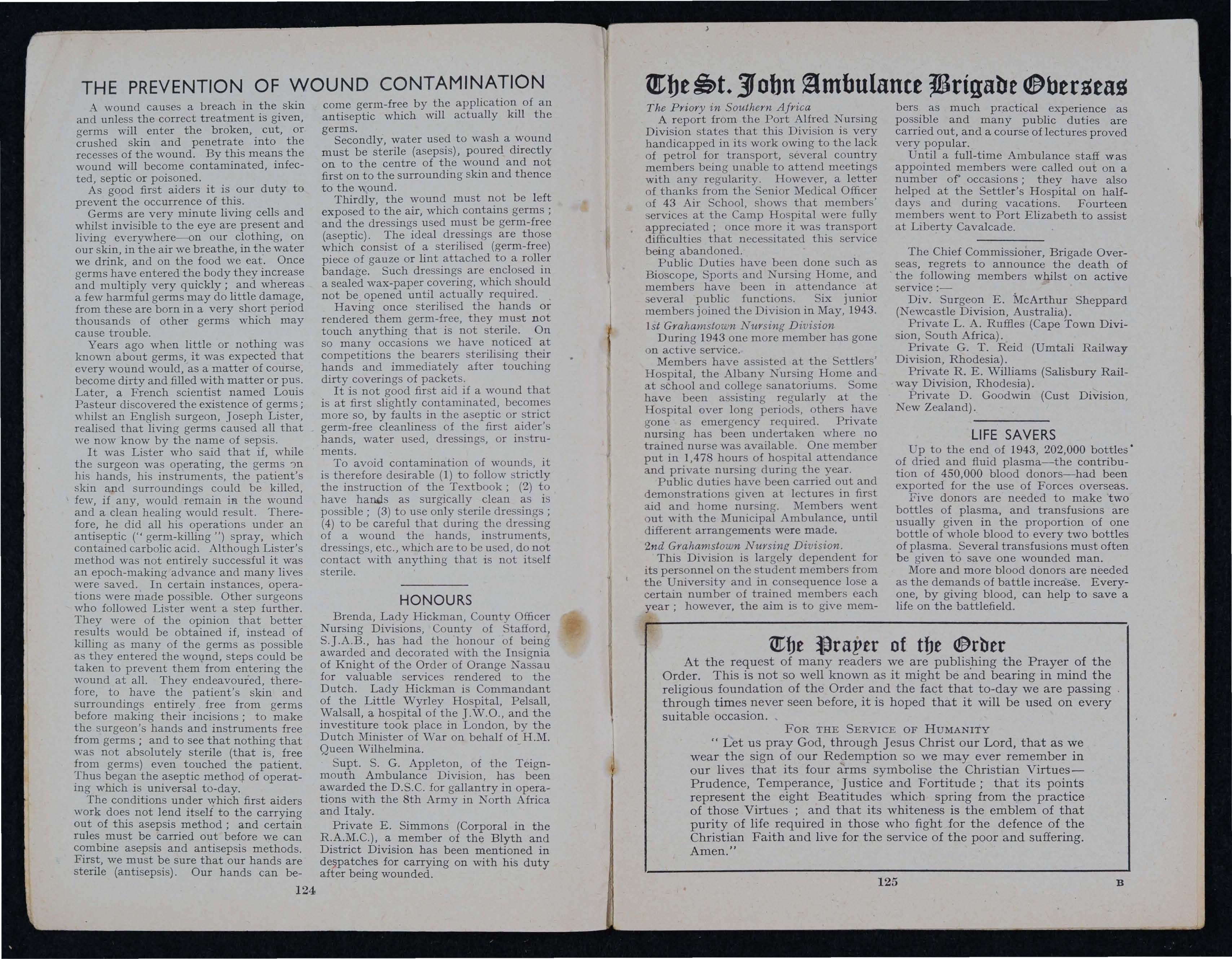 It was Lister who said that if, while the surgeon was operating, the germs jn his hands, his instruments, the patient's skin and surroundings could be killed, few, if any, would remain iR the wound and a clean healing would result. Therefore, he did all his operations under an antiseptic (" germ-killing") spray, which contained carbolic acid. Although Lister's method was not entirely successful it was an epoch-making advance and many lives were saved. In certain instances, operations were made possible. Other surgeons who followed Lister went a step further. They were of the opinion that better Brenda, Lady Hickman, County Officer results would be obtained if, instead of Nursing Divisions , County of Stafford, killing as many of the germs as possible S.J.A.B., has had the 'honour of being as they entered the w01,md, steps could be awarded and decorated with the Insignia taken to prevent them from entering the of Knight of the Order of Orange Nassau wound at all. They endeavoured, there- for valuable services rendered to the fore, to have the patient's skin and Dutch. Lady Hickman is Commandant surroundings entirely free from germs of the Little Wyrley Hospital, Pelsall, before making their incisions; to make Walsall, a hospital of the J .W.O ., and the the surgeon's hands and instruments free investiture took place in London, by the from germs; and to see that nothing that Dutch Minister of War on behalf of H.M. was not absolutely sterile (that is, free Queen Wilhelmina.from germs) even touched the patient. Supt. S. G. Appleton, of the TeignThus began the aseptic method of operat- mouth Ambulance Division, has been ing which is universal to-day. awarded the D.S.C. for gallantry in operaThe conditions under which first aiders tions with the 8th Army in North Africa work does not lend itself to the carrying and Italy. out of this asepsis method; and certain Private E. Simmons (Corporal in the rules must be carried out before we can R.A.M.C.), a member of the Blyth and combine asepsis and antisepsis methods. District Division has been mentioned in First, we must be sure that our hands are for carrying on with his duty sterile (antisepsis). Our hands can be- after being wounded.