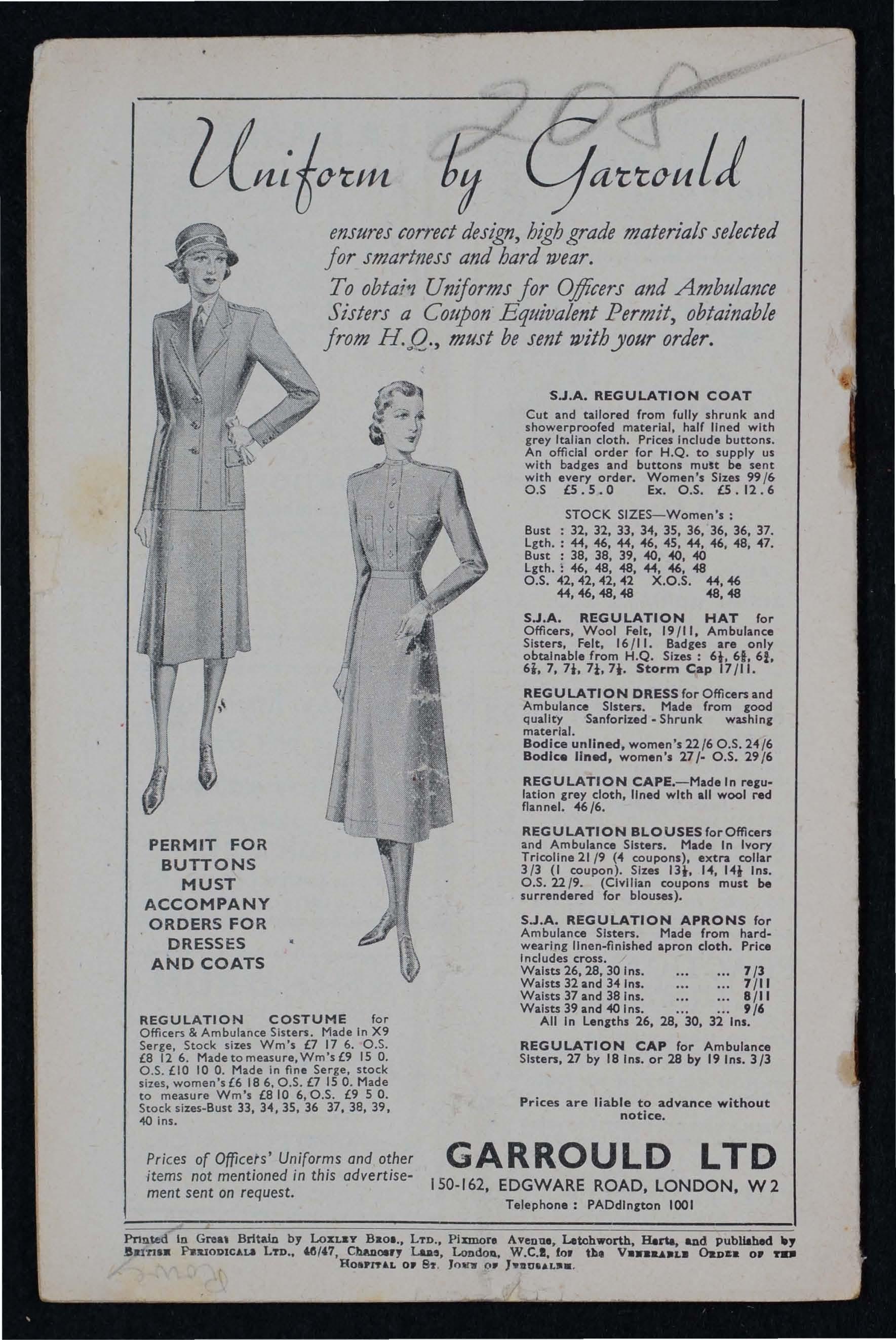To Uniforms for Officers and Ambulance Sisters a Coupon Equivalent Permit, obtainable from H."Q., must be sent with your order.