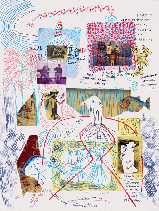Imagem dentro: portais ao presente/ re-encontros Guarani, Xetá, Kaingang, 2021. Acrílica e colagem sobre tela.