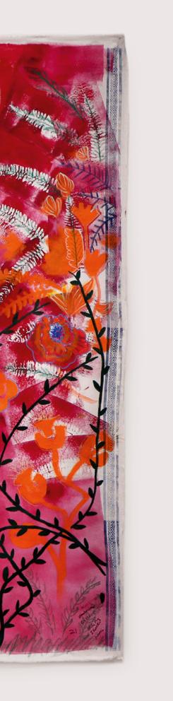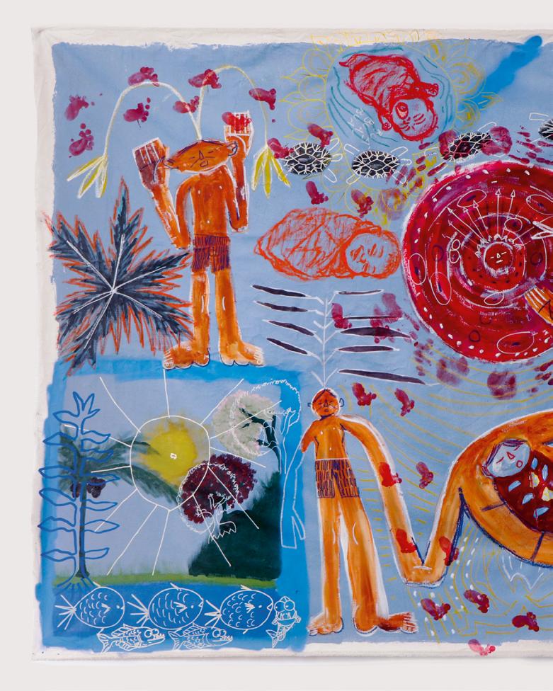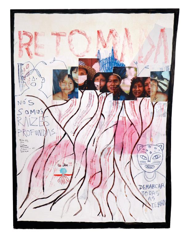 Denilson Baniwa, Gustavo Caboco, Camila dos Santos, Thaís Krîg, Indiamara Paraná, Nycolas André Paraná Pereira, Juliana Kerexu, Elida Benites, Ricardo Werá, Flavio Karaí, Roseane Kerexu Mirim Mariano, Lucilene Wapichana. Nós somos raízes profundas, 2021. Acrílica e colagem sobre tela.