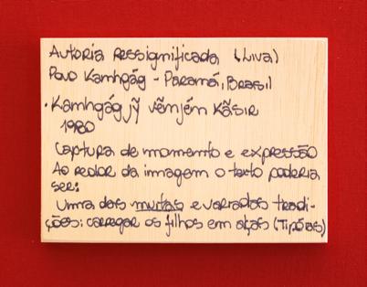 Além dessas informações, os objetos também foram apresentados a partir da perspectiva dos artistas e convidados: sob a forma de outras legendas, que não abandonaram completamente a lógica museal — pelo contrário, brincaram com ela, parodiando-a. Isto é, se as “legendas do museu” foram feitas sobre madeira gravada, as novas legendas também apresentavam-se sob o mesmo tipo de suporte, mas com as informações registradas à mão, trazendo dados revelados nos encontros, denúncias, críticas ou signos não alfabéticos. Ambas as legendas foram posicionadas juntas. Nessa operação de pôr lado a lado perspectivas distintas sobre o mesmo acervo, ficaram visivelmente manifestos os pontos de conflito e os diferentes graus de relação daqueles sujeitos e da instituição em relação com o objeto.