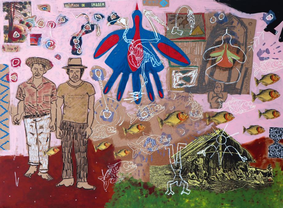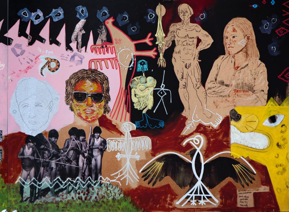 Re-encontros: Como o povo Ka’apor veio parar no Paraná?, 2021 Acrílica e colagem sobre tela.