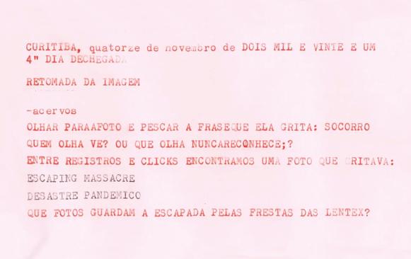 Na palavra “retomada” está implícita a ideia de roubo. Retomada. É necessário localizar nossa conversa num cenário de desordem, de luta, de conflito num sentido amplo. Retomada. Nossas vidas, terras, saberes e também nossas imagens, as indígenas, sistematicamente foram tomadas pelo “outro”. Retomada. Autoestima, da saúde, da nossa presença. Retomada. Retomada.
