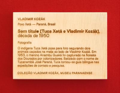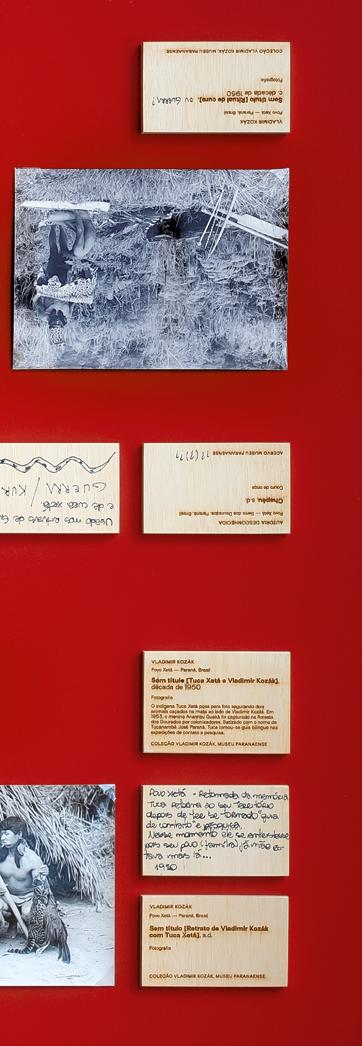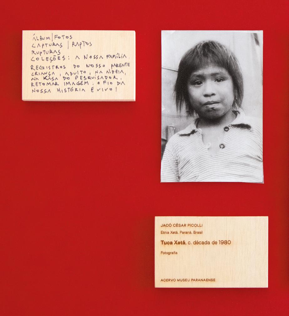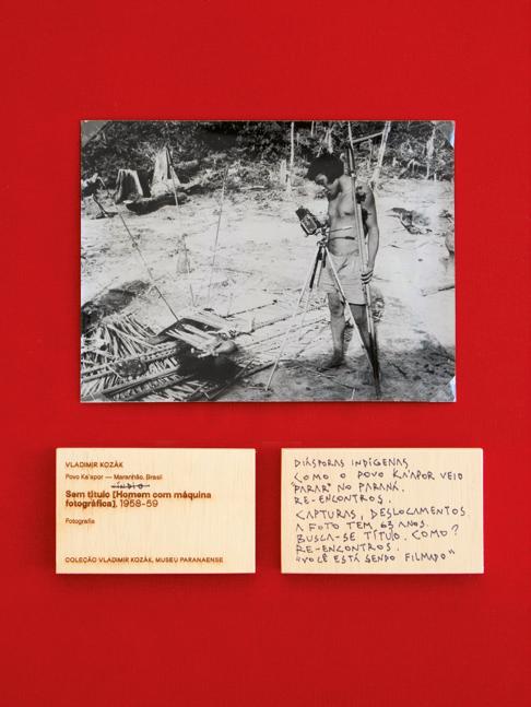 Elas eram ou poderiam ser muitas coisas: informações despadronizadas sobre o contexto ou os retratados; pensamentos dos fotógrafos ou dos correspondentes (de intelectuais e/ou indigenistas que remetiam essas imagens uns para os outros); anotações feitas por agentes museais diversos, com sobreposições de diferentes épocas. Existia também a possibilidade — sobretudo para o caso dos acervos Xetá, os quais são encontrados com certa regularidade pelos seus herdeiros culturais — de novos dados terem sido agregados aos registros contendo informações veiculadas pelos mesmos. Enfim, a ideia que essa decisão surtia era basicamente de que a “legenda do museu” é uma miríade de possibilidades, discutidas a cada ocasião de se expor determinado acervo. Embora essas reflexões tenham sido atiçadas e gerassem, do ponto de vista interno, uma problemática relevante, definiu-se que na referida exposição a oficialidade institucional da informação seria representada, na maioria dos casos, pelas anotações do verso ou outras modalidades de inscrição que foram acessadas nas imagens físicas pelos convidados e artistas.