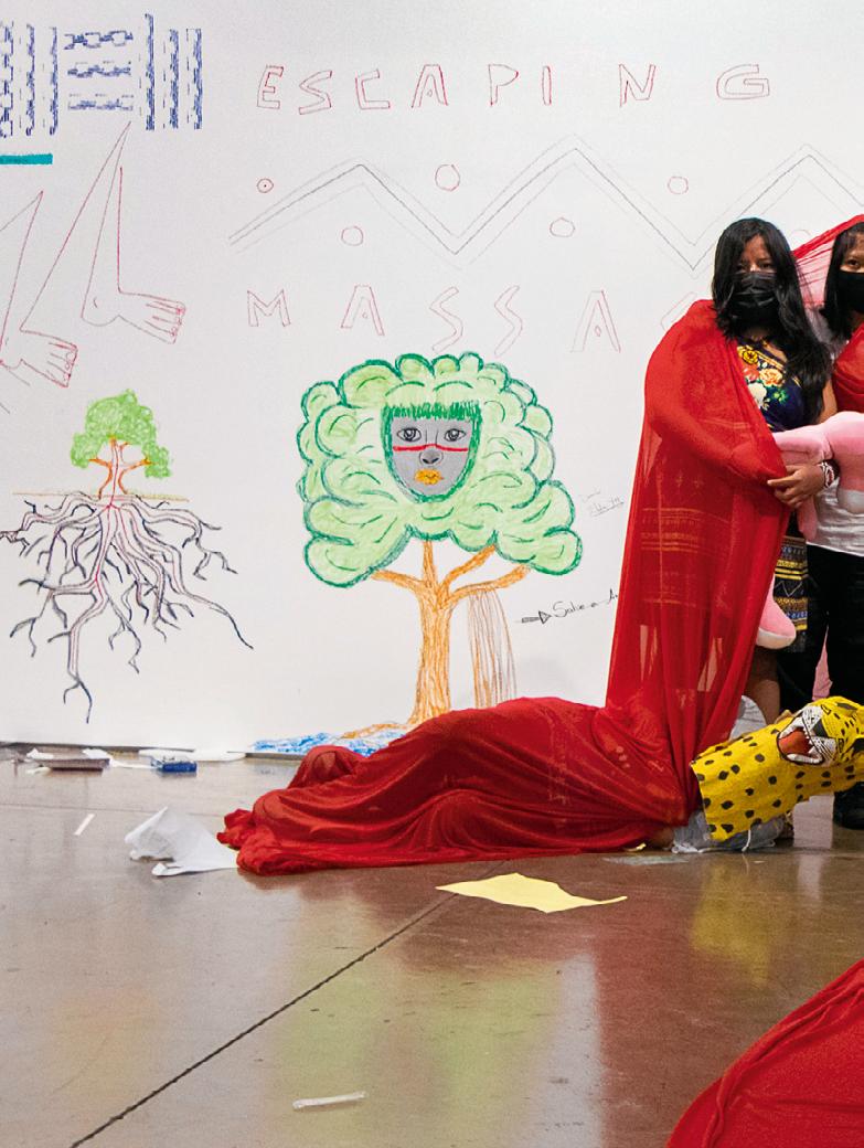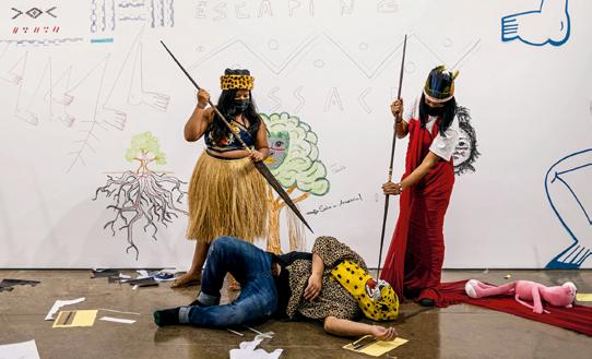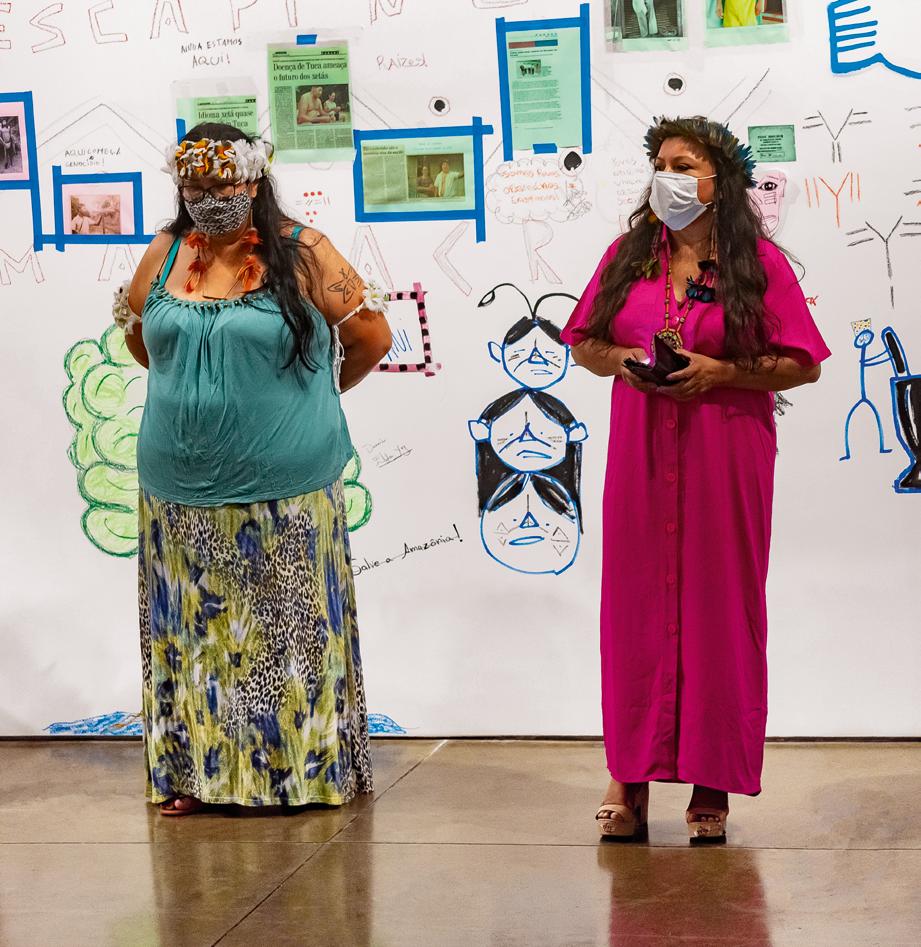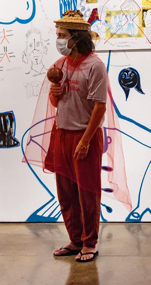 dos convidados indígenas em termos de caminhos possíveis a percorrer e formas de trabalhar. Por conta disso uma metodologia compartilhada era fundamental para viabilizar essa ação. Havia apenas algumas prerrogativas estabelecidas pela instituição: a primeira era que o projeto resultasse em algum tipo de produção que fosse compartilhada com o público, visando um largo alcance das reflexões geradas. As demais condicionantes diziam respeito ao prazo e orçamento — existia um montante com o qual o projeto deveria custear-se, sendo os artistas os responsáveis por definir como e quando empregar os recursos.