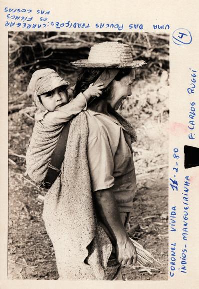 Povo Kanhgág, Paraná, Brasil. Sem título [Mulher carregando criança], década de 1980. Ao redor da imagem consta o seguinte texto: Uma das poucas tradições: carregar os filhos nas costas. Coronel Vivida, 11-02-80, Índios Mangueirinha. Fotografia.