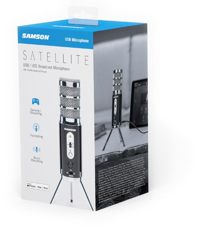 O Samson Satellite® é um microfone USB / iOS com qualidade de broadcast projetado para capturar áudio de alta definição em seu computador, iPhone ou iPad Ele oferece áudio de 24 bits / 96kHz, três padrões de captação selecionáveis e um design patenteado de perna dobrável altamente portátil Sua saída de fone de ouvido permite o monitoramento de latência zero, enquanto um botão de mudo auxilia ainda mais na sua gravação