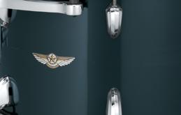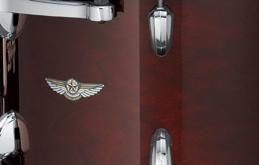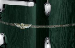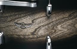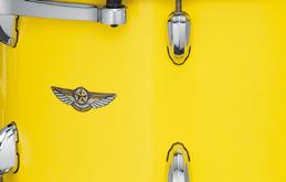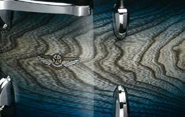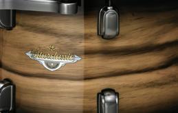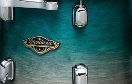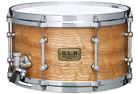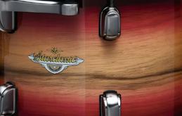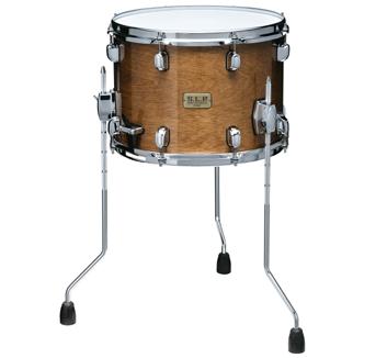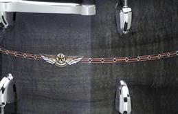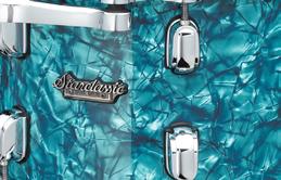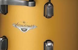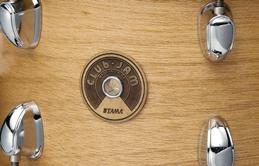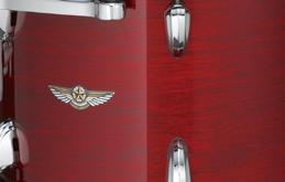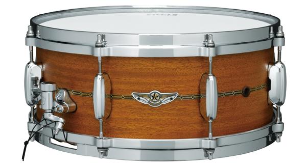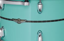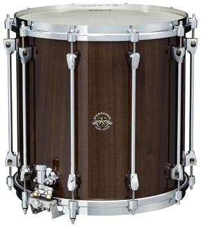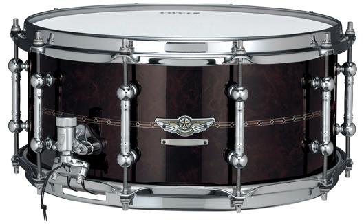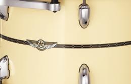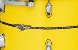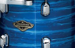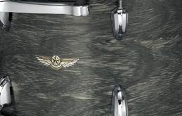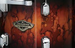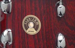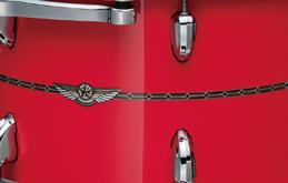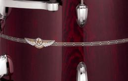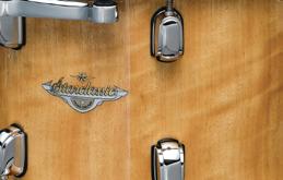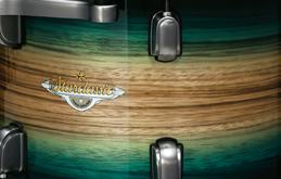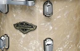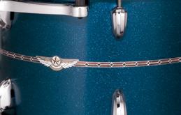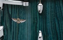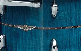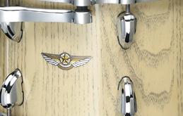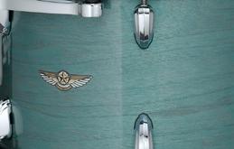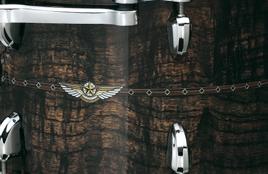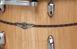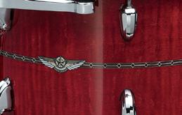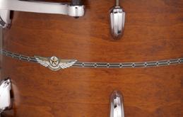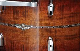 baterias com marchetaria (inlay) externa e aros do bumbo com o mesmo acabamento do tambor.