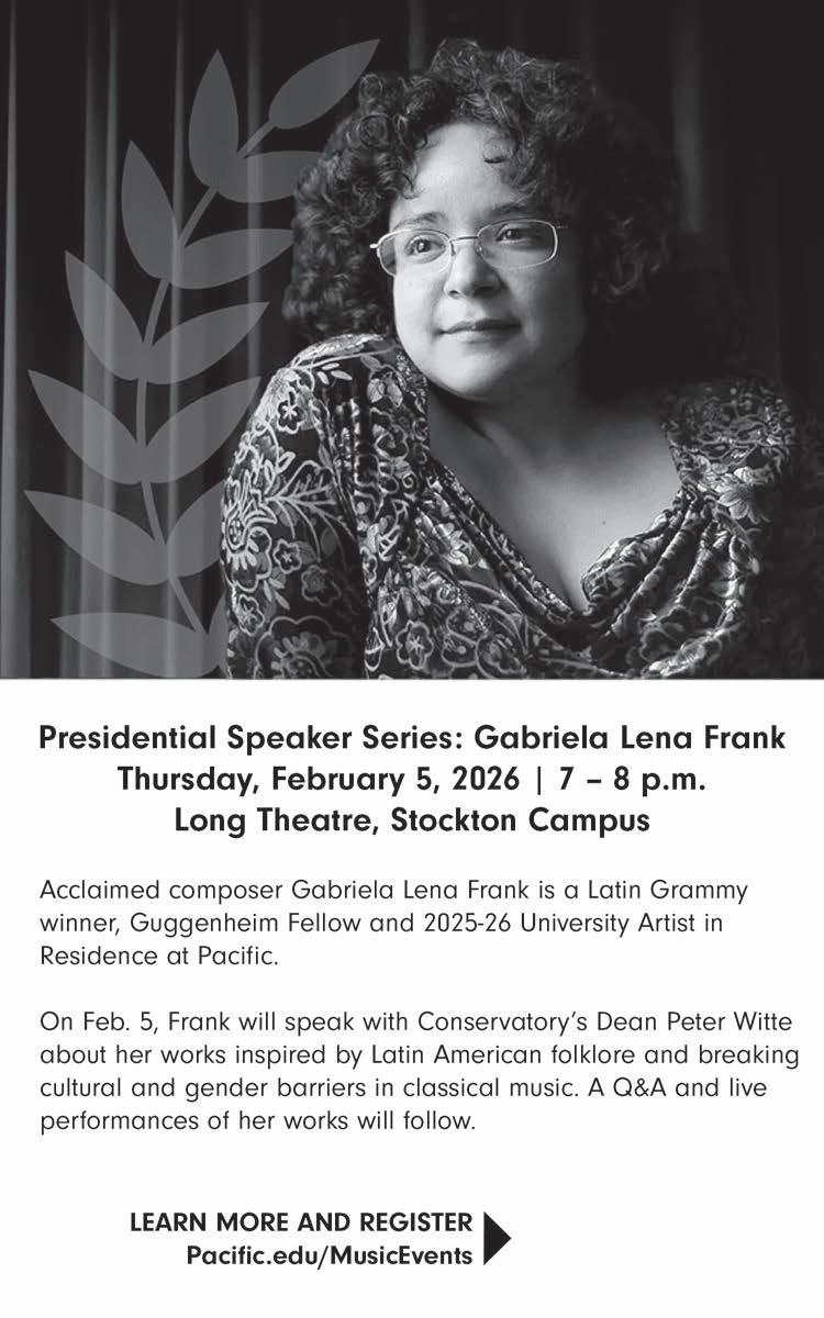 Musical America’s 2026 Composer of the Year, Gabriela Lena Frank, is University of the Pacific’s Artist-in-Residence for 2025–26. A Latin Grammy winner and Guggenheim Fellow, Frank is a northern California native. Written “for the citizens of Modesto, California past and present,” Frank’s composition from 2008 sets text by poet William Everson, also a northern Californian. San Joaquin celebrates the beauty of California’s Central Valley—a beauty that is sometimes overlooked. Pacific Singers will reprise San Joaquin as part of the Presidential Speaker Series with Gabriela Lena Frank on February 5 at Long Theatre, Stockton.