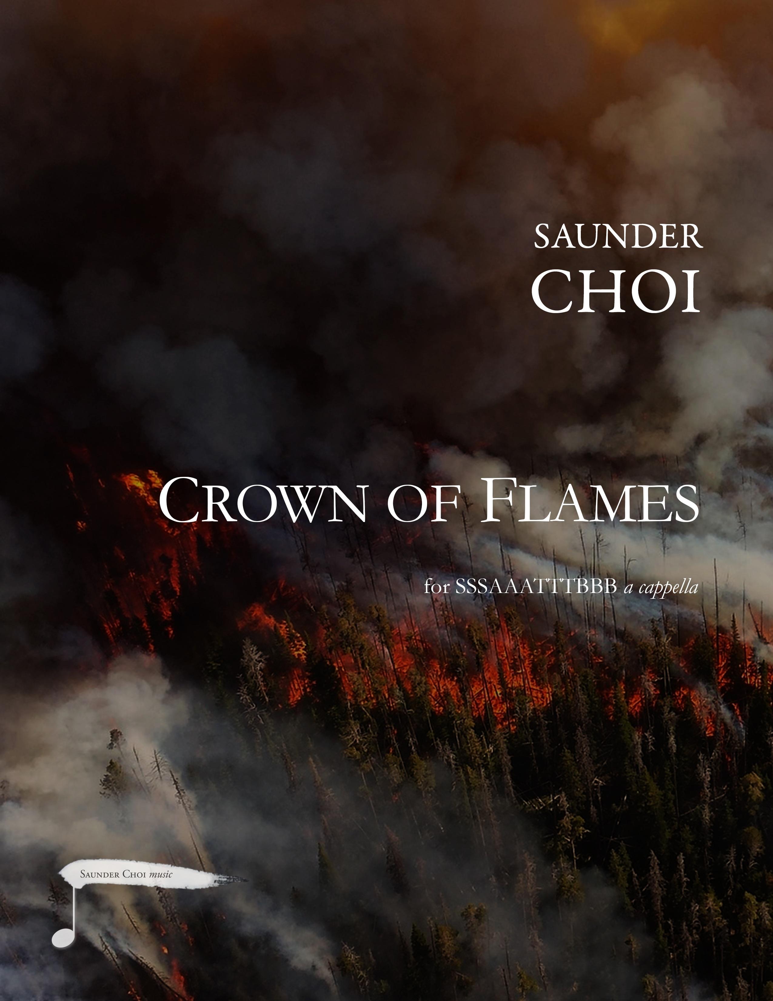 Crown of Flames is a work for 12-part mixed choir a cappella, and sets the text of Brian Sonia-Wallace on the themes of survival, adaptation, and renewal. Pyrophytes (from the Greek pyro = fire + phyte = plant) are plants that resist fire or even require it to propagate. Passive pyrophites have thick bark or insulating tissue, while active pyrophites produce flammable oils to help spread fires and so eliminate competing trees. The most extreme pyrophytes, knows as pyrophiles (“flame lovers”), require the extreme heat of fire for their seeds to start growing, breaking soil when all the surrounding vegetation and dead leaves have been burnt and they can access the forest floor’s scarcest resource — sunlight. Unlike forest birds and animals, which can flee fires, pyrophytic plants have adapted not only to withstand them, but to use them to their advantage.