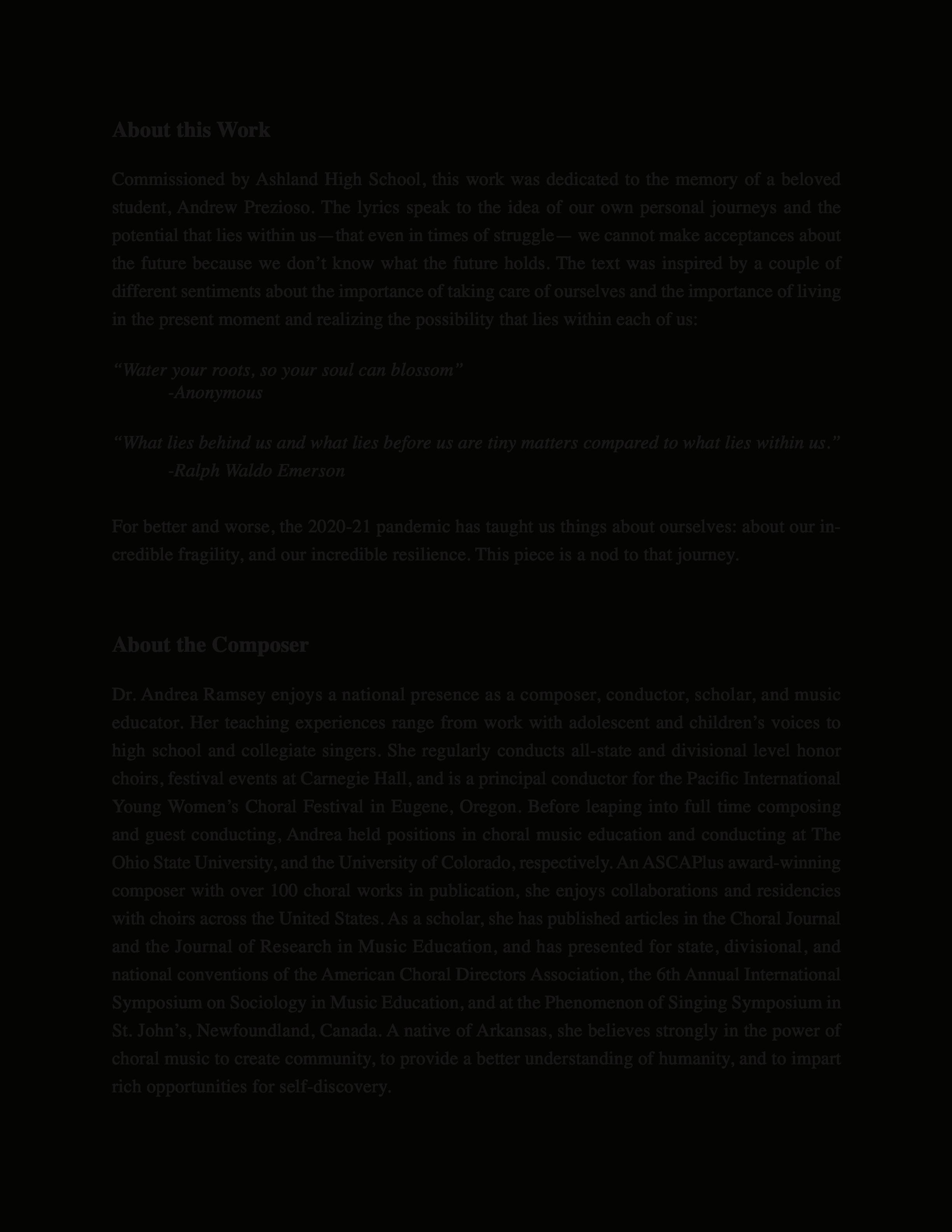 Commissioned by Ashland High School Choirs in honor of Andrew Prezioso Kimberly Wolbert, conductor.