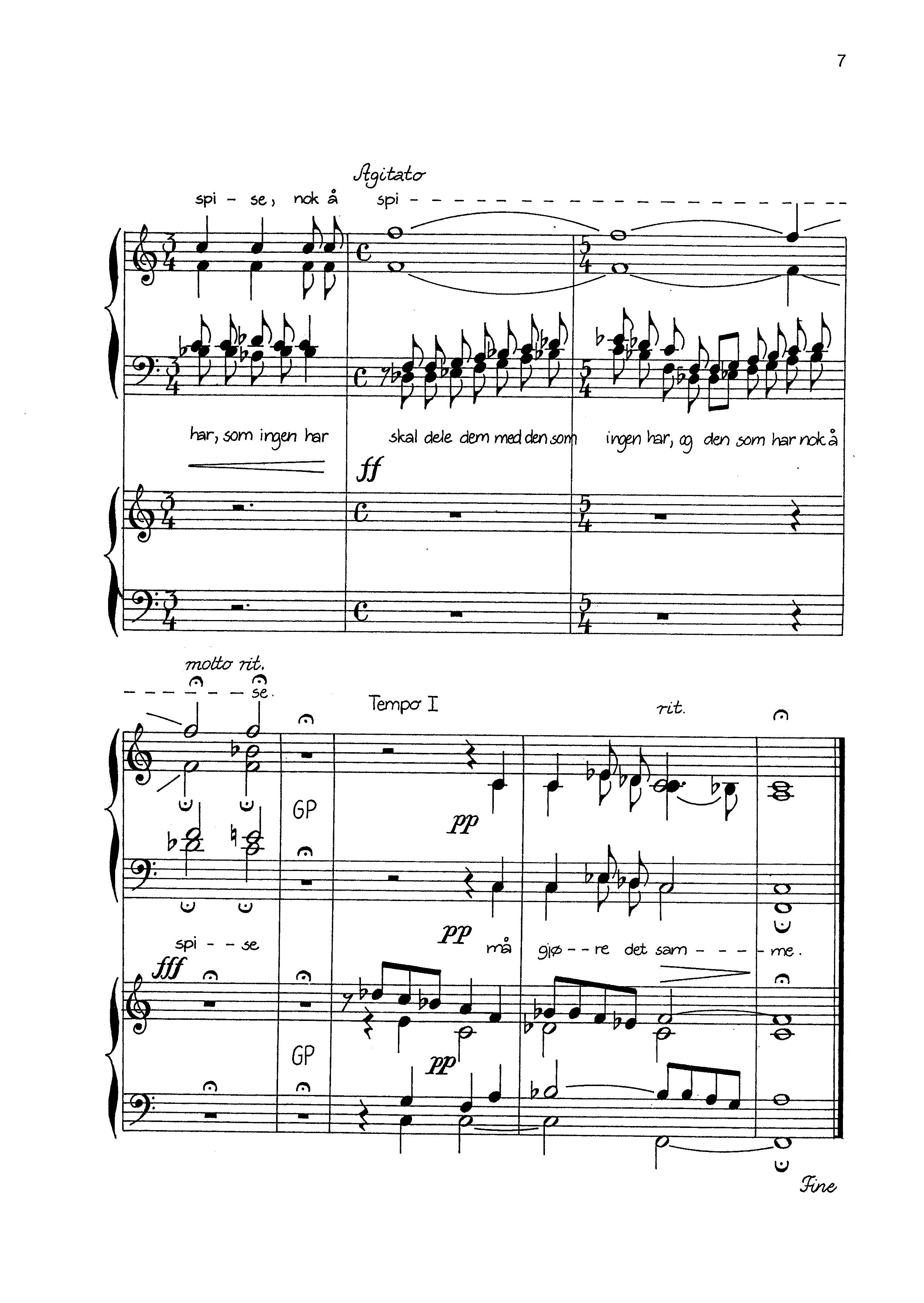 Satsene vil antagelig røpe en viss avhengighet av såvel engelsk katedralguds tjeneste som norsk religis folkesang. Mange av satsene deler korstemmene, opptil 8 stemmer, og er et bevisst forspk på å komme ut av den avhengighet til kvartparalleller som er typisk for norske motetter i 50- og 60-årene. Av den grunn fordrer også orgelsatsene innimellom bruk av “alle ti fingre og begge ben - samtidig”.