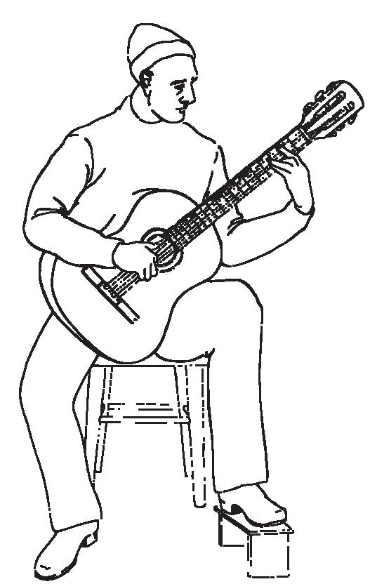 Dette betinger at du enten sitter på en stol (uten armlener) eller for eksempel ytterst på sofaen med bena i kryss. Noen foretrekker fotskammel (bok eller lignende) under venstre fot. Da får du gitarhalsen litt høyere opp, noe som vil lette selve spillet. Tommelen brukes som oftest kun som støtte bak på gitarhalsen (se ill.)