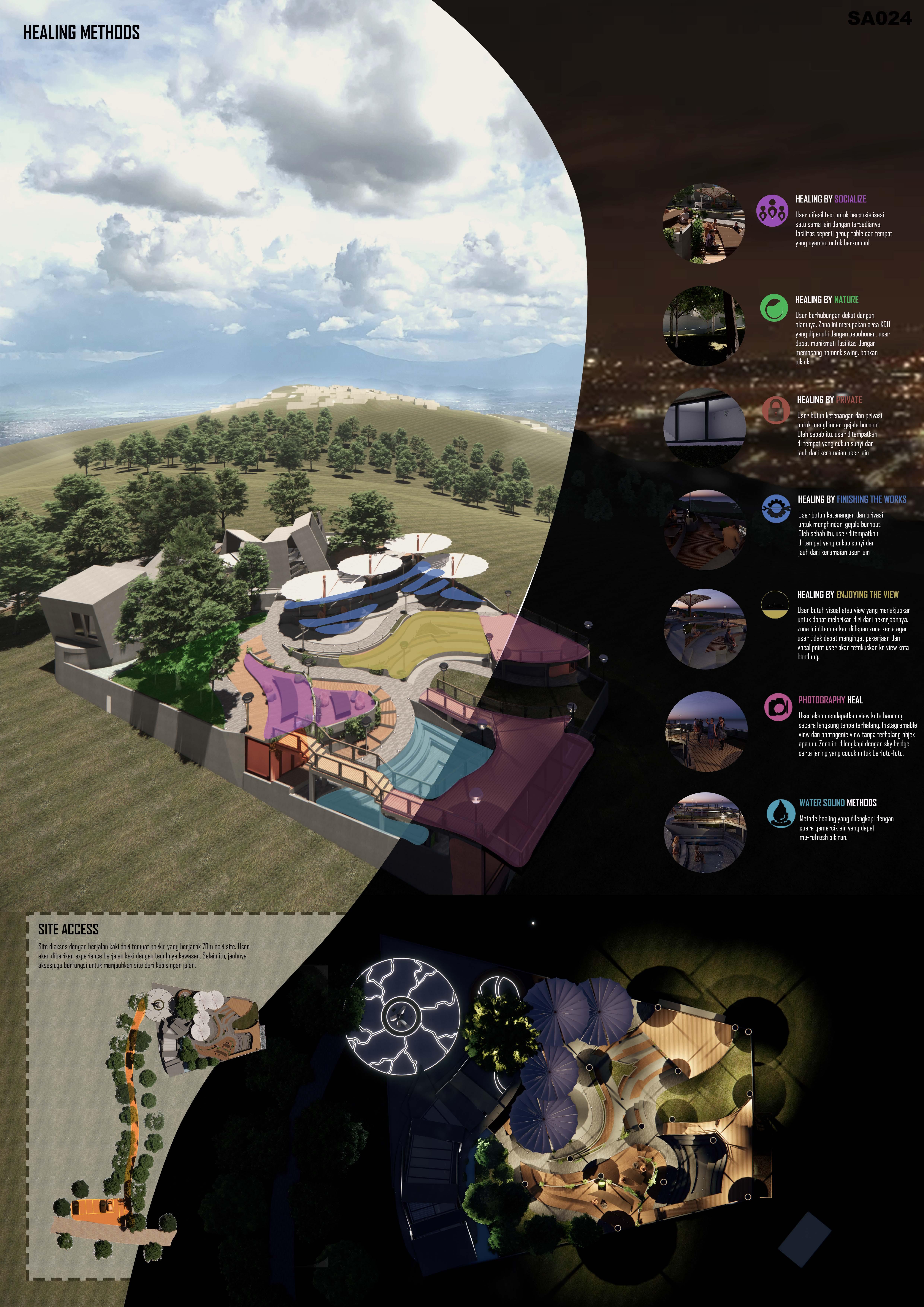 Healing Park Design Competition held by Vocational School Diponegoro University ----- Status: Competition Entry--- In collaboration with Fajar Abdillah, Rafi Yanwar Firdaus, and Yusuf Trisan Hermawan---- "The Last of Burnout" takes the concept and approach from the movie "The Last of Us," where the philosophy is that nature begins to take back the form humans have taken. Representatives of a prolonged domino effect can be seen in shelters that apply the concept of dominoes in architecture (irregular and messy forms).