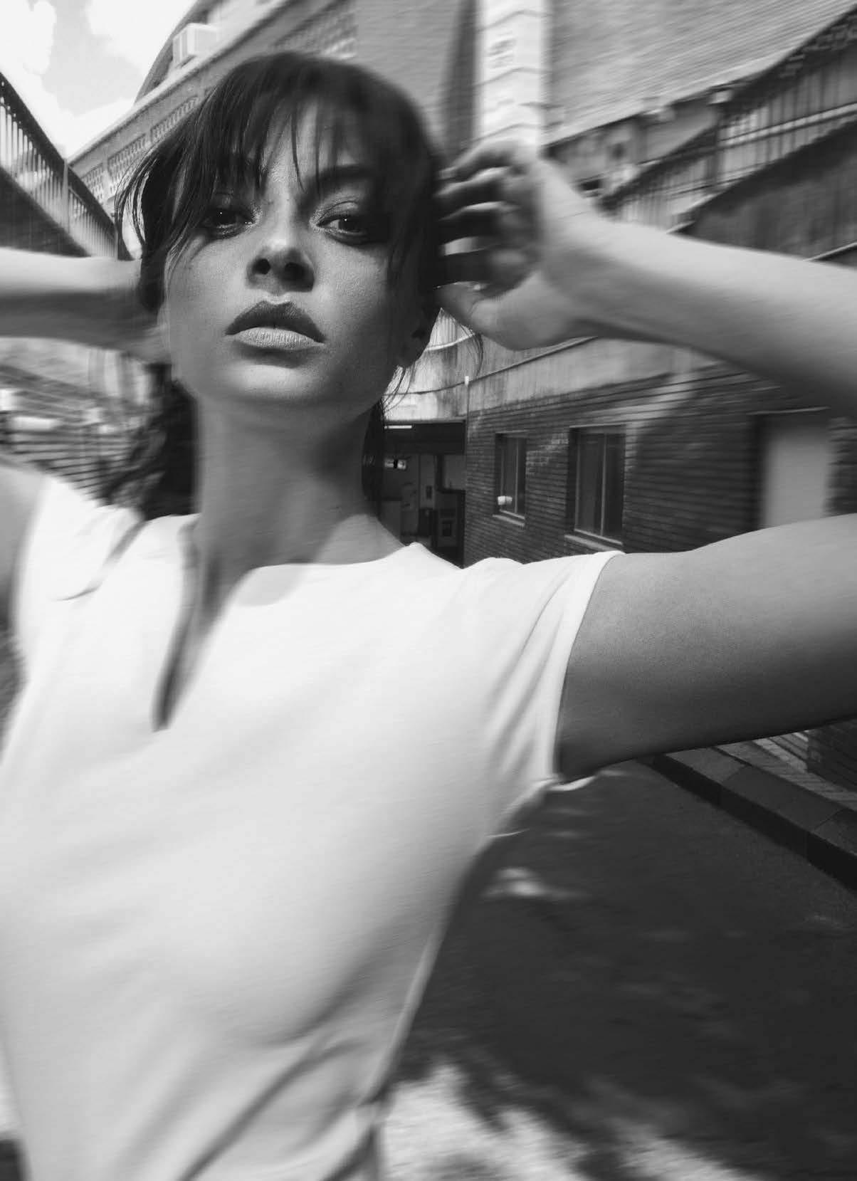Tubular short-sleeve t-shirt with 1x1 rib in 2-layer v-neck. Covered seams from shoulder to shoulder.