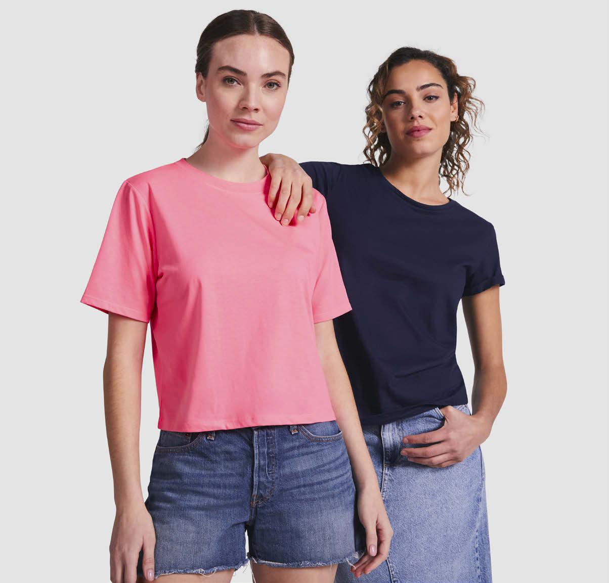 Thick short-sleeve t-shirt for women in cotton. Wide 2x1 ribbed crew neck and sleeve edging. Reinforced covered seams in collar. Side seams. Matching Roly logo on left side hem. Wide seam on hem.