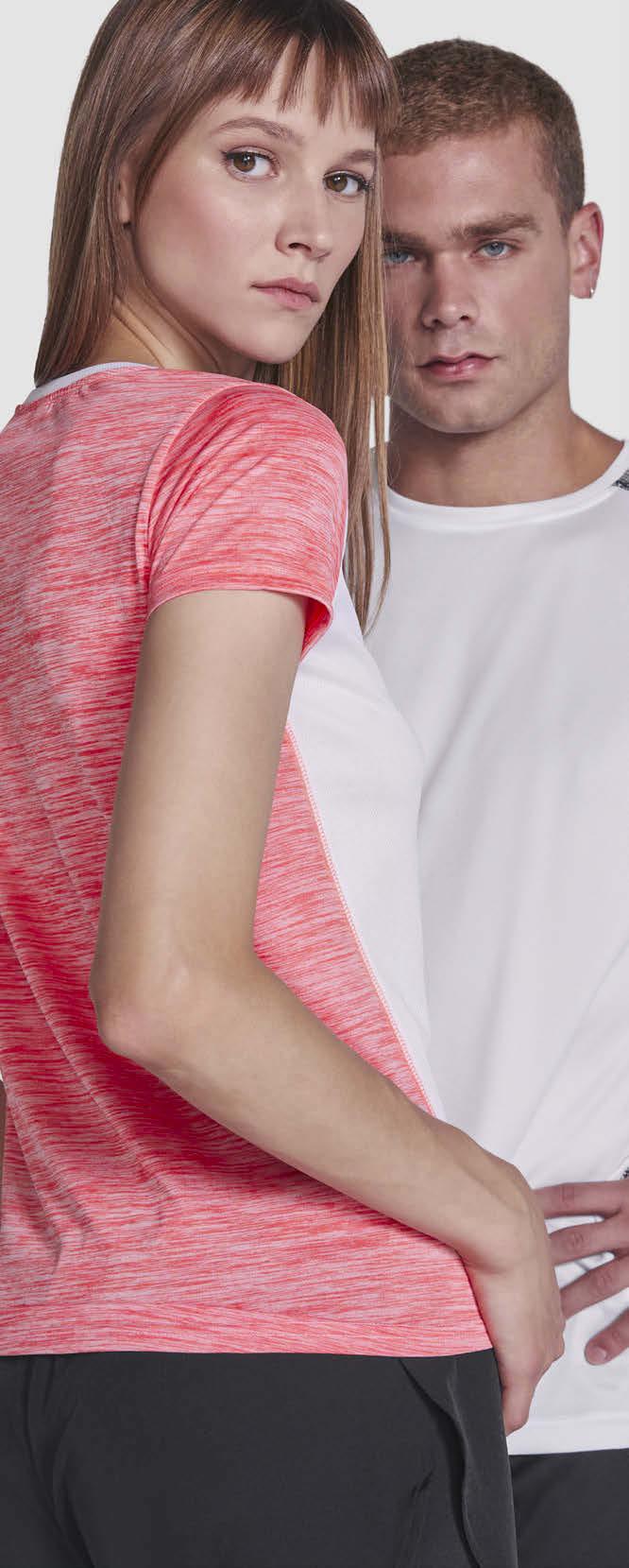 Short-sleeve t-shirt in inclined heather fabric. Crew neck in the same fabric and covered seams from shoulder to shoulder to contrast. Interior anti-chafing seams and side seams trimmed with adornment. Bottom side slits and pattern of the back slightly longer than the front. Side seams.
