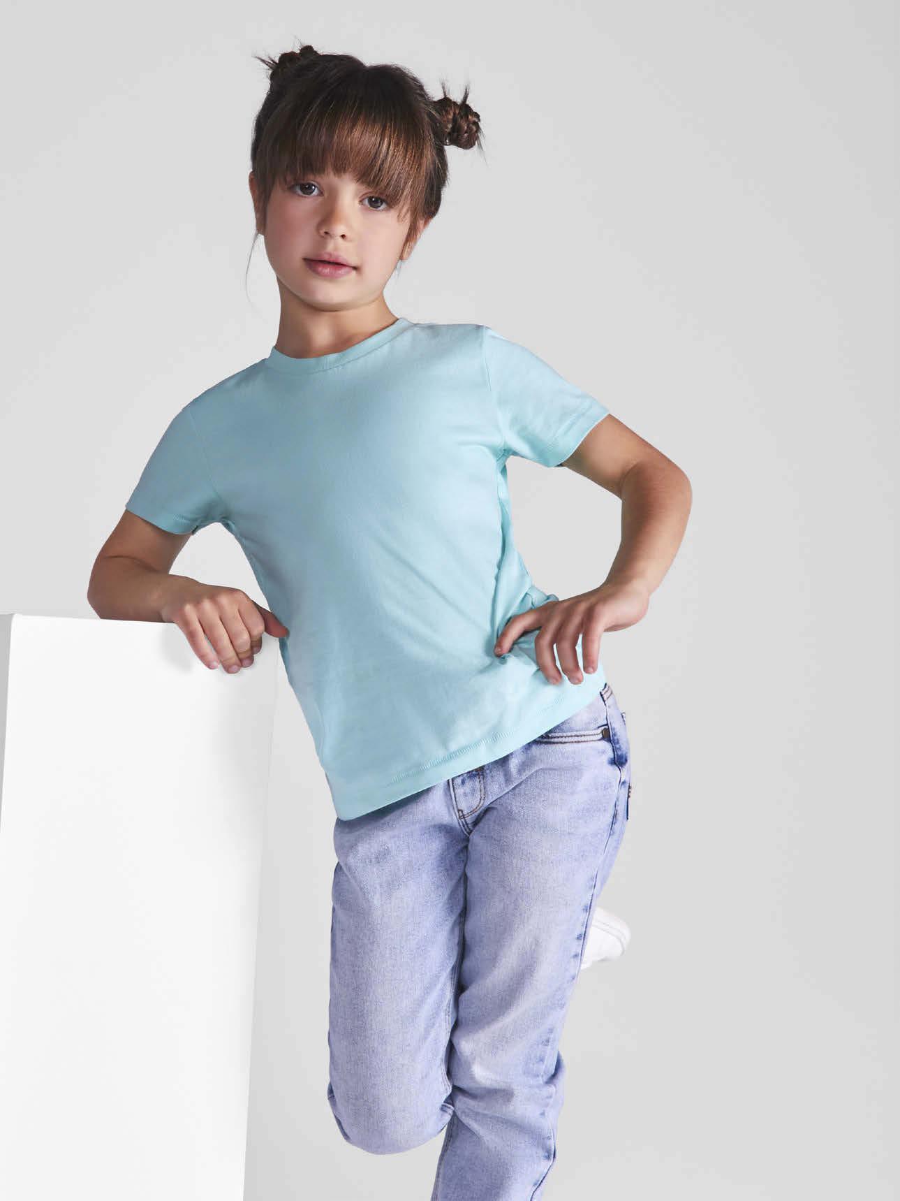 Tubular short-sleeve t-shirt. Crew neck with elastane. Side seams in kids sizes.
