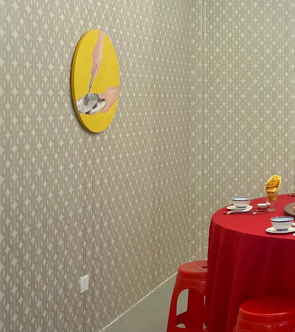 Perhaps, a feast might help. For Fan Chon’s exhibition, we created an installation inspired by a banquet. Fish is a recurring motif in his work, so I asked him: why fish? In his youth, his father would treat his family to lavish banquets in KL. Every aspect of a meal, from the restaurant’s decor to the plating of dishes, was imprinted on his mind. We recounted to each other the memorable feasts our younger selves had with our families at notable Chinese restaurants across the city. We thought about why something so simple as sharing a hearty meal with others can be so life-affirming. For his family, the ability to enjoy a sumptuous dinner was a sign that they’d made it. For mine, we stick through thick and thin by showing up at the dining table every evening.