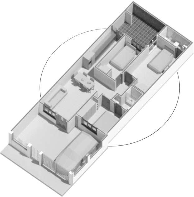 Otra de las estrategias que se estudió era generar aislamientos laterales para asegurar una correcta manipulación de los vientos de acuerdo a las necesidades del usuario, pero por razones de espacio no es fac ble ya que el área se vería reducida. Como una solución alterna a esto se opto por llevar a cabo un sistema de cubierta semiplana con inclinación considerable para ven lación cenital, dando paso a vientos cruzados, también se implementaría a este una cubiert verde para bajar la temperatura al interior de la vivienda y asi darle paso a la inercia térmica de la erra, dando sensación de frescura y así mismo también la implementación de la recolección de agua de lluvias por medio de bajantes, Como ul mo punto para la protección de la radiación solar y facilitar la ven lación natural, se propone un sistema de fachada como segunda piel en la vivienda y así evitar un gran consumo energé co., mediante celosías.