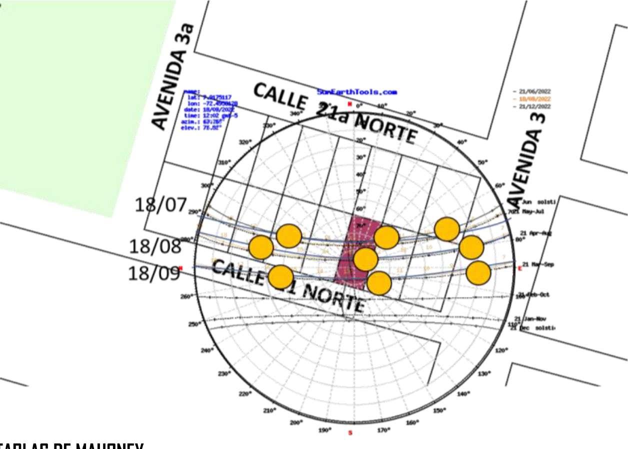 La vivienda segun Mahoney es a posicionada en una direccion sureste lo cual hace que la incidencia solar disminuya Edificios orientados siguiendo el ejes este oste, con el fin de disminuir la exposicion al sol Edificios con doble orien acion permi�endo una circulacion de aire in ermintente La vivienda cuen �po de distribucion que no f las circulaciones dentro de es a, asi mismo a las zonas que necesitan la luz solar de odo el día
