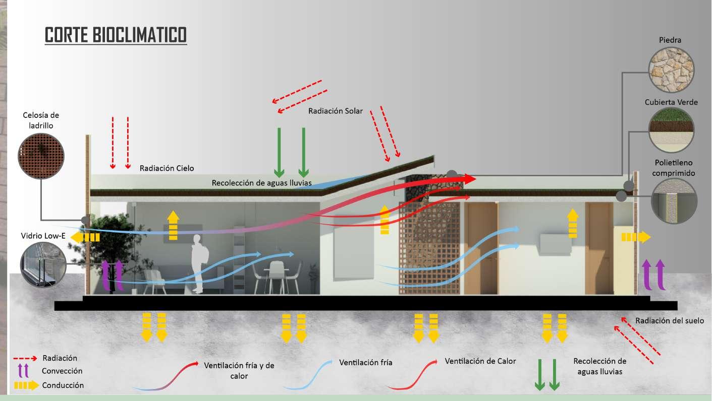 Se sustituyen materiales convencionales de alto calor especifico, como el porcelanato, la cerámica, el acero, por materiales como el concreto, la piedra, el ladrillo y La madera, los cuales permiten bajar las temperaturaoperativadelaviviendaporsuporosidad. Se implementaran materiales adicionales como aislantes térmicos en muros, y poliestireno expandido en el encuentro entre los muros y la cubierta, esto, para evitar puentes térmicos comunes. También se implementa el vidrio low-e de baja emisividad para fachada y ventanas, haciendo que ni los rayos uv ni el caloringresendirectamentealavivienda