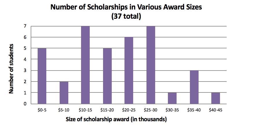 MVYouthscholarshipsareawardedbasedonbothmerit andneed Semifinalistsareselected basedonmerit,usingour evaluationcriteriatoidentify themost diligent,focusedand well-roundedstudents MVYouththencalculateseachstudent'sneed Fromthetotal Cost of Attendance(COA),wesubtract theEstimatedFamily Contribution(EFC)- afederal calculation that estimatesafamily'scapacity tosupport their child'seducation.Wethensubtract any financial aidastudent hasbeenofferedfromtheir school MVYouth'sawardsfill thefundinggap, providinglast-dollar fundingfor all four yearsof collegeor thefull lengthof theprofessional development trainingprogram Needisrecalculatedeachyear andtheawardsadjusted accordingly Thegraphbelow illustrateshow many scholarshipshavebeenawardedinvarious awardsizestothecurrent thirty-sevenrecipients.